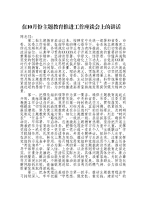 在10月份主题教育推进工作座谈会上的讲话同志们:第二批主题教育启动以来,按照党中央统一部署和省委、市委、区委工作安排,在指导组的精心指导下,全系统主题教育工作扎实顺利开展,各项规定动作正有力有序推进。我们切实提高政治站位,认真学习贯彻XXXXXX关于开展主题教育的重要讲话和重要指示批示精神,坚持读原著、学原文、悟原理,学懂弄通做实党的创新理论,持续在深化内化转化上下功夫,自觉用XXX新时代中国特色社会主义思想武装头脑、指导实践、推动工作。这次主题教育,时间紧、任务重、要求高。我们将深刻认识开展此次主题教育的重大政治意义、理论意义、实践意义,切实把思想和行动统一到党中央及省委、市委、区委决策部署上来,增强扎实开展主题教育的责任感使命感,主动加强沟通,科学统筹安排紧密结合实际,全力抓好落实,通过以学促干进一步激发跨越赶超的昂扬干劲,为加快推进高质量跨越发展提供强大精神力量。第一,把强化组织领导作为第一要务,确保主题教育高起点开局、高标准推进、高质量见效。中央和省委、市委、区委主题教育工作会议召开后,我单位第一时间传达学习、贯彻落实,明确提出切实做到高度重视、对标对表、直面问题、抓紧抓实、提质增效,努力使主题教育走在全区前列的目标要求。及时研究制定主题教育实施方案,细化主题教育任务清单,列出时间表任务书路线图,一级抓一级、层层抓落实,确保早动员、早部署、早启动,迅速掀起主题教育热潮。坚持把开展主题教育作为首要政治任务,把强化理论学习作为重中之重,发挥党组会-机关党委-党支部-党小组-党员个人五级联动学习机制作用,扎实举办读书班、开展专题研讨、抓好个人自学,在深化、内化、转化上聚力用劲,推动学习走深走实。注重发挥党组的示范表率作用,每月制定局党组和党组成员个人重点任务两张清单,举办为期一周的第一期主题教育读书班,推动领导干部带头学、深入悟、上台讲,以身作则带动主题教育走深走实。注重分类推进,坚持从实际出发,具体问题具体分析,着力检视整改、解决推动能力提升、作风转变、政策落地、为民办事等方面突出问题,不断提高推动高质量发展、服务群众、防范化解风险的本领,提振锐意进取、担当有为的精气神,全力推动高质量发展取得新成效。第二,把夯实理论基础作为第一抓手,推动主题教育理论学习持续深入。牢牢把握学思想、强党性、重实践、建新功的总要求,坚持把理论学习贯穿主题教育始终,持续在以学铸魂、以学增智、以学正风、以学促干上下功夫,不断创新方法载体,精心打造初心课堂、理论课堂、业务课堂、线上课堂、实践课堂确保学习时间更充分、学习内容更丰富、学习重点更突出、学习成效更显著,助力主题教育不断升温,深入推进。在全面学习上下功夫,学原文、悟原理,做到自觉主动学、及时跟进学、笃信笃行学、反反复复学,以理论上的清醒,确保思想上的清源和行动上的坚定,不断提高政治判断力、政治领悟力、政治执行力。坚持及时跟进学,XXXXXX发表的最新重要讲话、作出的最新重要指示批示,都要第一时间组织学习、深入领会、坚决贯彻,做到学习跟进、认识跟进、行动跟进。要把全面学习和重点学习结合起来,坚持干什么就重点学什么、缺什么就重点补什么,增强学习的针对性,努力提高学习实效。坚持真学真信真用、学懂弄通做实,学出政治忠诚,学出使命担当,学出实干精神,学出深厚情怀,学出斗争本领,学出清醒坚定,真切感悟党的创新理论的真理力量和实践伟力,使党的创新理论入脑入心,用党的创新理论凝心铸魂。第三,把深入调查研究作为第一课题,以问题为导向促进主题教育走深走实。全面落实XXXXXX调查研究深、实、细、准、效五字诀,紧扣主题教育、业务工作调研方向,领导班子成员带头领题调研各个党支部结合年度工作目标和重点任务开展调研扎实运用党的创新理论研究事业新情况、解决新问题。聚焦主责主业调研,多往项目一线去、多到背街小巷看、多与基层群众聊多朝田间地头跑,在贴地行走中摸清制约高质量发展的难点堵点焦点,列出问题清单,拿出对策性思考建议。紧盯调查研究事前、事中、事后三个环节,用好用活事关全局的战略性调研、破解复杂难题的对策性调研、新时代新情况的前瞻性调研、重大工作项目的跟踪性调研、典型案例的解剖式调研、推动落实的督查式调研等调研方法论。坚持把发现问题和解决问题有机结合起来,由表及里、由此及彼,推动解决一批发展所需、改革所急、基层所盼、民心所向的问题。第四,把推动工作发展作为第一目标,以主题教育成效推动业务工作高质量发展。把开展主题教育同推进中心工作相结合,把主责主业融入到全区经济建设建设大局,把为群众解决了多少问题、办了多少实事作为检验主题教育成效的关键标准,推动做到三个一,即检视一批问题、组织一次党性分析、制定一套整改清单,着力破难题、促发展、办实事、解民忧,以高质量的主题教育成