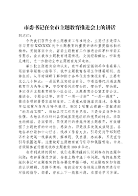 市委书记在全市主题教育推进会上的讲话同志们:今天我们召开全市主题教育工作推进会,主要任务是深入学习贯彻XXXXXX关于主题教育的重要讲话和重要指示批示精神,贯彻落实中央、省委主题教育工作推进会部署和市委工作要求,盘点我市主题教育进展情况,交流经验做法,听取意见建议,进一步推动全市主题教育走深走实。第二批主题教育启动以来,在市委的坚强领导和省委第八巡回督导组精心指导下,我市主题教育各项工作进展顺利、态势良好。从平时调研了解和刚才各单位发言情况来看,主要有这么几个特点:一是压紧压实政治责任。市委坚持把开展主题教育作为头等大事,市委常委同志带头抓、带头学、带头做,多次召开主题教育领导小组会议、主题教育办公室工作会议、座谈会、专题会议等,实行一周一计划一周一调度,推动各项部署要求落细落实。二是重点措施落实落地。各地各单位注重用好用足特色载体,制定5项重点措施一体推进的动态施工图,推动各项工作见行见效。三是分类指导针对性强。各地各单位针对各领域基层党组织和党员的特点,采取生动鲜活、务实管用、简便易行的措施开展主题教育,有效增强了主题教育的针对性、感染力。四是服务发展成效明显。各地各单位紧扣中心任务,找准工作着力点,引导党员干部到经济社会发展一线察实情、解难题、促发展、办实事。五是宣传引导氛围浓厚。注重做好主题教育宣传引导和氛围营造,中央、省级媒体宣传报道我市主题教育100多条次。在看到成绩的同时,我们也要清醒的认识到存在的差距和问题:在部署推进方面,存在上热中温下冷问题,有的基层党组织书记对主题教育的任务要求掌握不够,对主题教育如何推进认识模糊、思路不清晰;有的没有对各领域主题教育进行针对性的指导、部署,存在上下一般粗问题。在理论学习方面,在组织党员干部原原本本学方面用力不够,没有按要求学习必读书目,存在以专家辅导、举办读书班代替个人自学的现象;有的开展现场教学没有聚焦主题,将不相关的内容冠名为主题教育党日活动;还有的单位主要领导上党课准备不充分、质量不高,党课时间、参加对象等达不到要求。在调查研究方面,调查研究总体进度偏慢,有的调研方式比较单一,存在形式化、套路化或是书面调研倾向;有的重调查轻研究,推动调研成果转化、解决实际问题力度不够。在推动发展方面,有的党支部以学习计划代替工作计划,没有把服务发展、检视整改列入计划安排,没有做到一体推进,以学促干的成效不够明显。在整改整治方面,存在查摆问题数量偏少、一般化,目标没有量化,整改措施不够详实,缺乏可操作性;有的县(市、区)没有安排主要领导挂钩包案,整改整治工作还停留在纸面上、台账上,没有落地见效。在宣传氛围方面,整体氛围营造还不够,个别单位宣传内容未及时更新,宣传栏等没有主题教育内容,不规范使用宣传标语等。对以上这些问题,各地各单位要对号入座、举一反三,切实采取有效措施加以改进。下面,我就做好下一阶段主题教育工作,强调三点意见。一、提高政治站位,进一步把主题教育引向深入XXXXXX对主题教育始终高度重视,亲自谋划部署、亲自指导推动,为主题教育扎实有序开展提供了有力指引。近期,XXX先后到黑龙江、浙江、江西等地考察,对抓好主题教育提出明确要求。近段时间以来,中央、省委和市委对主题教育提出了一系列新部署新要求。我们要以高度的政治自觉、思想自觉、行动自觉抓好贯彻落实,努力走前头、作示范。要深入学习领会,全面对标对表,深刻认识到这项任务的重要性,切实以高度的责任感和使命感,推动主题教育走深走实,以实际行动坚定拥护两个确立、坚决做到两个维护。二、突出工作重点,进一步把重点措施贯穿始终一是理论学习要真学实悟、入脑入心。要聚焦关键少数。县处级以上领导班子和领导干部怎么开展主题教育,具有风向标作用。要把必学的内容学到位,通读研读党中央指定的学习教材,及时跟进学习XXXXXX最新重要讲话和重要指示批示精神。用好特色载体,防止浅表化、形式化,真正通过理论学习浸润心灵、滋润情怀。要把规定的动作做到位,县处级以上领导班子要在11月底前后完成读书班,各级党委(党组)每月要安排1次理论学习中心组学习,市直单位党委(党组)主要负责同志、各县(市、区)处级党员领导干部要上一次专题党课,并合理统筹其他党员领导干部上专题党课的时间、地点安排。特别是各基层党组织合理安排理论学习,重点学好党章、XX大报告、《专题摘编》三个方面内容,用好主题教育《应知应会》,依托三会一课、主题党日等,每月安排1次以上集中学习。主题教育期间,党组织书记要上一次专题党课,每名党员至少参与1次的交流研讨。同时,新经济组织、新社会组织、新就业群体和流动党员,是开展主题教育的难点所在。要通过视频讲座、网上党校、班前班后一刻钟学堂等群众喜闻乐见的方式,为这些党员参加主题教育提供便利。要进一步摸清三新组织中党员底数,具备