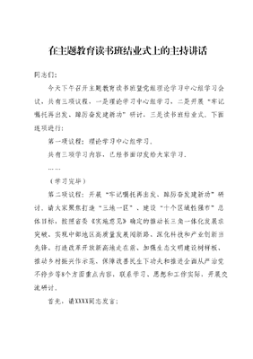 在主题教育读书班结业式上的主持讲话同志们:今天下午召开主题教育读书班暨党组理论学习中心组学习会议,共有三项议程,一是理论学习中心组学习,二是开展牢记嘱托再出发、踔厉奋发建新功研讨,三是读书班结业式。下面逐项进行:第一项议程:理论学习中心组学习。共有三项学习内容,已经书面印发给大家学习。……(学习完毕)第二项议程:开展牢记嘱托再出发、踔厉奋发建新功研讨。请大家聚焦打造三地一区、建设十个区域性强市总体目标,按照省委《实施意见》确定的推动长三角一体化发展求突破、实现中部地区高质量发展闯新路、深化科技和产业创新当先锋、打造改革开放新高地走在前、加强生态文明建设树样板、推动乡村振兴作示范、保障改善民生下功夫和推进全面从严治党不停步等8个方面重点内容,联系学习、思想和工作实际,开展交流研讨。首先,请XXXX同志发言;……(发言完毕)下面,请XXXX同志发言;……(发言完毕)下面,请XXXX同志发言;……(发言完毕)下面,请XXXX同志发言;……(发言完毕)刚才,XX位同志围绕省委八个方面,紧密结合工作实际进行了交流研讨,既谈了理论学习的认识和体会,又谈了贯彻落实的思路和打算。说明经过静心读原著、悉心悟原理、用心思道理,大家对XXX新时代中国特色社会主义思想有了更加全面系统的深刻理解,进一步提高了政治站位、拓宽了思维视野、碰撞出了思想火花,激发了工作干劲。在相互比学、相互借鉴中实现了学有所获、研有所得,起到了良好的学习效果。第三项议程:读书班结业式。主题教育开展以来,我们举办了专题读书班,分三个阶段,利用7天时间,集中开展了专题读书和研讨,这既是严格贯彻落实中央决策部署和省委、市委主题教育的规定动作,也是我们深入开展主题教育的重要安排。读书班期间,大家紧紧围绕学习贯彻XXX新时代中国特色社会主义思想这一主题,牢牢把握学思想、强党性、重实践、建新功的总要求,通过自学、集中研讨、专题辅导等方式,实现了深入而全面的系统学习,推动学习党的创新理论不断往深里走、往实里走、往心里走。这次读书班是一次以学铸魂的精神洗礼、一次以学增智的理论武装、一次以学正风的党性淬炼、一次以学促干的能力培训,达到了学习有厚度、研讨交流有深度、思想洗礼有温度的既定目标。具体来讲,有五个方面特点:一是体现了看齐意识。举办读书班既是主题教育的规定动作也是深化理论学习的重要举措。机关深刻认识举办读书班的重要意义,把理论学习摆在更加突出位置,秉承紧跟看齐的政治态度和立说立行的政治自觉,精心谋划、细心安排,以实际行动落实政治要求,用7整天的时间,扎实开展读书班活动,做到了中央和省委有要求、市委有部署,我们第一时间见行动。二是突出了关键少数。参加这次学习的都是县处级以上干部是机关干部中的关键少数,是主题教育的重点对象和中坚力量。大家克服工学矛盾,沉下心来认真学、静下心来深入悟,为机关全体党员开展主题教育学习带好头、作表率、立标杆,进一步推动主题教育扎实开展。三是强化了系统学习。读书班紧扣主题教育总要求,围绕学习贯彻XXX新时代中国特色社会主义思想,坚持全面深入的原原本本研读《XXX著作选读》(第一卷、第二卷)、《XXX新时代中国特色社会主义思想专题摘编》等学习资料,学习内容丰富全面。学习形式灵活多样,先后开展了观看视频资料、集中学习、专题研讨、参加市委举办的专题辅导报告等。四是体现了求真务实。同志们都非常重视和珍惜这次读书班始终以饱满的政治热情和良好的精神状态,积极克服时间紧、任务重的工学矛盾,认真学习体悟、深入交流研讨,沉下心来认真学习、深入思考,形成了良好的学习氛围,保障了学习时间和学习效果,展现了求真务实的优良学风。五是彰显了学用结合。通过举办读书班,达到了学有所获、学以致用的效果。对XXX新时代中国特色社会主义思想每学一遍,认识上就更加深刻、政治上就更加坚定、行动上就更加自觉。既学出了坚定的政治忠诚,对两个确立的决定性意义有了更加深刻的领悟,又学出了深厚的理论素养,对XXX新时代中国特色社会主义思想有了更加全面的把握,还学出了强烈的责任使命,对推动高质量发展有了更加坚定的信心,更学出了充足的工作干劲学习贯彻XXX新时代中国特色社会主义思想,是一项重大政治任务和长期战略任务,必须持续发力、久久为功。读书班结业只是一种阶段性工作的安排,形式上表现为学习的结束,但也是我们抓理论学习深化提升、抓主题教育深入推进的新开始。我们务必要持续在学懂弄通做实上下功夫、见实效,紧密结合岗位职责和具体工作深学笃行、狠抓落实,围绕主题教育各项举措,找准结合点,把学习成果转化为推动政协及机关工作高质量发展的强大动力。下面,我在再谈几点建议,与大家共勉。一要把学习成果转化为绝对的对党忠诚。对党绝对忠诚,是共产党人首要政治品格、根本政治要求。我们要紧密联系党的百年奋斗历程