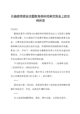 在县委常委会主题教育调研成果交流会上的主持讲话同志们:根据县委学习贯彻XXX新时代中国特色社会主义思想主题教育部署安排,今天我们召开县委常委会主题教育调研成果交流会,主要目的是将近期大家调研过程中发现的问题、提出的思路和解决的办法进行总结交流,用调查研究的成果指导实践、推动工作,并对下一阶段抓好主题教育各项工作任务再进行部署落实。今天市委指导组**副组长带队来**出席并指导会议,首先让我们以掌声表示热烈的欢迎。今天的会议共有四项议程,一是集中学习,二是调研交流,三是基层发言,四是总结讲话。首先进行第一项议程:集中学习《中共中央办公厅关于在全党大兴调查研究的工作方案》》,请**领学。……现在进行第二项议程:请县委常委班子成员依次围绕调研课题作交流发言。首先,由我先作调研交流。……以上是我的调研情况。现在,请**交流,大家依次进行。现在进行第三项议程:请**开展主题教育调研情况以及自身调研成果作汇报发言。……刚才,听了大家的调研成果,总体来看大家形成的调研报告总结情况全面、问题分析深入、对策建议有力,主要有四个方面的特点:一是选题精准。大家坚持问题导向,聚焦XX改革发展的关键点和薄弱处,聚焦具体工作中发现的重点问题和实际困难,聚焦群众关心关注的热点事项和难点问题,立足工作实际,精准明确课题,做到了调研课题与当前工作方向一致、目标一致、步调一致。二是措施得力。大家坚持实事求是,结合分管领域工作和平时掌握情况,紧紧围绕既定主题,沉下身子、直奔基层,坐下来认真倾听、走下去诚心访谈、静下心深入分析,达到了奔着问题去、带着成果回的目的。三是成果丰硕。大家围绕项目建设、生态环境、民生保障、社会治理等方面,从不同层面、不同角度进行分析和思考,形成了前瞻性、针对性、操作性强和富有深度的一批调研报告,提出了破解难题的实招硬招。四是作风务实。大家力戒形式主义、官僚主义,不打扰基层工作,不增加基层负担,与党员干部群众零距离接触,使调研过程真正成为了摸清家底、找准症结、理清思路、推动发展的过程。下面,我结合大家的发言,就做好下一步工作,再强调几点意见。一要不断深化理论学习教育。县委常委班子成员要不折不扣落实主题教育基本要求,认真抓好贯穿学习计划的落实,确保把学习教育贯穿始终的规定动作落实到位。要带头提高思想认识,聚焦主题主线,自觉加强自身学习教育,通过明确时间表、路线图,压紧压实责任,务必把抓好主题教育作为当前最重要的政治任务,不折不扣地抓紧抓实,把好主题教育质量关。二要切实做好调研成果转化。县委常委班子成员要带头突出成果运用,把总结经验、提炼做法贯穿调查研究全过程,找准破解难题的实招硬招新招,切实担负起把上级的决策部署落实下去、把各方智慧力量凝聚起来的政治责任,为科学决策、有效施策提供有价值的参考。要通过调查研究有效破解发展难题,对形成的调研报告进一步修改完善,切实找准同重点工作的切入点、结合点、突破点,真正做到对策提在需要时、措施想在关键处、思路用到发展上,在调查研究中解决问题、推动工作。同时,大兴调查研究之风,常态化制度化深入基层、深入群众、深入一线了解实情、分析矛盾、解决问题,着力推动调查研究工作走深走实。三要紧盯时间节点压茬推进。县委主题教育领导小组办公室已对近期全县上下开展的问题检视、整改落实等重点工作进行了安排部署,时间节点和举措要求已经十分具体,目标和任务已经非常明确,大家要在深入学习研讨和扎实开展调研的基础上,结合工作实际,统筹安排时间,讲好专题党课,并严格按照要求,认真梳理查找自身问题,形成检视问题清单,制定有力整改措施,从严从实抓好整改落实,确保主题教育有序有效扎实开展。四要扎实抓好问题整改工作。在检视问题过程中,县委常委班子成员要坚持问题导向,立足工作实际,做到检视问题全方位、查摆问题无死角。通过自己查、上级提、群众找的方式,查深、查实、找准自身存在问题,全面细致的列出问题清单,及早整改、快速整改。能即知即改的要立即整改到位,短时间内无法整改的要制定整改措施,明确整改时限、整改要求、整改目标,按步骤、有计划的逐项进行整改,确保整改工作扎实有效,让党员群众看到实实在在的变化。同志们,目前主题教育已经进入密集施工期,做好后半篇文章时间紧、要求高、任务重,大家要把开展好主题教育的政治责任扛稳扛牢,紧盯时间节点和重点任务,持续发力,扎实推进,把主题教育抓紧抓实,真正把开展主题教育的成效转化为XX经济社会各项事业发展的成果。今天的会议到此结束,散会。