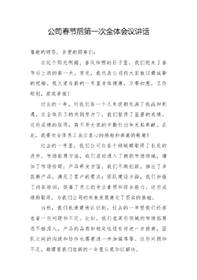 公司春节后第一次全体会议讲话尊敬的领导,亲爱的同事们:在这个阳光明媚、春风和煦的日子里,我们迎来了春节后上班的第一天。首先,我代表公司向大家致以最诚挚的祝福,祝大家在新的一年里身体健康,万事如意,工作顺利,家庭幸福!过去的一年,对我们每一个人来说都充满了挑战和机遇。在全体员工的共同努力下,我们取得了显著的成绩。这些成绩的取得,离不开大家的辛勤付出和无私奉献。在此,我要向全体员工表示衷心的感谢和崇高的敬意!过去的一年里,我们公司在各个领域都取得了长足的进步。市场拓展方面,我们成功进入了新的市场领域,增加了市场份额;产品研发方面,我们不断创新,推出了多款新产品,满足了客户的需求;团队建设方面,我们加强了内部培训,提高了员工的专业素质和综合能力。这些成绩的取得,为我们公司的未来发展奠定了坚实的基础。当然,我们也清楚地认识到,过去的一年里我们还存在着一些问题和不足。比如,我们在某些领域的市场拓展还不够深入,产品的品质和稳定性还有待进一步提高,团队之间的沟通和协作也需要进一步加强等等。这些问题和不足,都需要我们在新的一年里认真加以解决。展望未来的一年,我们将面临更多的机遇和挑战。为了实现公司的长远发展目标,我们必须制定科学合理的发展计划。今年的工作重点主要包括以下几个方面: 一、市场拓展我们将继续加大市场拓展力度,深入挖掘潜在客户需求,扩大市场份额。同时,我们将加强与合作伙伴的沟通与协作,共同开拓更广阔的市场空间。为了实现这一目标,我们需要进一步完善市场调研机制,深入了解客户需求和市场动态;加强营销团队的建设和培训,提高营销人员的专业素质和销售技巧;加大品牌宣传和推广力度,提高品牌知名度和美誉度。二、产品研发我们将持续投入研发资源,加强技术研发和创新能力。通过引进先进技术和管理经验,优化产品结构和性能,提高产品的竞争力和附加值。为了实现这一目标,我们需要进一步完善研发管理体系和技术创新机制;加强技术人才队伍建设和培养;加大科研投入力度和技术引进力度。三、团队建设我们将继续加强团队建设,完善人才培养和激励机制。通过举办各类培训活动和学习机会,提升员工的综合素质和业务水平。同时,我们也将关注员工的成长和发展,为员工提供更多晋升机会和福利待遇。为了实现这一目标,我们需要进一步完善人力资源管理制度和绩效考核体系;加强员工职业发展规划和培训计划;优化薪酬福利制度和激励机制。四、企业文化建设我们将积极推动企业文化建设,营造良好的企业氛围。通过举办丰富多彩的员工活动和企业文化宣传活动,增强员工的归属感和凝聚力。同时,我们将倡导诚信、创新、务实的企业精神,激发员工的创造力和创新活力。为了实现这一目标,我们需要进一步完善企业文化体系和传播机制;加强员工对企业文化的认同感和参与度;推动企业文化的落地生根和开花结果。 五、社会责任履行作为一家有社会责任感的企业,我们将积极参与社会公益事业和环保行动。通过捐款捐物、志愿服务等方式回馈社会,展现企业的良好形象和社会价值。同时,我们将严格遵守国家法律法规和行业规范,确保企业的可持续发展。为了实现这一目标,我们需要进一步完善社会责任管理体系和公益活动策划机制;加强与社会公益组织和环保机构的合作与交流;推动企业在社会责任方面的创新与发展。在新的征程中,我们要坚定信心、勇往直前。我们要紧密团结在公司领导班子周围,齐心协力、共创辉煌。让我们携手共进、砥砺前行,为实现公司的宏伟目标而努力奋斗!最后,再次祝愿大家在新的一年里事业有成、家庭幸福!谢谢大家!