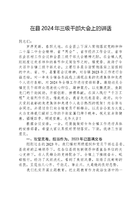 在县2024年三级干部大会上的讲话同志们:岁序更新,春回大地。在全县上下深入贯彻落实党的和和二十届二中全会精神、省两会、省市经济工作会议、省市农业农村工作会议和全县三级干部大会精神之际,在全镇人民刚刚度过欢乐祥和的春节和元宵佳节之时,镇党委、政府于今天召开全镇三级干部大会,主要任务是全面贯彻落实上面提到的中央、省、市、县重要会议精神,对全镇2023年工作进行全面总结,对一年来全镇各条战线上涌现出来的先进集体和先进个人进行表彰,对2024年全镇工作进行安排部署,激励动员全镇党员干部群众迅速收心归位、凝神聚力,以龙腾虎跃、鱼跃龙门的干劲闯劲,开拓创新、拼搏奉献,在深入践行千万工程走前列作示范。借此机会,我首先代表县委、政府,向今天受到表彰的先进集体和先进个人表示热烈的祝贺!向全体与会同志,并通过你们向全镇党员干部群众,以及舍小家为大家、大力支持我们做好工作的干部家属们拜个晚年,祝大家身体健康、福暖四季、顺遂安康、龙年大吉!根据会议安排,一会,还要就做好今年全镇工作进行具体的安排部署,希望大家认真抓好贯彻落实。下面,我讲三方面意见。一、攻坚克难,担当作为,2023年已圆满交卷刚刚过去的2023年,我们镇村两级组织和党员干部在县委、县政府的正确领导下,在各位县级包联领导和县直各单位的关心支持下,在人民群众的支持配合下,全镇上下接续奋斗、砥砺前行,经历了风雨洗礼,看到了美丽风景,取得了沉甸甸的收获,呈现出人心齐、干劲足、事业兴、大局稳的良好态势。我们扎实开展主题教育。把主题教育作为政治生活中的一件大事。高频率开展理论学习。镇党委和19个党支部共开展集体学习4次,领学、自学160余次,撰写讨论交流材料400余人次,开展讨论交流120人次,发放主题教育相关书目800余本,上门送学120人次,引导流动党员从通过学习强国、共产党员网等平台学习900余人次。高标准建言献策。聚焦全面贯彻落实党的精神,重点围绕12个方面内容,组织党员深入群众听民意、访民情、解民事,共收集实施具有针对性和可操作性的意见建议32条。高质量推动发展。结合主题党日、新时代文明实践活动,组织开展志愿服务活动20余次。设立党员先锋岗88个,划分党员责任区87个,引导党员承诺践诺1845条,办理民生实事63件。高效率检视整改。聚焦党中央关心关注的问题、影响制约高质量发展的问题等6个重点问题,从小切口出发,建立问题清单,确定问题18个,督促18个科级干部对口认领,逐一销号,目前全部完成整改。督促19个党支部自查自改,完成问题整改25条。高水平建章立制。坚持边实践边总结,完善了机关值班制度、请销假制度以及各村环境卫生整治等制度。我们切实加强党的建设。我们坚持把加强理论学习作为基层党员的必修课,将学习贯彻新时代中国特色社会主义思想贯穿始终,充分运用党委理论中心组学习、三会一课、支部主题党日、新时代文明实践活动等载体,系统学习党的精神、二十届二中全会精神、3次视察山西重要讲话重要指示精神、省市县两会等重要会议精神,不断强化政治理论学习,筑牢信念信仰之基。共开展党委中心组学习21次175篇、主题党日活动12次,各党支部开展三会一课680余次,开设党建微课堂12期。督促班子成员严格落实一岗双责,压实包村责任,督促包村干部对包联村的党建、乡村振兴、产业发展、安全生产等工作加强督导。完成83名村两委班子成员的届中分析研判工作,并根据各村存在问题加强整改。继续推进16个村党群服务中心规范化提升。高庄村按照一墙两站六室两中心标准化规范化提升党群服务中心,乡村示范村建设正在加紧进行,软弱涣散基层党组织整顿成效明显,支部软实力持续增强。七一开展一次书记讲党课、一次走访慰问等九个一系列活动,献礼中国共产党成立102周年。农村支部每月标准化完成12个月的党员积分评定,激发党员干事热情。拓宽后备干部选拔途径,进一步优化年龄和学历,共储备后备干部41名。严把发展党员入口关,发展党员7名,培养发展对象2名,同时严把组织关系转接关,加强68名流动党员和46名年老体弱党员管理。村级集体经济30万元以上的8个(曹王岭、高城、贾村、上治、永乐、双泉、五马岭),16个村全部完成20万元的目标。把意识形态工作与党的建设紧密结合,切实把党的政治纪律和政治规矩摆在首要位置,严格落实意识形态责任制,召开意识形态分析研判会议4次,做到了四个同步。我们全力推进乡村振兴。深入贯彻县委、县政府两强三美部署要求,牢牢把巩固脱贫攻坚成果与乡村振兴有效衔接责任抓在手上,扛在肩上,积极学习借鉴千万工程经验做法。镇党委、政府加强统筹调度,每月及时下发《工作要点》进行指导;组织召开乡村振兴专题会、政策培训会26次,有效提升驻村队伍整体素质;强化督导检查,加强驻村工作队和第一书记管理,加强