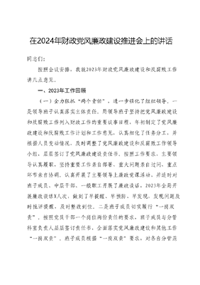 在2024年财政党风廉政建设推进会上的讲话同志们:按照会议安排,我就2023年财政党风廉政建设和反腐败工作讲几点意见。一、2023年工作回顾(一)全力狠抓两个责任,进一步强化了组织领导。一是领导班子认真落实主体责任。局领导班子坚持把党风廉政建设和反腐败工作列入财政工作的重要议事日程,年初制定了党风廉政建设和反腐败工作计划和工作意见,认真细化了任务分工,并根据人员变动情况,及时调整了党风廉政建设和反腐败工作领导小组,层层签订了党风廉政建设责任书。按照工作要求,主要领导认真履职,坚持重要工作亲自部署、重大问题亲自过问、重点环节亲自协调。认真开展了主要领导上廉政党课活动,并适时对班子成员、中层干部、一般职工开展了廉政谈话,2023年全局开展廉政谈话X人次,做到了早提醒、早预防、早发现,发现问题及时批评提醒,及时整改到位。二是班子成员切实履行一岗双责。按照党员干部一个岗位两份责任的要求,班子成员与分管科室负责人层层签订责任书,全面落实党风廉政建设和其他工作一岗双责。班子成员根据一岗双责要求,对各自分管范围内的党风廉政建设和反腐败工作进行了安排部署,定期或不定期地督促、检查工作落实情况,实行了常态化、规范化、标准化管理;在教育、管理家庭成员和分管科室工作人员方面,做到了从严教育、严格管理,坚决杜绝了各类违法违纪和不廉洁行为的发生;在执行重大事项、重要情况报告方面,做到了重要情况及时报告、重大问题及时处理。(二)全面提高思想素质,进一步强化了廉政教育。为了全面提高干部职工的思想素质,我局把党纪教育作为廉政教育重要内容之一,组织干部职工学习了新《廉洁自律准则》和《纪律处分条例》,广泛提高了党员干部的廉政意识;在七一建党节组织全体党员开展了重温入党誓词活动,进一步增强了党员的宗旨意识、服务意识和创先争优意识;在开展以案促改警示教育活动中,组织科级以上党员干部学习了警示教育读本,全面警示干部职工时刻牢记为民、务实、清廉要求,思想素质得到了进一步提升。(三)全面健全监督体系,进一步强化了惩防建设。一是全面深化惩防体系建设。认真贯彻落实工作任务,细化财政部门任务分工表,将任务层层分解到班子成员和相关科室,积极协助牵头单位完成各项工作任务。二是大力推进民主决策监督。严格执行三重一大集体研究制度,始终坚持重大决策、重要人事任免、重大项目安排、大额度资金运作事项必须由领导班子集体决定,并坚持主要领导末位发言制度,做到了班子内部充分发扬民主,集体讨论作出决定,切实增强了决策的民主性和科学性。三是全面强化内部监督检查。为了进一步规范财政管理,促进各科室切实履职尽责,对农业科、国有资产管理办公室重点股室进行了全面监督检查,通过内部监督,进一步强化了财政管理,促进了廉政建设。四是全面深化廉政风险防控。在廉政风险防控方面从领导干部到一般工作人员,每个人都结合所在岗位的工作职责以查找岗位风险、业务流程风险、单位风险为突破口,认真了查找个人岗位廉政风险和科室廉政风险,有效防范廉政风险。五是认真坚持廉政谈话。针对重点科室、重点岗位、重点时段,适时组织开展了廉政谈话;同时加强对干部职工在重大节假日、岗位调整、项目监管等方面的提醒,提高了财政干部廉洁自律自觉性(四)全面狠抓作风建设,进一步提高了队伍素质。一是全面加强作风建设。按照中央八项规定和各级作风建设相关规定,我局大力压缩三公经费,全面厉行节约,反对铺张浪费修订了《新城区机关单位差旅费管理办法》、《新城区机关培训费管理办法》,从严控制各类会议、培训开支,进一步规范公务接待,有效制止了各种铺张浪费行为,全面强化了干部作风建设二是开展了大走访行动。组织全局党员干部分组,到联系的李庵村开展集中大走访行动,共走访了X户,收集建议意见X条,解决合理诉求X个,调解群众纠纷X件,收到了很好的效果,也锻炼了队伍。(五)全面狠抓正风肃纪,进一步开展了整治活动。一是开展了私设小金库及滥发钱物问题专项整治检查。二是开展了涉农资金专项检查,对涉农专项资金进行全面核查。我局的党风廉政建设和反腐败工作都取得了较好的成绩,但我们也要清醒地看到,问题和不足仍然存在:一是作风建设还需加强;二是廉政教育方式简单;三是常态化监督还做得不够好。针对这些问题,我们将在今后的工作认真加以改进和完善。二、2024年工作意见2024年,我局将认真贯彻落实中央、省、市、区会议精神,以务实创新的态度,扎实过硬的作风,高效快捷的方法,持续、健康、有序推进党风廉政建设和反腐败工作。重点抓好以下六个方面的工作。(一)深入落实两个责任。随着反腐败体制的不断深入领导班子面临当前的新形势,认真落实两个责任意义更加深远,任务更加艰巨。领导班子应从主体结构、责任内容、主体能力三个方面,认真落实主体责任,特别是班子成员应当根据工作分