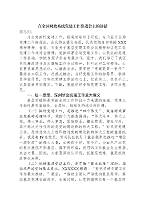 在全区财政系统党建工作推进会上的讲话同志们:为全力抓好党建工作,经局领导班子研究,今天召开全局党建工作推进会。会议的主要任务是,认真贯彻落实党的XXX精神精神、省委、市委关于基层党建工作会议精神和区党工委党建工作推进会精神,安排部署全局党建工作,以坚实的党建工作基础,加快X经济社会发展步伐。刚才,我们学习了我区党风廉政建设及反腐败工作会议精神。针对这些工作安排,大家要提高思想站位,认清出发点,要牢记党建是第一责任要结合本职工作,把握关键点,当好党建工作的指导员、联络员和宣传员,切实把党建工作放在心上、扛在肩上、抓在手上,认真抓好贯彻落实。下面,我就抓好全局党建工作,讲四点意见。一、统一思想,深刻领会党建工作重大意义基层党组织是党的全部工作和战斗力来源的基础,党建工作始终具有基础性、全局性、战略性的地位和作用。(一)抓好党建工作,是推进四个伟大、服务财政事业发展的关键环节。党的十九报告强调:伟大斗争,伟大工程,伟大事业,伟大梦想,紧密联系、相互贯通、相互作用,其中起决定性作用的是党的建设新的伟大工程。而抓好党建工作,是推进伟大工程即推进党的建设新的伟大工程的重要抓手。我局有18名党员,党员队伍抓好了就会凝聚起推动建设一流财政的强大力量,如果抓不好、管不严,全面从严治党的要求就沉不到基层、落不到终端,我们的工作就会失去根基、失去力量。因此,大家要深刻认识到,抓基层党建,就是抓财政事业发展。(二)抓好基层党建工作,是贯彻最大政绩理念、推动从严治党的基本要求。XXXXXX强调:要把抓好党建工作作为最大政绩。要求:推动全面从严治党向基层延伸,推动基层党建全面进步、全面过硬,让党的旗帜在每一个基层阵地都高高飘扬。XXX这些重要论述,是XXX党建思想的重要组织部分,为我们谋划推进全局党建工作提供了强大思想武器和根本遵循。因此,抓好党建工作,就是贯彻最大政绩理念、推动从严治党最基本的要求。但从目前情况看,个别党员干部还未完全树立抓好党建是最大政绩的理念,全面从严治党的理念还未入脑入心,在思想认识和实际工作中还存在一些问题。有的不能从巩固党的执政地位的大局看待党建工作,没有真正理解抓好党建是最大政绩的要求;有的不能正确处理抓党建与抓本职工作之间的关系,不善于通过抓党建凝聚共识、激发动力,引领推动本职工作;有的抓党建工作严一阵、松一阵;有的安排部署多,督查问责少,工作落实不下去,等等。解决好这些问题,都需要各部门负责人和党员干部进一步强化在党言党、在党忧党、在党为党意识,切实担负起管党治党的重大责任,用心用力抓好党的建设。(三)抓好党建工作,是推动全局各项工作的坚实保障。改革开放以来,党中央反复强调中国的事情,关键在党。实践也已经证明,我们做好一切工作,都要从加强党的建设抓起。同样,我局要实现财政工作目标,抓好基层党建工作是基础、是保障。只有通过从严治党,才能压实责任;只有通过建强组织,才能巩固和提升党组织战斗堡垒作用;只有通过充分发挥党员模范作用,才能引导党员干部勇于担当、敢于作为,冲在一线、干在一线,奋勇争先地完成财政工作任务。二、明确目标,不断提升党建工作整体水平党的XXX强调:中国特色社会主义进入新时代,我们党一定要有新气象新作为。要围绕解决基层党组织弱化、虚化、边缘化问题,不断强化政治建设、思想建设、组织建设、作风建设、纪律建设,把制度建设贯穿其中,着力打造五度党建,即:(一)打造有深度的党建。以开展XXX新时代中国特色社会主义思想主题教育为契机,做到三个再:一是在学文可居文库——海量学习资料,手机电脑均可下载www.wenkeju.com上再深入。必修课程要深入一层,在学习党章、学习XXX新时代中国特色社会主义思想上要更加深入,掌握核心要义,领会精神实质,牢固树立四个自信,不断增强四种意识。常修课程要警省于心,在深入学习优秀党员、时代楷模典型事迹的同时,要深刻汲取违纪违法案件教训,让党员干部深刻认识到廉洁的本质要求和腐败的严重后果,自觉做到守法度、不越轨、不逾矩。二是在悟上再深刻。学党章党规、学系列讲话,不是为了单纯的学习而学习、为了应付检查而学习,而是要在学习中深入思考思索、深刻领会领悟。要把主题教育与日常工作、生活结合起来,准确把握方向,凝聚发展共识,使理想信念宗旨更加坚定、廉洁自律更加严格、遵规守纪更加自觉。三是在做上再深化。党员要把做合格党员融入全体党员日常工作、生活的细节当中,围绕四讲四有合格党员标准,将党员教育管理抓细、抓实,引导党员干部牢记自己的第一身份是共产党员,第一职责是为党工作,坚定执行党的政治路线,严格遵守政治纪律和政治规矩,在政治立场、政治方向、政治原则、政治道路上同党中央保持高度一致。(二)打造有精