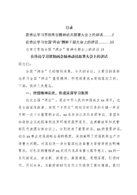 目录在传达学习贯彻两会精神动员部署大会上的讲话.2在传达学习全国两会精神干部大会上的讲话..10在学习贯彻全国两会精神专题会上的讲话15在传达学习贯彻两会精神动员部署大会上的讲话同志们:全国两会已经胜利闭幕,今天的会议,主要目的是传达学习全国两会重要精神,研究部署我x贯彻落实工作。下面,我讲三点意见。一、把握精神实质,形成浓厚学习氛围这次全国两会,是在中华人民共和国成立xx周年,也是全面深化改革、实现十四五规划目标任务的关键一年召开的一次十分重要的会议。xx在参加江苏代表团审议、看望参加政协会议的民革科技界环境资源界委员、出席解放军和武警部队代表团全体会议上,分别发表了重要讲话。xx的重要讲话,站在xx事业发展战略全局的高度,深刻阐明了发展新质生产力等重大问题,对谋划进一步全面深化改革重大举措等提出明确要求,对扎实稳健推进xx式现代化具有重大指导意义。xx的一系列新观点、新论断、新要求,高屋建瓴、思想深邃,引领时代、开创未来,为做好新时代各项工作提供了根本遵循,我们一定要认真学习、深刻领会、全面落实。在深刻把握取得成就中捍卫两个确立。过去一年,是xx历史上极为重要的一年,面对风高浪急的国际环境和艰巨繁重的国内改革发展稳定任务,xx团结带领全国各族人民迎难而上,实现了经济平稳运行、发展质量稳步提升、社会大局保持稳定,我国发展取得来之极为不易的新成就。这些成绩的取得,最根本在于xx的掌舵领航,在于xx的坚强领导,在于xx思想的科学指引。实践再次证明,两个确立是国家富强、民族复兴、人民幸福的定盘星和压舱石,是我们战胜一切艰难险阻、应对一切不确定性的最大确定性、最大底气、最大保证。我们要更加深刻领悟两个确立的决定性意义,始终同xx保持高度一致,坚决做到xx有号令、xx有部署、省委市委有要求,xx见行动。在深刻把握当前形势中坚定发展信心。从国际看,国际形势继续发生深刻复杂的变化,外部环境不稳定、不确定、难预料成为常态。从国内看,我国经济恢复的基础尚不牢固,发展不平衡不充分的问题依然突出,需求收缩、供给冲击、预期转弱三重压力仍然较大,但我国经济韧性足、潜力大、活力足,经济长期向好的基本面没有改变,我国发展仍具有诸多战略性的有利条件。从自身看,我x发展势头良好,去年主要经济指文可居文库——海量学习资料,手机电脑均可下载www.wenkeju.com标增速位列全x第一方阵,各种利好叠加,各种优势凸显,积蓄了高质量发展的强大动能。我们一定要把思想和行动统一到党中央对当前形势的科学判断上来,坚定发展信心,保持战略定力,抢抓发展机遇,争取战略主动,牢牢把握发展主动权。在深刻把握总体要求中明确前进方向。这次全国两会对做好今年工作提出了明确要求,在宏观指标设定方面,提出今年GDP增长x%左右、新增城镇就业xx万人、CPI涨幅x%左右;在宏观政策取向方面,强调要坚持稳字当头、稳中求进,积极的财政政策要加力提效,稳健的货币政策要精准有力,产业政策要发展和安全并举,科技政策要聚焦自立自强,社会政策要兜牢民生底线。xx在全省会议上进一步指出,要加快推动经济高质量发展,坚定不移全面深化改革开放,积极推进农业农村现代化,用心用情增进民生福祉,加强xx法治建设,纵深推进全面从严治党。这些要求明确而具体,我们要牢牢把握好,着力发展实体经济、推进生态文明建设、保障改善民生、防范化解风险等方面狠下功夫,不断开辟现代化建设新境界。二、强化贯彻落实,形成浓厚实干氛围全x上下要把学习贯彻全国两会精神融入到当前各项工作中,把学习成果转化为指导实践、推进工作的强大动力,为奋力描绘好xx式现代化新征程上的xx画卷多作贡献。文可居文库——海量学习资料,手机电脑均可下载www.wenkeju.com持续发展实体经济,增强高质量发展动能。以推动高质量发展为主题,坚持把发展经济的着力点放在实体经济上。要推动产业转型升级。聚焦加快建设xx现代产业体系,落实链长制,围绕要素保障、市场需求、科技创新、政策帮扶等领域精准发力,支持骨干企业延伸产业链、改造生产链、升级价值链、激活创新链,鼓励中小企业向专精特新、高新技术企业方向发展,促进产业链上下游、产供销、大中小微企业协同发展,推动产业体系不断发展壮大。要加快推进项目建设。坚持项目为王的理念,围绕xx年xx个重大项目,严格执行xx责任机制,扭住项目推进关键环节,深化项目全生命周期服务,统筹各方资源、人才和力量向项目集聚,推动洽谈项目早落地、落地项目早开工、开工项目早投产、投产项目早见效,加快形成轰轰烈烈抓项目的强劲态势。要紧盯行业龙头、链主企业,大力开展产业链招商、驻点招商、精准招商、以商招商,为经济总量快速增长奠