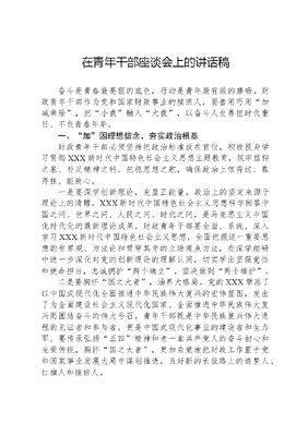 在青年干部座谈会上的讲话稿奋斗是青春最亮丽的底色,行动是青年最有效的磨砺。财政青年干部作为党和国家财政事业的接班人,要善用巧用加减乘除,把小我融入大我,以奋斗人生勇担时代重任、不负青春年华。一、加固理想信念,夯实政治根基财政青年干部必须坚持把政治标准放在首位,积极投身学习贯彻XXX新时代中国特色社会主义思想主题教育,筑牢信仰之基、补足精神之钙、把稳思想之舵,确保政治上信得过、靠得住、能放心。一是要深学创新理论,充盈正能量。政治上的坚定来源于理论上的清醒。XXX新时代中国特色社会主义思想科学回答中国之问、世界之问、人民之问、时代之问,是马克思主义中国化时代化的最新理论成果。财政青年干部要全面、系统、深入学习XXX新时代中国特色社会主义思想,全面把握这一重要思想的世界观、方法论和贯穿其中的立场观点方法,在深学细研中进一步深化对党的创新理论的理解认同,切实学出坚强党性和使命担当,忠诚拥护两个确立,坚决做到两个维护。二是要胸怀国之大者,涵养大格局。党的XXX擘画了以中国式现代化全面推进中华民族伟大复兴的宏伟蓝图,发出了为全面建设社会主义现代化国家、全面推进中华民族伟大复兴而团结奋斗的伟大号召。青年干部既是中华民族复兴伟大进程的见证者和参与者,更是中国式现代化事业的建设者和生力军。要传承弘扬五四精神和老一辈共产党人的奋斗初心和光荣传统,胸怀国之大者,更加自觉地把财政工作置于党和国家事业发展大局中谋划推进,当好新的长征路上的追梦人、扛旗人和接班人。三是要心系财政事业,永葆高追求。XXXXXX高度重视财政工作,明确提出财政是国家治理的基础和重要支柱。当前经济社会发展任务重、挑战多,经济运行的不稳定不确定因素依然较多,巩固经济回升向好态势、完成全年财政收入目标任务还要付出更多努力。财政青年干部要深刻把握财政机关首先是政治机关的定位,坚持以政领财、以财辅政,以时时放心不下的责任感,在精准高效保障上体现财政作为。二、减少短板弱项,提升本领能力财政青年干部必须紧紧围绕事业发展需要提升素质能力,着力补短板、强弱项,做到想干事、能干事、干成事。一是要拓展业务理论,进一步提升学习能力。财政作为重要综合经济部门,联系各行各业,服务千家万户,要求财政干部具备立体知识结构和理论储备。财政青年干部要坚持干什么、学什么,缺什么、补什么,正确处理好一专与多能的关系,既要学好本职岗位涉及的理论、政策、法规、制度等,又要深入学习钻研经济、金融、会计、管理、社会等专业理论,还要学习了解经济社会发展的新规则、新科技、新业态,努力成为业务通、法规通、理论通,科学系统把握部门、行业的业务与发展趋势,提升财政管理服务质量。二是要破解矛盾难题,进一步提升调研能力。财政青年干部要学会用好调查研究这个解题之策,带着问题出发、追着问题调研,深入细致进行问题梳理、难题排查,从而提出解决问题、改进工作的思路举措。要掌握全面情况,关注纵向和横向两个维度:纵向上,把上级的政策要求、本级的现实情况和基层的具体实际搞清楚;横向上,把同类城市和同行业的情况搞清楚,做到既见树木、又见森林。要实现成果转化,用好调研成果,促进建章立制,推出一批切合实际、务实管用的政策举措,同时为预算安排调整提供科学依据,服务提高财政管理水平和资金使用效益。三是要强化系统思维,进一步提升统筹能力。系统思维是文可居文库——海量学习资料,手机电脑均可下载www.wenkeju.com贯穿XXX新时代中国特色社会主义思想的科学思想方法之一。财政青年干部要强化系统思维,自觉跳出财政看财政、跳出一域看全局、跳出短期看长期。要加强前瞻思考,围绕党中央重大决策部署以及本职岗位涉及的行业领域,深入研究内在发展规律,为科学制定各项规划、制度、政策提供建设性意见建议。要做好全局谋划,树立大财政、大预算、大资产、大监督理念,把财政政策、财政管理、资金分配置于发展大局中来安排,统筹算好当前账与长远账、局部账与全局账,增强对重大决策部署的保障能力。要推进政策协同,统筹考虑经济运行特征,发挥逆周期、跨周期调节作用,系统运用各项财税政策,促进与金融、就业、产业、投资、消费、区域等政策形成集成效应。三、乘风扬帆远航,锻造过硬作风年初以来,积极的财政政策持续加力提效,推动经济运行整体回升向好,但经济运行和财政收支管理依然面临诸多困难和挑战。XXXXXX要求我们做好经受风高浪急甚至惊涛骇浪重大考验的准备。财政青年干部都要唱主角、当主力,在其位谋其政、任其职尽其责,既各展所长,又团结协作,以过硬作风担起组织重托。一是要实干担当有虎气。财政青年干部要对标人民对美好生活的期盼,对标高质量发展的目标,立足本职,敬业精业,切实做到以实干论高低、以实绩论英雄。要坚决革除稍进就满、小成即止的保守