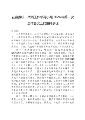 在县委统一战线工作领导小组2024年第一次全体会议上的主持讲话同志们:今天召开县委统一战线工作领导小组2024年第一次全体会议,主要任务是深入学习贯彻党的XXX精神和XXXXXX关于做好新时代党的统一战线工作的重要思想,全面落实中央和省委、市委统战工作会议精神,总结去年工作,研究部署今年重点任务。下面,我就进一步做好今年全县统战工作讲五点意见。第一,提高政治站位,增强统一战线的法宝意识。XXXXXX在党的XXX报告中指出,统一战线是凝聚人心汇聚力量的强大法宝。各级党委要充分认识新时代统一战线工作的极端重要性,从两个维护的政治高度学习贯彻好XXXXXX关于做好新时代党的统一战线工作的重要思想。一要坚持参政议政。立足于发展全过程人民民主的本质要求,进一步建立健全政党协商各项制度,支持民主党派加强参政党自身建设,切实提升多党合作水平。二要坚持铸牢民族共同体意识。牢牢把握共同团结奋斗、共同繁荣发展这一民族工作主题,推动少数民族乡村全面振兴发展,做好城市少数民族工作,积极稳妥处理涉民族问题,打造各民族共有的家园。三要坚持宗教中国化方向。坚持用导的态度对待宗教,引导宗教界人士用中华优秀传统文化浸润宗教、用社会主义核心价值观引领宗教,对宗教教规教义作出符合时代进步的阐释,不断推进宗教与社会主义社会相适应。第二,聚焦主题主线,筑牢共同团结奋斗思想基础。人心是最大的政治,共识是奋进的动力。要坚定不移把思想政治建设摆在首位,不断增强听党话、跟党走、与党同心奋斗的政治自觉。一要深化思想政治引领。结合巩固拓展主题教育成果,突出大团结、大联合永恒主题,精心组织丰富多彩的学习活动,动员全县上下把思想和行动统一到党中央决策部署上来。二要深化政党协商。认真抓好县委2024年政党协商计划的落实开展好兴X大家谈、民主监督三年提升行动,推动各民主党派、工商联、无党派人士围绕县委中心工作,多建睿智之言、多献务实之策、多尽精诚之力。三要支持民主党派自身建设。深入贯彻落实关于加强中国特色社会主义参政党建设的部署要求,实施民主党派组织建设牵手工程,抓实各民主党派政治思想建设、基层组织建设、机关制度建设、成员作风建设四大行动,推动民主党派自身建设规范化、制度化、长效化。第三,坚持问题导向,补齐统战领域短板不足。新形势下,统战工作面临许多新问题、新挑战,呈现许多新情况、新特点,需要我们以解决问题为导向,建立健全工作机制。一要持续开展宗教突出问题专项整治。各级党委要准确把握全县宗教工作面临的形势,时刻保持清醒头脑,以统一战线领域安全稳定促进社会大局稳定。要抓好依法治理和教育转化工作,力争更大转化成果,防止问题反弹。二要着力加强党外代表人士队伍建设。全县党外干部配备不足,县直政府部门党外领导干部配备还相差X名,X个县直单位领导班子党外干部还没有配齐。要结合党外干部结构特点和成长规律,完善党外代表人士培养选拔工作机制,全面规范党外人士的发现、储备、教育、培养、举荐、选拔、监督、管理、退出等环节,把更多优秀党外知识分子、新的社会阶层人士等纳入组织视野,吸引过来、组织起来、稳固下来。三要创新开展港澳台和海外统战工作。我县海外统战工作起步较晚,海外社团建设滞后,海外联谊面不宽,朋友圈偏小。要积极引导海外统战团体参与我们的节日等系列活动,深化联谊交流,推动广大乡亲和海外友人来X参访考察、投资兴业,为海外人才、技术、资本等助力X发文可居文库——海量学习资料,手机电脑均可下载www.wenkeju.com展出计献力。第四,服务中心大局,推动统战工作提质增效。坚持在全县发展大局中谋划统战工作,以统一战线所长服务改革发展稳定所需。一要在汇聚才智上下功夫。支持各民主党派和无党派人士发挥界别优势和专业特长,深入实际、深入基层、深入群众开展调查研究,积极参政议政、建言献策。适时组织全县留学人员来X开展科技对接活动,助推科技创新驱动战略。二要在落实两个毫不动摇上下功夫。把民营企业和民营企业家作为自己人,加强对非公有制经济人士的政治培养,积极落实各项惠企纾困举措,推动非公有制经济健康发展和非公有制经济人士健康成长。要做优政企茶话会等统战服务平台,深入开展入企走访连心活动,提振企业家发展信心。三要在助力招大引强上下功夫。瞄准招商引资和项目建设主战场,引导各民主党派、知联会主动发挥自身优势,大力开展双返双创(三请三回)活动,利用好外埠商会、异地商会、行业商会、抚籍乡贤在招商引资的桥梁纽带作用,强化外引内联,助力招大引强。第五,强化党的领导,巩固新时代大统战格局。党的领导坚强有力,统一战线才能沿着正确的政治方向前进,才能焕发出强大的凝聚力、向心力。一要压实主体责任。中央将对各级党委贯彻落实中央民族工作会议精神进行专项检查,对宗教工作开展新一轮督查