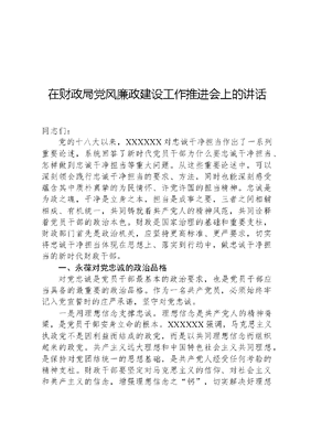 在财政局党风廉政建设工作推进会上的讲话同志们:党的十八大以来,XXXXXX对忠诚干净担当作出了一系列重要论述,系统回答了新时代党员干部为什么要忠诚干净担当、怎样做到忠诚干净担当等重大问题。从这些重要论述中,可以深刻领会践行忠诚干净担当的要求、方法,同时也能深刻感受蕴含其中质朴真挚的为民情怀、许党许国的担当精神。忠诚是为政之魂,干净是立身之本,担当是成事之要,三者之间相辅相成、有机统一,共同铸就着共产党人的精神风范,共同诠释着党员干部的政治本色。财政是国家治理的基础和重要支柱,财政部门首先是政治机关,应坚持更高标准、更严要求,切实将忠诚干净担当体现在思想上、落实到行动中,做忠诚干净担当的新时代财政干部。一、永葆对党忠诚的政治品格对党忠诚是党员干部最基本的政治要求,也是党员干部应当具备的最重要的政治品格。作为一名共产党员,必须始终牢记入党宣誓时的庄严承诺,坚守对党忠诚。一是用理想信念支撑忠诚。理想信念是共产党人的精神脊梁,是党员干部安身立命的根本。XXXXXX强调,马克思主义执政党不是因利益而结成的政党,而是以共同理想信念而组织起来的政党。共产主义远大理想和中国特色社会主义共同理想,是保持对党团结统一的思想基础,是共产党人经受任何考验的精神支柱。财政干部要坚定对马克思主义的信仰、对社会主义和共产主义的信念,增强理想信念之钙,切实解决好理想信念和世界观、人生观、价值观这个总开关问题,坚定中国特色社会主义道路自信、理论自信、制度自信、文化自信,筑牢对党忠诚的思想基础。要坚持把学习领会XXX新时代中国特色社会主义思想作为财政干部日常工作的必修课和谋事创业的前课,深入领会精髓要义,坚持用XXX新时代中国特色社会主义思想武装头脑,深刻把握、灵活运用蕴含其中的马克思主义世界观、方法论,指导形成推动财政改革发展的正确工作策略和方法,自觉做XXX新时代中国特色社会主义思想的坚定信仰者、忠实实践者。二是用两个坚决维护诠释忠诚。两个维护是首要的政治纪律,只有做到两个维护,旗帜鲜明讲政治,才能经受住各种考验,坚持正确政治方向。财政干部要把两个维护作为根本政治要求,在深刻认识核心、真诚拥护核心、坚定维护核心这个重大政治问题、重大政治原则上态度鲜明、立场坚定、行动自觉,激发出两个坚决维护的内生动力、强大力量,严守党的政治纪律和政治规矩,牢记五个必须,防止七个有之,自觉远离各种小圈子。三是用实际行动体现忠诚。对党忠诚不是抽象而是具体的,体现为对党组织所有的纪律、规矩都要不折不扣、老老实实地执行,没有什么可隐瞒的,没有什么需要遮遮掩掩的。XXXXXX多次指出党内存在的两面人问题,包括有的修身不真修,信仰不真信,表里不一、说一套、做一套,有的公开场合要党员、干部坚定理想信念,背地里自己不敬苍生敬鬼神,笃信风水、迷信大师;在党的十九大报告中又特别强调,要弘扬忠诚老实、公道正派、实事求是、清正廉洁等价值观,坚决反对搞两面派、做两面人。两面派、两面人,实际上就是表里不一,说的一套,做的一套,表面上忠诚于党,行动上不老实。财政部门必须坚决反对这种两面人现象,从小事做起,从细节抓起、从日常严起,把对党忠诚体现到一言一行中、落实到财政各项具体工作里、反映到担文可居文库——海量学习资料,手机电脑均可下载www.wenkeju.com当作为上,真正做到嘴上说、心里想、实际做的高度统一,做到光明磊落、行为有矩、诚实做人。二、坚守清正廉洁的从政底线坚持清正廉洁,是党员干部必须守好的基本底线。党员干部若不能守住个人干净的底线,就会像大厦失去了支柱、大坝动摇了根基,必然带来道德上的堕落、生活上的腐化、法纪上的失范。财政干部要算清廉政这本账,清清白白做人、干干净净干事,做到思想上清醒、经济上清白、生活上清新。一是坚持秉公用权不越轨。领导干部能不能做到个人干净,最经常的检验就是能不能正确对待和行使权力。现实中,一些人权力观扭曲,奉行有权不用、过期作废,一朝权在手、便把令来行,用手中权力给自己谋私利,最后走向不归之路。财政部门掌管钱袋子,一定要引以为戒,树立正确的权力观,明确权力来自人民,必须用之于人民,坚持秉公用权、依法用权、廉洁用权,不能擅自滥用,不能被家人利用,不能给朋友借用,也不能搞交易使用。一些不法商人拉拢领导干部,往往不是因为领导干部本人有多大魅力,而是因为手中有可以让他们牟利发财的权力;一些人向领导干部讨好、献媚,实际上也是奔着领导手中的权力而来的。要牢记人情里面有原则、交往之中有纪律,决不能飘飘然、昏昏然,在各种诱惑面前,防微杜渐、警钟长鸣,做到不该要的东西坚决不要,不能去的地方坚决不去,不能做的事情坚决不做,尤其是财政部门涉及财、物管理,涉及资金分配、政府采购等方面,更要坚持秉公