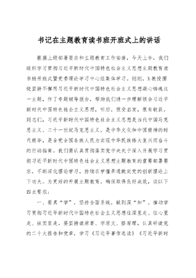 书记在主题教育读书班开班式上的讲话根据上级部署要求和主题教育工作安排,今天上午,我们组织学习贯彻习近平新时代中国特色社会主义思想主题教育读书班开班式暨党委理论学习中心组集体学习。刚刚,X教授围绕坚持不懈用习近平新时代中国特色社会主义思想凝心铸魂这一主题,作了专题辅导报告,帮助我们进一步理解领会习近平新时代中国特色社会主义思想,听后,很受启发,很有收获。同志们,习近平新时代中国特色社会主义思想是当代中国马克思主义、二十一世纪马克思主义,是中华文化和中国精神的时代精华,是全党全国各族人民为实现中华民族伟大复兴而奋斗的行动指南。我们要认真贯彻落实党中央关于深入开展学习贯彻习近平新时代中国特色社会主义思想主题教育的重要部署要求,不断深化理论学习,持续在学懂弄通做实党的创新理论上下功夫。为更好的开展主题教育,确保取得良好成效,谈以下四点要求:一、要真学,坚持全面系统,做到深知。推动学习贯彻习近平新时代中国特色社会主义思想往深里走、往心里走、往实里走。要坚持读原著、学原文、悟原理,认真研读党的二十大报告和党章,学习《习近平著作选读》《习近平新时代中国特色社会主义思想专题摘编》等,原原本本学,融会贯通悟。要全面系统学习十个明确十四个坚持十三个方面成就的丰富内涵,深刻领会习近平新时代中国特色社会主义思想的世界观、方法论和贯穿其中的立场观点方法。要及时跟进学习习近平总书记最新重要讲话和指示批示精神,真正做到学习跟进、认识跟进、行动跟进,用发展着的理论指导发展着的实践。要锚定习近平总书记指引的正确方向,凝心聚力、矢志前行,坚定捍卫两个确立、坚决做到两个维护,要全面深入学习贯彻习近平总书记重要讲话和全国两会精神,武装头脑、指导实践、推动工作,重点做到三个准确把握,即准确把握党和国家事业取得的辉煌成就,更加深刻领悟两个确立的决定性意义,矢志不渝沿着习近平总书记指引的方向奋勇前进,切实把学习成果转化为实践。二、要多思,坚持深刻领悟,做到坚信。不断增进对党的创新理论的政治认同、思想认同、理论认同、情感认同。要深刻领悟习近平新时代中国特色社会主义思想开辟了马克思主义中国化时代化新境界,更加坚定对马克思主义的信仰,对中国特色社会主义的信念,对实现中华民族伟大复兴中国梦的信心。要深刻领悟习近平新时代中国特色社会主义思想是一个逻辑严密、内涵丰富、系统全面、博大精深的科学体系,认真体悟蕴含其中的道理、学理、哲理,做到知其言更知其义、知其然更知其所以然。要深刻领悟习近平新时代中国特色社会主义思想的真理力量和实践伟力,更加自觉地用习近平新时代中国特色社会主义思想武装头脑、指导实践、推动工作。坚决维护党中央权威和集中统一领导,自觉在政治立场、政治方向、政治原则、政治道路上同以习近平同志为核心的党中央保持高度一致;准确把握党中央对做好当前和今后一个时期工作的部署要求,持续抓牢全面贯彻落实党的二十大精神这个首要政治任务,把学习贯彻习近平新时代中国特色社会主义思想融入到服务保障中国式现代化建设中。三、要运用,坚持知行合一,做到笃行。自觉用党的创新理论观察新形势、研究新情况、解决新问题。要紧密结合新时代波澜壮阔的历史进程和伟大变革,特别是习近平总书记带领我们打赢疫情防控武汉保卫战、保卫战,实现疫后重振和经济社会高质量发展,推动发生历史性转折性变化,取得脱贫攻坚决定性胜利的生动实践,更加深刻领悟两个确立的决定性意义。要紧密结合统揽伟大斗争、伟大工程、伟大事业、伟大梦想,统筹推进五位一体总体布局和协调推进四个全面战略布局的时代要求,深入学习领会中国式现代化理论,更加自觉贯彻新发展理念,构建新发展格局,推动高质量发展。要紧密结合习近平总书记的重要讲话和指示批示精神,对标习近平总书记赋予的历史使命,在加快建设全国构建新发展格局先行区、加快建成中部地区崛起重要战略支点的实践中担当作为、奋勇争先。把学习成果落实到履行岗位职责、推动事业发展上。要把学习成果转化为落实党中央决策部署的政治自觉,进一步增强四个意识、坚定四个自信、做到两个维护。要把学习成果转化为推进中国式现代化实践的思路举措,扎实推进以流域综合治理为基础的四化同步发展。要把学习成果转化为更好履职尽责的能力,坚持在干中学、学中干,不断增强推动高质量发展本领、服务群众本领、防范化解风险本领。本次读书班是一次难得的加油充电机会,大家要集中精力、静心学习,深入研讨、互学互鉴,严守纪律、端正学风,努力在以学铸魂、以学增智、以学正风、以学促干方面取得实实在在的成效。党员领导同志要以上率下,发挥好带学促学作用。各级党委(党组)要结合实际抓好学习培训,确保取得实效。