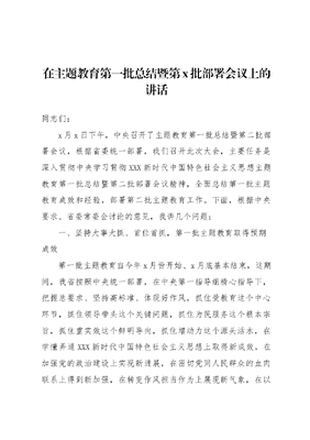 在主题教育第一批总结暨第x批部署会议上的讲话同志们:x月x日下午,中央召开了主题教育第一批总结暨第二批部署会议,根据省委统一部署,我们召开此次大会,主要任务是深入贯彻中央学习贯彻XXX新时代中国特色社会主义思想主题教育第一批总结暨第二批部署会议精神,全面总结第一批主题教育成效和经验,部署第二批主题教育工作。下面,根据中央要求、省委常委会讨论的意见,我讲几个问题:一、坚持大事大抓、首位首抓,第一批主题教育取得预期成效第一批主题教育自今年x月份开始、x月底基本结束,这期间,我省按照中央统一部署,在中央第一指导组精心指导下,把握总要求、坚持高标准、体现好作风,抓住受教育这个中心环节,抓住领导带头这个关键问题,抓住为民服务这个根本宗旨,抓住重实效这个鲜明导向,抓住增动力这个源头活水,在学懂弄通XXX新时代中国特色社会主义思想上取得新成效,在加强党的政治建设上实现新进展,在密切党同人民群众的血肉联系上得到新加强,在转变作风担当作为上展现新气象,在以党的建设高质量推动经济发展高质量上迈出新步伐,进一步营造了学的氛围、严的氛围、干的氛围,取得了阶段性成果。一是坚持系统谋划,保障高效落实。省委常委班子带头推进、职能部门协同落实,推动主题教育走深走实。精准细化实施方案,细化分解x类x项落实举措、x方面保障措施,有机贯穿学习研讨专题、调查研究主题、推动破解难题、检视整改问题,实现四题共答。及时组织落实。在此期间,我们加强向中央主题教育领导小组办公室和第x巡回指导组的请示汇报,按照上级意见抓好组织推进,确保了主题教育的正确方向和工作质量。二是坚持深学细悟,强化理论武装。省委常委班子、各职能部门、省直单位相关党员干部坚持以中央规定书目和省委自选内容为重点,坚持学在前、研在前、走在前,通过党委(扩大)会、第一议题和理论学习中心组学习、三会一课等方式,深学细悟精神、打牢思想基础。通过几个月的系统学习和强化教育,各级领导人员读原著、学原文、悟原理的自觉性显著增强,用XXX新时代中国特色社会主义思想补钙强体、强心健脑的劲头越来越足。三是坚持问题导向,推动高质量发展。省委常委班子成员带头深入基层一线,分赴x个县市区、x个基层单位开展调查研究,各部门x名领导干部结合业务实际选定调研主题x项,深入xx、xx、xx等x个地区、x家单位现场调研,访谈党员群众和旅客货主xx人,形成xx篇高质量的调研报告,现场协调解决问题x项,以基层智慧为推动破解制约全省发展难题增添动力。在此基础上,结合调研成果,各班子成员利用省委领导干部会议、经济工作会、调研检查形式,深入省内各单位、分管部门、基层联系点上专题党课,扩大了主题教育的实效性和受众面。四是坚持刀刃向内,深挖差距短板。组织召开座谈会x次,引导检视问题、专项整治。会上,各市州和部分省直部门主要负责人立足本职岗位和各地区各部门工作实际,围绕抓好理论学习、加强政治建设和基层建设、打好三大攻坚战、保障和改善民生等主题先后发言,提出具体意见和建议。在此基础上,坚持问题导向,深入检视问题,精准发现问题,全面梳理问题,制定专项整治工作方案,对中央明确的第一批五个方面专项整治任务进行细化具体化,明确责任单位,梳理出x个主要问题,提出x项整改措施,实行销号管理,有力提升了主题教育的质量和效果。五是坚持结果导向,促进改革发展。切实做到开展主题教育动真碰硬、不耍花枪:我们深入推进中央和省委巡视反馈问题整改,把巡视后半篇文章做好做实;深入开展xx案三项教育三项整治回头看,持续用力做好xx案以案促改工作,下大气力解决圈子文化、码头文化、xx文化问题;组织开展形式主义、官僚主义及不精不准、不严不实问题排查整改。截至目前,省委公布立行立改问题xx件,已完成整改xx件,市委领导班子个人整改立行立改问题xx件,增强了职工群众的获得感。六是坚持宣传辐射,提升工作实效。突出实践引领、宣传引导、典型引路,切实增强主题教育针对性实效性。在政务内网、两微一端等阵地开设主题教育学习专题专栏,滚动播放XXXXXX关于主题教育的重要讲话和重要指示批示精神,大力宣传主题教育典型事迹、典型做法,多角度立体化讲述全省主题教育进展成效、经验做法,在人民日报、新华社等平台累计发表主题教育宣传报道x篇,为主题教育营造了浓厚氛围。在党中央坚强领导下,在中央第x巡回指导组有力指导下,第一批主题教育取得了思想、理论、实践、制度多方面重要阶段性成果和实实在在的成效。参加第一批主题教育的广大党员干部经历了一次深刻的党性淬炼和精神洗礼,为压茬开展好第二批主题教育打下了坚实基础。实践证明,把初心擦得更亮,让使命担得更牢,必须把牢坚定信仰这个出发点,坚持思想建党、理论强党,把掌握马克思主义看家本领作为永恒课题;必须把牢对党忠诚这个着力点,强化政治统领,以自我革命精神保持