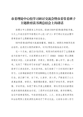 市委理论中心组学习研讨交流会暨市委常委班子主题教育读书班总结会上的讲话按照全市主题教育工作安排,经请示XX市委第6指导组同意,今天上午我们召开市委理论中心组(扩大)学习研讨交流会暨市委常委班子主题教育读书班总结会。XX市委第6指导组对此高度重视,XX组长、XX同志和XX同志到会指导,让我们以热烈的掌声,对3位同志的莅临表示欢迎。近一个月来,我们分5各阶段、利用10天时间进行了主题教育读书班集中学习,大家原原本本学习了《XXX》《XXX》等主题教育规定书目。大家读原著、学原文、悟原理,静心学习、潜心思考,达到了理论学习有收获的效果。主要呈现三个特点:一是学习认真收获丰。这次读书班,我们安排了十天时间进行集中学习。大家都能够把学习贯彻XXXX主义思想作为主题教育的根本任务,真正静下来、坐下来,认真学、深入学,严格落实了认认真真读原著、学原文、悟原理的要求,做到了学有所思、学有所悟、学有所获,体现了带头开展主题教育、带头用党的创新理论武装头脑的高度政治自觉。二是研讨交流有深度。读书班期间,各位市委常委同志,市政府党组成员,人大、政协主要负责同志和法检两院主要负责同志都进行了研讨交流。大家结合深入学习XXXX主义思想,立足本职岗位和分管领域,紧密联系思想和工作实际,围绕党的政治建设、全面从严治党等方面,讲认识、说体会、谈打算,既有认识高度,又有思想深度,更有行动态度,达到了促进交流、共同提高的目的。三是指导有力见实效。市委第6指导组XXX组长对我市开展主题教育高度重视,从我市主题教育启动以来,全程进行了有力指导,并参加了主题教育读书班多个阶段的研讨交流,给我们及时提出了十分宝贵的指导意见,推动主题教育读书班取得了扎实成效。为了更好地推动学习贯彻XXXX主义思想往深里走、往心里走往实里走,提高运用党的创新理论指导实践、推动工作的能力。对此,我再强调三点意见。第一,学习贯彻XXXX主义思想,基础是真学,要往深里走,真正把握这一思想的理论体系和思想精髓。XXXXXX多次强调,掌握马克思主义理论的深度,决定着政治敏感的程度、思维视野的广度、思想境界的高度。XXXX主义思想处处闪耀着马克思主义真理的光芒,具有深刻的理论根据、厚重的理论分量和缜密的逻辑思维。要深刻认识和把握八个明确、十四个坚持的科学体系和丰富内涵,深刻认识和把握贯穿其中的马克思主义立场观点办法,不断提高马克思主义水平。我们在这次读书班中都是坚持原原本本学、逐字逐句读,大家都反映,这种方法事半功倍,达到了以往学习所没有的好效果。今后,要继续坚持下去发扬学到底、悟到位的精神,并自觉把学习融入工作、融入实践不断增强工作的原则性、系统性、预见性、创造性。第二,学习贯彻XXXX主义思想,关键是真信,要往心里走,真正把这一思想作为为官从政干事的政治要求。真信来自于真理的力量。XXXXXX深刻指出,在领导干部的所有能力中,政治能力是第一位的我们学习贯彻XXXX主义思想,首先要深刻理解和领悟这一思想的政治意义、政治信仰、政治考量和政治要求,这样才能从思想上领会到位,从行动上贯彻到位。XXXX主义思想是谋大局、谋未来的,布下的是一盘新时代坚持和发展中国特色社会主义的大棋局所提出的一系列重大论断、做出的一系列重大部署都是我们要时刻牢记的大局。要自觉在大局下学习,在大局下行动,做到一切服从大局、一切服务大局,最根本的一点,就是要坚决捍卫两个确立,做到两个维护,在政治立场、政治方向、政治原则、政治道路上始终坚定地同以XXX同志为核心的党中央保持高度一致,不折不扣地把XXX的重要指示和党中央的重大决策部署落到实处。第三,学习贯彻XXXX主义思想,目的是真用,要往实里走,真正把这一思想转化为指导工作实践的根本遵循和强大动力。我们学习的目的是要把学习成效转化为落实党中央和省市党委决策部署的政治自觉,转化为做好工作的思路举措,转化为解决实际问题的能力本领,转化为增强党性的实际行动。关键是要充分发扬三种精神:一是责任担当精神。要以在其位、谋其政的责任意识、知其难而为之的执着信念、赴百仞之谷而不惧的无畏勇气,坚决扛起组织和人民赋予我们的历史责任,敢于担当、善于担当、体现担当,以钉钉子精神贯彻落实党的十九大精神和党中央决策部署,创造出经得起实践、人民和历史检验的实绩。要坚决反对和抵制形式主义、官僚主义,坚持从实处着眼、用实干考量、用实绩说话,坚决破除一切影响事业发展的障碍和阻力。二是实干为民精神。坚持全心全意为人民服务,是我们党员领导干部必须自觉践行的根本宗旨,要把群众观点、群众路线根植于思想中、落实到行动上,想问题、作决策、办事情都要站在群众立场、从人民利益出发,把人民群众对美好生活的向往作为我们的奋斗目标,把民之所思、民之所盼、民之所需作为工作重心,切实办好各方面民生实事和