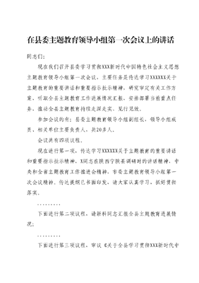 在县委主题教育领导小组第一次会议上的讲话同志们:现在我们召开县委学习贯彻XXX新时代中国特色社会主义思想主题教育领导小组第一次会议,主要任务是传达学习XXXXXX关于主题教育的重要讲话和重要指示批示精神,研究审定有关工作方案,听取全县主题教育工作进展情况汇报,安排部署当前重点任务,推动全县主题教育持续走深走实、见行见效。参加会议的有:县委主题教育领导小组副组长,领导小组成员、相关单位主要负责人,共20多人。会议共有四项议程。现在进行第一项,传达学习XXXXXX关于主题教育的重要讲话和重要指示批示精神,X同志在陕西宁陕县调研时的讲话精神,中央和全省主题教育工作推进会精神,市委主题教育领导小组第一次会议精神。传达提纲已书面印发,请大家认真学习,抓好贯彻落实。下面进行第二项议程,请新科同志汇报全县主题教育进展情况;下面进行第三项议程,审议《关于全县学习贯彻XXX新时代中国特色社会主义思想党支部书记和党员轮训培训工作方案》等四个《工作方案》,请X同志汇报;大家对这4个《工作方案》有什么意见,请发表;会议原则同意4个《工作方案》,请县主题教育办公室按照讨论意见修改完善后按程序送审印发;下面进行第四项议程,审议《学习贯彻XXX新时代中国特色社会主义思想主题教育8个专项整治方案》,请X同志汇报;大家对8个《专项整治方案》有什么意见,请发表;会议原则同意8个《专项整治方案》,请县主题教育办公室按照讨论意见修改完善后按程序送审印发;刚才,传达了XXXXXX关于主题教育的重要讲话重要指示批示和有关会议精神,听取了全县主题教育进展情况汇报,审定了有关方案。总体感觉,主题教育启动以来,全县各级党组织高度重视,紧紧围绕学思想、强党性、重实践、建新功的总要求,聚焦主题主线,紧扣目标任务,注重分类施策,推动主题教育在全县各级党组织和广大党员干部中深入开展,取得了阶段性成效但从上级调研指导和各方面了解掌握的情况来看,我们工作中还存在一些差距和不足,主要是:一些基层党组织主体责任落实还不够到位,研究谋划不深,推进力度不大,工作不细不实,在推动主题教育往深里走、往实里走上还不够到位;一些基层党组织对不划阶段、不分环节的要求理解不够透彻、把握不够精准,没有很好地把各项重点措施融合起来、一体推进;一些基层党组织对主题教育相关政策要求掌握不精准,抓流动党员、年老体弱党员等特殊群体党员主题教育的方式方法单一;一些党员干部学用结合不紧密,在以学促干、推动发展上仍有差距,等等对这些问题,请大家高度重视,下功夫予以解决。近期,中央和省委分别召开了主题教育工作推进会议,对做好下一步工作进行专题安排,市委也将召开推进会议,县主题教育办公室要抓紧筹备,市上推进会议之后,及时召开县上推进会议进行具体安排。下面,我结合当前工作推进情况,讲三个方面意见。一、聚焦主题、紧扣主线,在深学细悟、细照笃行上下功夫开展主题教育是锤炼党性、铸牢忠诚的重大举措,是统一思想、凝心铸魂的必然要求,是围绕中心、服务大局的重要检验,是自我革命、从严治党的实际行动。要牢牢把握主题教育目标要求,进一步夯实学的基础、强化干的导向,推动主题教育扎实深入开展。要持之以恒强化理论学习。各级党委(党组)理论学习中心组要发挥示范引领作用,坚持读原著、学原文、悟原理真学实学、善思善用,努力做到学深悟透弄懂做实。各基层党组织要认真落实第一议题制度,持续深化五学联动机制,依托三会一课、主题党日,突出抓好集体学习,确保学深学透规定书目。基层党组织书记要采取书记讲给书记听等方式紧扣主题主线,结合工作实际,精心准备党课讲稿,按11月中旬前完成党课讲授。县委组织部和各党(工)委要抓紧开展党支部书记和党员轮训培训工作,县委宣传部要抓实理论宣讲进基层行动,推动党的创新理论深入人心、见行见效。同时,要用好学习强国、共产党员网等平台载体,督促党员干部加强个人自学,引导广大党员从党的创新理论中悟规律、明方向、学方法、增智慧,真正把精神力量、真理力量转化为实践力量。要求真务实开展调查研究。县委常委会和各常委要率先垂范,紧紧围绕调研课题和正反典型案例,进行解剖麻雀式调研,查找问题、剖析原因,举一反三研究提出改进措施,推动解决一批发展所需、改革所急、基层所盼、民生所向的问题。要认真落实深实、细、准、效要求和四下基层工作理念,奔着问题去、盯着问题研,扑下身子、沉到一线,切实把情况摸清、把问题找准、把对策提实,实打实拿出发展破难、民生解难的具体对策,形成高质量调研报告,开好调研成果交流会,促进成果转化运用刚才讨论审定的四个工作方案,对接了市上要求,结合了我县实际,提