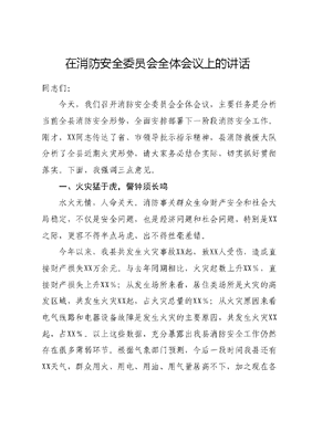 在消防安全委员会全体会议上的讲话同志们:今天,我们召开消防安全委员会全体会议,主要任务是分析当前全县消防安全形势,全面安排部署下一阶段消防安全工作。刚才,XX同志传达了省、市领导批示指示精神,县消防救援大队分析了全县近期火灾形势,请大家务必结合实际,切实抓好贯彻落实。下面,我强调三点意见。一、火灾猛于虎,警钟须长鸣水火无情,人命关天。消防事关群众生命财产安全和社会大局稳定,不仅是安全问题,也是经济问题和社会问题,特别是XX之际,更容不得半点马虎、出不得丝毫差错。今年以来,我县共发生火灾事故XX起,致XX人受伤,造成直接财产损失XX万余元。与去年同期相比,火灾起数上升XX%,直接财产损失上升XX%;从发生场所来看,居住类场所是火灾的高发区域,共发生火灾XX起,占火灾总量的XX%;从火灾原因来看电气线路和电器设备故障是发生火灾的主要原因,共发生火灾XX起,占XX%。以上这些数据,充分暴露出我县消防安全工作仍然存在很多薄弱环节。根据气象部门预测,今后一段时间我县还有XX天气,群众用火、用电、用油、用气量居高不下,加之现在各类建筑物墙体装饰增多、内部装修结构复杂、封闭严密、空气流通不畅等因素,暗藏大量火灾隐患,随时都有发生火灾的危险,防火形势依然严峻。因此,各乡镇、XX、各部门要以时时放心不下的责任感时刻绷紧消防安全这根弦,要深刻汲取近期火灾事故教训,聚焦少起火、不亡人,坚决克服麻痹大意思想,始终保持高度警醒,切实增强危机意识、忧患意识和底线思维,最大限度地预防一般火灾事故发生,坚决杜绝较大及以上火灾事故特别是亡人事故发生,全力保障人民群众的生命财产安全。二、隐患积于微,防范须严密要坚持预防为主、防消结合方针,做到没事防有事、小事防大事、一事防多事,确保隐患排查全覆盖、问题整改零容忍,将风险和隐患消灭在萌芽中。一是要深入开展隐患排查整治。各乡镇、城市社区、各部门要结合XX重点任务清单,立即开展消防安全隐患大排查大整治,切实消除各类火灾隐患。要迅速开展重点行业领域大排查大整治县消安委成员单位要充分履行消防安全监管责任,督促本行业、本系统内的各类火灾隐患排查整治工作,特别是要强化高低大化(高层建筑、地下建筑、大型综合体、石化企业)、老幼古标(养老服务机构、幼儿教育场所、文物古建筑、标志性建筑)以及娱乐场所、车站、商场、宾馆等人员密集场所的消防安全监管,对三合一多合一场所、老旧厂房、建筑工地宿舍等开展全面消防检查,确保老问题限时清零、新问题动态清零,坚决杜绝亡人事故发生;同时,要举一反三开展排查整治,针对XX季节火灾事故和行业规律特点,进一步做好危化品建筑施工、森林等重点领域消防安全防范工作。要深入推进经营性自建房消防安全综合治理。将消防安全纳入自建房排查整治范畴,严格落实七个必须刚性整治措施(七个必须即:必须确保通道畅通、必须确保消防设施处于正常状态、必须确保值班人员坚守岗位、必须严格规范用电设施、必须建立完善事故应急救援预案、必须严格企业消防安全主体责任、必须严格执行工作票等制度),确保全面消除经营性自建房安全隐患。对违规使用易燃可燃夹芯彩钢板或其他易燃材料,违规设置室外电动车集中停放、充电雨棚,外窗、疏散走道安装防盗网、广告牌、铁栅栏的,必须拆除;对居住区域与其他区域,或居住区域内各房间未完全分隔的,必须砌墙或安装防火门进行分隔;对电动车及蓄电池在室内停放、充电的,必须搬移至室外;对安全出口、疏散楼梯不足的,必须按要求增设;对生产、储存、经营易燃易爆危险品区域内设置的居住场所,或租住场所内设置不符合要求的冷库,必须搬离;未按要求整改的场所,必须减少居住人数,或停止生产、停止营业、停止租住;对使用不合格电器产品、室内电气线路私拉乱接、消防设施器材未保持完好有效等其他问题隐患必须限期改正。要全力督促重大火灾隐患单位整改销号。对列入整改的重大火灾隐患,要严格按照整改责任、措施、资金、时间预案五落实的要求强化工作举措,要在新闻媒体予以公告,公布隐患内容,明确整改期限、责任单位和责任人,接受社会监督;各行业主管部门要按照三管三必须要求,想尽一切办法尽快完成整改,确保重大火灾隐患全面彻底整改到位。二是要不断加强安全知识教育。火灾的发生,大多是因为人祸;事故的背后,是公众消防知识的缺乏、消防安全意识的薄弱各乡镇、XX、各部门要围绕落实消防安全宣传教育进企业、进农村、进社区、进学校、进家庭工作,着力增强全民消防安全意识要组织发动村(居)干部、基层网格员、公安派出所民警上门入户开展宣传,并利用乡村大喇叭,大篷车等手段,在辖区范围内广泛开展消防云课堂、大篷车消防宣传等活动。要统筹各类宣传力量,新闻宣传部门要牵头,充分结合四城同创工作,利用微信公众号、微博、视频号、抖音号等新媒体手段,依托电视台等