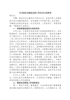 在全县信访维稳安保工作会议上的讲话同志们:近期,我县信访总量仍处于高位运行,赴省进京上访隐患尚未完全化解消除到位。信访维稳工作形势严峻,任务艰巨,为确保全县政治更安全、社会更安定、人民更安宁、网络更清朗,下面我讲几点意见:一、准确把握我县信访维稳形势今年以来,尽管通过各级各部门和县级领导的努力,信访维稳取得一定的效果,但形势仍然不容乐观。一是信访总量仍处于高位运行。元至2月份信访总量达到X批,涉及X人次;二是上级交办及历史积案化解进展不快。X件重点信访事件到目前为止仅办理X件,乡镇和县直单位承诺办结的也没有办理完毕;三是赴省进京上访的苗头有所抬头。近期票务系统反映出几起进京上访的信访重点人,虽然都及时得到处理,没有造成后果,但这种倾向和势头不容忽视。四是重点群体信访问题化解效果不理想,有的还有激化的趋势。如X信访群体等,在这个特殊时期,要高度重视;五是对重点人的管控还欠力度,尤其是对重点人摸排不深入、进展缓慢、分类不细、施策不精准。重复访的人较多,有的还为疑似精神有问题的人。乡镇和相关责任单位没有把工作做到位,化解矛盾问题的责任人没有化解到位,稳控责任人没有真正把人盯住看牢,导致脱离稳控视线;六是社会面管控有待加强。要加大街面巡逻覆盖面,充分发挥网格化管理功能,全面实施群防群治,坚决守住不发生重大安全事故的底线。针对以上问题,各乡镇、县直各单位要进一步提高政治站位,切实扛起信访维稳的责任,认真研究工作措施,把辖区内的信访维稳工作抓细抓实。二、狠抓信访维稳工作措施落实第一,要坚守底线,高度重视。全县各级各部门要高度重视本辖区内的信访维稳工作。要精准发力,全力确保社会、政治大局稳定。各级党委要切实提高政治站位,把信访维稳工作作为一项政治任务,主要领导要切实担负起责任,亲自部署、亲自督导,狠抓落实,确保效果。第二,要聚焦重点,认真排查。各乡镇、县直各单位会后及时组织力量,切实按照省委要求,结合各自实际,地毯式全覆盖开展重点人员排查,务必做到底子清,情况明。凡涉及到的相关部门要认真组织审核,同时,逐人建立台帐,适时动态调整,实行销号管理。公安部门要充分发挥票务系统等平台的预警作用,为责任单位精准开展劝返稳控工作提供保障。第三,要强化担当,压实责任。信访维稳工作严格按照属地管理、分级负责、谁主管谁负责、党政同责、一岗双责、失职问责的原则落实责任。一是实行县级领导带班接访和包案制。按照县信访联席办安排的接访时间准时到信访局接访,有特殊情况或因公外出的要安排好其他领导代为接访,按照所包信访案件定期下访,全力化解。二是各乡镇、县直各单位要认真落实重点人员五包一措施,进一步明确责任领导、责任人,既要着力化解矛盾隐患,又要盯死看牢。要带着感情、带着责任、带着方案措施,去从根本上化解矛盾隐患,群众正当的利益诉求要解决落实好,超出政策法律的需求要解释引导好,违法违规的行为要采取措施依法打击到位。做到问题不解决、矛盾隐患不根治不放手。三是加强调度和研判,提升化解效果。要加强下访,主动发现问题、收集信息、定期分析、研判本部门、本乡镇的信访维稳情况和舆情,主动作为,抓先抓早。对个案要举一反三,确保不发生类似问题,真正提升化解效果。四是强化应急处理和劝返工作。针对出现个别重点人赴省进京的,责任单位及时组织力量拦截和劝返,驻长、驻京及公安部门要全力配合,决不能造成负面影响。五是依法从严打击非访、集访、闹访行为。责任单位、信文可居文库——海量学习资料,手机电脑均可下载www.wenkeju.com访部门及政法各单位要通力配合,找出法律依据、收集准确证据、制定详细方案从严打击,坚决遏制非访、集访、闹访的势头。第四,要忠诚履职,严肃纪律。各位县级领导、乡镇党委书记、县直单位主要负责人要切实担负起信访维稳工作第一责任人、分管责任人的责任,坚决做到六个不发生,即:坚决防止发生影响国家安全和政治稳定案事件,防止发生暴力恐怖袭击和个人极端案事件,防止发生个人非法滋事和规模集访事件,防止发生重大公共安全事件,防止发生重大负面舆情事件,防止发生其它影响稳定、干扰大会顺利进行的事件。以上六个不发生是信访维稳工作的底线。文可居文库——海量学习资料,手机电脑均可下载www.wenkeju.com