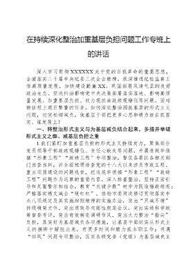 在持续深化整治加重基层负担问题工作专班上的讲话深入学习贯彻XXXXXX关于党的自我革命的重要思想,全面落实二十届中央纪委三次全会精神,纵深推进纪检监察工作高质量发展,加快建设勤廉XX,巩固拓展风清气正的良好政治生态。坚决纠治影响党中央决策部署落实落地、影响高质量发展、加重基层负担、权力观扭曲政绩观错位等问题。面对新征程上艰巨繁重的任务,如何深化整治困扰基层的形式主义问题,切实松绑减负,使基层干部把更多心思和精力放在抓落实、谋发展上?一、将整治形式主义与为基层减负结合起来,多措并举破形式主义之弊、减基层负担之重1.我们紧盯加重基层负担的形式主义持续发力,聚焦部分党员领导干部政绩观错位、责任心缺失等问题,开展违规举债搞形象工程政绩工程专项整治,督促各县区各相关部门自查自纠,并全面梳理排查党的十八大以来涉及市政工程、重点项目建设的问题线索,把违规举债搞形象工程政绩工程问题作为巡察的重要内容,深入排查整治。坚持正面引导和反面警示相结合,教育关键少数树牢为民造福政绩观;严格落实精文减会硬杠杠,协助市委两次修订贯彻落实中央八项规定及其实施细则精神的实施办法,突出只减不增持续精简文件,突出质效导向刚性规范会议,突出实绩科学统筹督查考评,突出有效转变调研作风,突出大力整治指尖负担,落实好为基层减负各项措施,让基层干部切实从形式主义的捆绑中解脱出来,有更多时间和精力抓本职工作;开展四风问题专项整治,压实各级党委(党组)为基层减负主体责任,自查自纠建立问题台账,逐一整改对账销号。协调巡察、审计部门对发现的相关问题起底排查,与此同时,对加重基层负担等问题回头看。对自查自纠与监督检查中发现的脱离实际的规划方案、搞纸上谈兵不出实招等问题线索,提级直查直办,依规依纪严肃追责问责,通报曝光典型案例,形成有力震慑,不断加固中央八项规定堤坝。2.我们聚焦考核评估名目繁多、变形走样、文山会海、过度留痕等问题,既加大查处问责和通报曝光力度,又从源头上督促治理,全力破解加重基层负担难题,让基层干部有更多精力为群众办实事。深入开展乡村振兴领域形式主义、官僚主义突出问题专项整治,对照8类突出表现,开展三访三查活动。纪检监察干部访乡村、访农户、访项目,查重点项目建设、后续管理使用及责任落实情况,查干部作风,查基层负担,重点纠治有令不行、有禁不止,做选择、搞变通、打折扣,照搬照抄、上下一般粗以及片面理解、野蛮操作等突出问题,及时纠正相关政策衔接不紧密、工作不连续以及来回翻烧饼等问题。与此同时,对形式主义、官僚主义典型问题,加大通报曝光力度,教育引导党员干部深刻汲取教训,增强敬畏之心。发挥先进典型的示范引领作用,把作风优良、实绩突出、深受群众认可的先进人物、先进事迹宣传好,大力弘扬党的光荣传统和优良作风,激励广大党员干部以典型为榜样,不断改作风树新风。3.我们坚持问题导向,深化拓展整治形式主义为基层减负工作,开展基层治理中脱离群众、任性用权等问题专项整治。专项整治中,纵向发挥室组地联动优势,横向加强与巡察、党委政府督查等部门的联动协作,采取灵活机动、四不两直等方式开展监督检查,着力发现查处重复转发上级文件,制定文件脱离实际、增加基层负担,任性用权违规向群众摊派费用等问题。同时,深化以案促改促治,查找案件暴露出的短板弱项,及时下发提醒卡、纪检监察建议,督促完善制度机制,文可居文库——海量学习资料,手机电脑均可下载www.wenkeju.com从源头上整改整治,共下发纪检监察建议14份,推动完善制度机制41项。如,云州区纪委监委通过室组联动监督发现,倍加造镇组织召开镇村两级干部大会较多较频,严重影响日常工作,区纪委监委第一时间约谈镇党委负责人,下发日常监督提醒卡,要求提高会议质量,完善会议制度,不发不切实际、内容空洞的文件,不开应景造势、不解决问题的会议,切实减轻干部会多会繁负担。二、坚持系统抓、抓系统,打通贯彻落实中梗阻,杜绝层层加码甩担子1.我们纵深推进抓学习促提升、抓执行促落实、抓效能促发展三抓三促行动,将其作为有力抓手,打通贯彻落实中梗阻,杜绝层层加码甩担子,制定任务、措施、问题三张清单,扭住到事、到人、到时、到位四个关键,压茬推进287项重点任务、150项攻坚克难任务和37个省列重点督办事项,以实干实绩防治形式主义。创新工作方法,搭建市级三抓三促行动电子信息平台,建立重点任务落实预警机制和亮牌机制,并利用大数据信息化技术,助力发现推诿扯皮、影响质效等加重基层负担问题。紧盯责任传导中梗阻等问题,集中排查一批、处理一批、曝光一批、重处分一批。用好正反典型通报,问责通报官本位庸懒散七不为反面典型案例25起,挖掘解决问题行动快、思路活、成效好的正面典型案例33