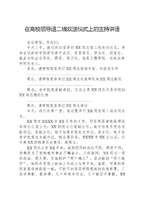 在高校领导退二线欢送仪式上的主持讲话各位领导,同志们:今天上午,我们在这里举行XX同志退二线欢送仪式。参加会议的有学院领导班子成员、党委委员、学生处、招生处、就业与校企合作处、团委、保卫处、信息工程学院、仪祉农林学院负责人。首先,请学院党委书记XX同志宣读市委、市政府文件现在,请学院党委书记XX同志代表学院向XX同志献花现在,由学院党委副书记、工会主席XX同志代表学院向XX同志赠送礼物现在,请学院党委书记XX同志讲话今天,我们欢聚一堂,在这里举行XX同志退二线欢送仪式。XX同志XXXX年XX月参加工作,历任陕西省乾县师范学校办公室主任;XX职院办公室副主任,电子信息系党总支副书记、系副主任,电子信息系党总支书记、系主任,电子信息学院党总支副书记、院长等职务。XXXX年XX月以后,任中共XX职院委员会委员、副院长。XX同志工作XX年来,虽然经历的岗位不同、职责不同,但都是为了党的教育事业不懈奋斗。工作期间,XX同志一是讲政治、顾大局。忠诚拥护两个确立,坚决做到两个维护,始终在思想上政治上行动上与党中央、省委、市委和学院党委保持高度一致,不折不扣落实学院党政的决策部署。二是讲奉献、敢拼搏。几十年艰辛付出、几十载坚守奉献,XX同志恪尽职守,爱岗敬业,任劳任怨,是XX职院从无到有、由弱变强的亲历者和见证者,更是XX职院创建、建设、改革、发展的实践者和奋斗者,为推动学院各项事业高质量发展做出了重要贡献。三是讲担当、勇作为。XX同志担任领导班子成员以来,正值学院双高建设的关键五年,分管学生、招生、就业、安全、团委、校企合作等工作,任务多、责任重、压力大。充分发扬特别能吃苦、特别能战斗、特别能奉献的工作精神,在政治上重表率、工作中重担当、相处中重感情。四是讲创新、重实效。XX同志在处理急难险重任务时,政策性强,能动性强,灵活性强,能够创造性的开展工作,高标准、高质量、高效率完成了学院党政交付的各项任务,为学院建设发展挥洒了辛勤汗水,贡献了智慧力量。在此,我代表学院党委向XX同志表示衷心的感谢,并致以崇高的敬意!古枫吐艳,晚菊傲霜。希望XX同志及时调整好心态,积极融入社会、融入社区,始终保持学习热情、革命热情,充分发扬老干部政治强、觉悟高、党性好的政治优势,带头宣讲党的政策方针,以坚定的信仰、信念、信心影响和辐射更多市民群众,真正成为XXX新时代中国特色社会主义思想的积极传播者、实践者、推动者。希望XX同志能够充分用好经验优势、智慧优势、资源优势,继续发挥余热,有时间常回家看看,积极给学院发展建言献策。弦歌不辍,薪火相传。我们对老同志的历史功绩和重大贡献不能忘,对老同志的优良传统和崇高精神不能丢,对关心关爱老同志的政策不能变。希望XX同志在退二线后,继续发挥传帮带作用,多鼓励、多支持年轻人的工作,当好年轻干部、年轻教师成长的榜样。桑榆未晚,为霞满天。希望XX同志继续发扬艰苦创业、奋进图强的学院精神,当好XX事业发展的参议员和年轻干部成长的辅导员,积极传播XX声音、讲XX故事,不断为加快建设团结富裕和谐美丽社会主义现代化新XX增添正文可居文库——海量学习资料,手机电脑均可下载www.wenkeju.com能量。退岗不褪色,离职不离心,继续创造精彩人生。最后,再次向XX同志表达最诚挚的敬意,感谢你为学院建设改革发展做出的贡献。衷心祝福你退二线生活丰富多彩、身体健康顺遂,家庭幸福美满。现在,请XX同志发言刚才,我们举行了XX同志退二线欢送仪式。正如XX同志所说,XX同志工作XX年来,在学院发展的不同时期,不同岗位上,始终以满腔热血和才华智慧,兢兢业业忘我工作,为学院建设发展做出了重要贡献。在此,向XX同志表示崇高的敬意和衷心的感谢。真诚的希望XX同志能够充分发挥自身经验优势,为学院发展发挥余热,再做贡献。衷心祝愿XX同志身体健康、生活幸福、阖家欢乐、万事如意!文可居文库——海量学习资料,手机电脑均可下载www.wenkeju.com