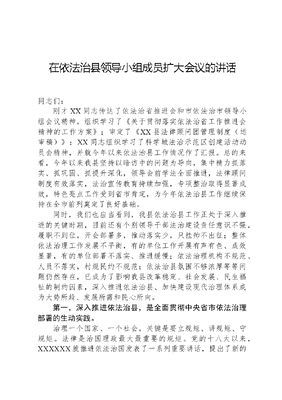 在依法治县领导小组成员扩大会议的讲话同志们:刚才XX同志传达了依法治省推进会和市依法治市领导小组会议精神,组织学习了《关于贯彻落实依法治省工作推进会精神的工作方案》;审定了《XX县法律顾问团管理制度(送审稿)》;XX同志组织学习了科学城法治示范区创建活动动员会精神,并就今年以来依法治县工作情况作了汇报。总的来看,今年以来我县坚持以暗访中的问题为导向,集中精力抓落实、抓巩固、抓提升深化,领导会前学法全面推进,法律顾问制度有效落实,法治宣传教育持续加强,专项整治取得显著成效,特色亮点工作受到省市肯定,为今年依法治县工作继续保持在全市前列奠定了良好基础。同时,我们也应当看到,我县依法治县工作正处于深入推进的关键时期,目前还有个别领导干部法治建设责任意识不强,履职不到位,开会部署多,推动落实少,只挂帅不出征;整体依法治理工作发展不平衡,有的单位工作开展有声有色、成效显著,有的单位部署不落实、推进缓慢;依法治理机构不规范、人员不落实,村规民约不规范;依法治县氛围不够浓厚等等问题仍然存在,已成为了影响我县改革稳定、社会发展、民生福祉的制约因素,深入推进依法治县、加快建设现代治理体系成为大势所趋、发展所需和民心所向。第一,深入推进依法治县,是全面贯彻中央省市依法治理部署的生动实践。治理一个国家、一个社会,关键是要立规矩、讲规矩、守规矩。法律是治国理政最大最重要的规矩。党的十八大以来,XXXXXX就推进依法治国发表了一系列重要讲话,提出了新的法治思维、法治理念和法治方略。省市也相继作出了一系列重要部署,都将法治建设摆在了突出位置。深入推进依法治县,是各级党委的一项重要的基础性工作,对加快法治XX建设具有十分重大的意义。当前,我县正处于跨越发展的攻坚期、城乡统筹的加速期、深化改革的关键期和脱贫攻坚的冲刺期,信访维稳、民生改善、优化服务等方面任务重、难度大、挑战多,只有坚决贯彻落实中央省市关于依法治理系列重要决策,加快建设法治XX,营造浓厚的法治氛围,实现事事有法可依、人人知法守法、个个依法办事,才能为加快建设XX丘区经济文化生态强县和幸福美丽XX、同步建成全面小康社会保驾护航。第二,深入推进依法治县,是推进深化改革、促进经济发展的重要保障。科学发展、加快发展、跨越发展重在厉行法治。从XX自身看,人口多、底子薄、欠发达、不平衡的基本县情还没有根本改变,正处于实现赶超进位、底部崛起的关键时期,改革发展稳定的任务十分艰巨,必须要以良好的法治环境作保障。良好的法治环境,带来有序的市场秩序和竞争环境,能够最大限度地保证投资安全。法治是经济社会软实力的重要组成部分,哪里法治环境好,市场机制完善,那里就会形成经济洼地。改革和法治如鸟之两翼、车之两轮,只有坚定地将各项事业纳入法治化轨道,真正形成办事依法、遇事找法、解决问题用法、化解矛盾靠法的法治良序,才能构建起有利于科学发展、加快发展、跨越发展的机制体制,保证投资者投资安全、生活安宁、社会安定,企业才能引得进、留得住,才能破改革之障、立发展之规、强稳定之基,推动XX县域经济更好更快发展、在XX乃至XX经济版图中的彰显出更重要的地位作用。第三,深入推进依法治县,是加快现代化治理、实现社会稳定的坚强基石。现代社会最基本的特征就是复杂性。现代化程度越深,社文可居文库——海量学习资料,手机电脑均可下载www.wenkeju.com会就越复杂,对社会治理的要求也更高。信仰法律则是社会治理现代化的必由之路。而社会治理现代化的关键所在,即对于任何社会行动主体所做出的任何社会行为都应当有唯一的评判标准,这个标准就是法律。在管理学中有一个著名的定律叫100-1=0,即无论花了多少精力与心血去做一件工作,一旦这件工作造成了巨大的破坏作用,他的所有工作都将归零。也就是说,如果没有形成一个明确的区分标准和区分原则,所有成功的社会治理举措都烙上了人治的烙印,社会治理就完全谈不上现代二字。所以,要用好法律这个标准,运用法治思维和法治方式解决经济社会发展中的矛盾和问题,让群众对法律有信任感,维护权利不再依靠越级上访、缠访、群放等非正常渠道,坚决杜绝劣币驱逐良币的现象,以维护社会稳定、增进社会团结、实现社会和谐,才能更好地实现好、维护好、发展好最广大人民的根本利益。一言以蔽之,深入推进依法治县,既是认真贯彻依法治国依法治省和依法治县的实践部署,又是深化改革、稳定发展、社会和谐的重要保障,更是推动我县各项事业健康有序运转的战略方法。要以法字当头,突出重点,抓住关键,从XX实际出发,在全县上下营造遵法学法、懂法守法、依法用法、普法护法的良好氛围。第一,规范执法行为树立法治形象。法律的生命力在于实施,这是深入推进依法治县的核心。能不能做到依法之县,关键在于党委能不能坚持依法执政,政府能不能依法行政。要实现依法治