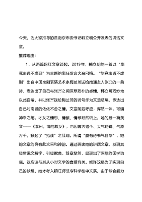 今天,为大家推荐的是南京市委书记韩立明公开发表的讲话文章。推荐理由:1.从两篇网红文章谈起。2019年,韩立明的一篇以毕竟南通不虚到为主题的离任发言火遍网络。毕竟南通不虚到出自中国京剧表演艺术家梅兰芳送给南通友人张謇的一首诗,表达出了自己与张謇之间深厚质朴的感情。韩立明巧妙地以此自喻,并以张謇送给梅兰芳的词句作为文章结尾,传达出自己对南通的依依不舍之情。文章前后呼应,浑然一体,可谓神来之笔,才女之情思、情愫、情感跃然纸上。她的另一篇美文——《泰州,海的故乡》,也因博古通今、大气磅礴、气象万千,掀起了抢读之壮观。所谓腹有诗书气自华,她的文章的确有此文采和神韵。通过研读她的讲话文章,发现其经常说文解字,引经据典,辞章斐然,展现出了深厚的国学功底。这应该与其从小对文学的喜爱有关。或许这是为了实现自己的梦想,她才考入镇江师范专科学校中文系。由于综合能力突出,她毕业直接留校,在校教研室工作5年。1989年,调入共青团系统,开启了从政之路。后担任常州市委办公室秘书、综合科副科长等职务,有效地将其文学创作功力转化为公文写作能力,实现了文学诗情才女向政务文稿大咖的华丽转身。2.从两个获奖作品谈起。离开大秘岗位后,她历任市广播电视局纪委书记、区委纪委书记、常务副区长、县级市市长、市委书记,以及市委组织部部长、常务副市长、市长、市委书记等职务,多年多领域的任职经历,丰富了其执政履历和体制阅历,使她深谙基层之道和管理之法。这种高超的领导艺术和娴熟的工作方法, 为其风生水起的从政之路保驾护航。2011年, 她撰写的 《党内基层民主实现途径初探》入选《纪念中国共产党成立90周年党建研讨会论文选编》;2012年,在创先争优长效机制理论研讨暨征文活动中,她撰写的文章《扎实推进四三三党建惠民工程》成功获奖。正如冰心所说:成功的花,人们只惊慕她现时的明艳!然而当初她的芽儿,文可居文库——海量学习资料,手机电脑均可下载www.wenkeju.com浸透了奋斗的泪泉, 洒遍了牺牲的血雨!特别是作为女性领导干部,无论是当大秘,还是当县区领导干部,付出往往与收获不能成正比。但是,多年基层的摸爬滚打,使其具备了较强的综合能力。她对经济发展非常有道,她主政溧阳时,带着溧阳天目湖白茶参加全国两会并进行推销,而今产值已突破3亿元;主打力推的生态经济建设也闻名遐迩。在南通期间,她接受了三个岗位的历练,担任组织部长时,市县乡两轮自下而上的换届顺利完成,基层党建工作频频出彩;担任常务副市长时,科学系统构建生态文明9+2工作体系,直面矛盾化解成长中的烦恼;担任市长时,主导的一枚印章管到底工作,得到了李克强总理的点赞。正是因为其工作业绩突出,2018年,成为泰州1996年建市以来首任女性市委书记;正是因为其工作业绩突出,2019年,被组织选派参加中央党校(国家行政学院)中青一班;正是因为其工作业绩突出,2019年,在履新一年多后,就再次被重用,被任命为南京市委副书记、市政府党组书记。文可居文库——海量学习资料,手机电脑均可下载www.wenkeju.com3.从两种语言特点谈起。在她的身上,有着女文人特有的婉转、细腻和悠长;也有着女强人特有的大气、豁达和洒脱。一方面,由于她具有较强的文字天赋和文学功底,词汇量丰富,精通并能娴熟运用文章的各类写作方法、表达方式、修辞手法,特别是能够巧妙且不留痕迹地进行整合,形成了风缴雪拌式的视觉冲击感和阅读体验感,特别是在传情达意的文章中,常常大义微言 绕梁三日。另一方面,她政务文字功底扎实,能够将自己对文字的理解,全面融合到政务文稿写作之中,形成了鲜明的写作特点,即:对论点非常重视,体现在文章中就是小标题提炼的精准、简练、准确,能够紧紧围绕小标题组织语言和内容,如:在与青年干部谈心时,因为泰州是海的故乡,就用了心中要有瀚海、眼前正是蓝海、挂帆直济沧海三个小标题来组织文章;对字词要求比较严格,体现在文章中就是不使用生僻字词和歧义词句;对文章质感和美感有一定标准,体现在文章中就是善于使用同义字词形成排比句式,善于使用明喻暗喻词语增加文字的形象性和生动性。如:在任职讲话时提出:干活干事、务实落实、亲民为民、勤政廉文可居文库——海量学习资料,手机电脑均可下载www.wenkeju.com政; 再如:在思想层面和工作层面实现三个跃升:跳出城河思维,跨过长江天堑,激活大海基因。同时,她还善于提炼有内涵的执政口号,如在溧阳时期,提出了仙水绝佳天目湖、感恩信义溧阳城的城市形象,敦厚如山、刚直如竹、纯净如水、清雅如茶的市民精神,等等。她的受中国文化传统的仁义礼智信影响较深,通过研究其讲话文章,发现她经常引用先哲的话进行自省、自警