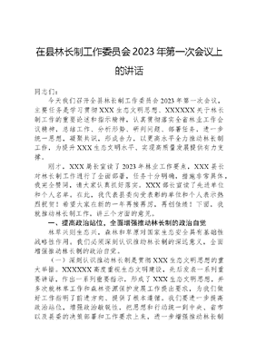 在县林长制工作委员会2023年第一次会议上的讲话同志们:今天我们召开全县林长制工作委员会2023年第一次会议,主要任务是学习贯彻XXX生态文明思想、XXXXXX关于林长制工作的重要论述和指示精神,认真贯彻落实全省林业工作会议精神,总结工作、分析形势、研判问题、部署任务,进一步统一思想,凝聚共识,形成合力,以更高水平全力推动林长制工作,为提升XXX生态文明水平、实现高质量发展提供有力支撑。刚才,XXX局长宣读了2023年林业工作要点,XXX县长对林长制工作进行了全面部署,任务十分明确,措施非常具体,我完全赞同,请大家认真抓好落实。XXX部长宣读了先进单位和个人名单。在此,我代表县委向受表彰的单位和个人表示热烈祝贺!希望大家在新的一年再接再厉,再创佳绩!下面,我就推动林长制工作,讲三个方面的意见。一、提高政治站位,全面增强推动林长制的政治自觉林草兴则生态兴,森林和草原对国家生态安全具有基础性战略性作用。我们必须深刻认识推动林长制的深远意义,全面增强推动林长制的政治自觉。(一)深刻认识推动林长制是贯彻XXX生态文明思想的重大举措。XXXXXX高度重视生态文明建设,先后发表一系列重要讲话,作出一系列重要指示,形成了XXX生态文明思想,并多次就林草工作和森林资源保护发展工作提出要求,为我们做好工作指明了前进方向、提供了根本遵循。我们要进一步提高政治站位,增强政治敏锐性,把思想和行动统一到中央、省市以及县委的决策部署和工作要求上来,进一步增强推动林长制的责任感使命感,统筹推进森林草原湿地整体保护、系统修复、综合治理,实现生态、生产、生活融合发展,促进人与自然和谐共处。(二)深刻认识推动林长制是贯彻上级决策部署的具体行动。过去的一年,全县上下认真贯彻省总林长会以及省市林长制工作推进会、调度会等会议精神,扎实践行绿水青山就是金山银山理念,建立了县、乡、村三级林长制体系,全面构建了一长四员网格化管护体系,基本形成了权责明确、保障有力、监管严格、运行高效的林草资源保护发展机制,为我县林业事业高质量发展提供了有力的制度支撑,取得了较好的工作成效。但我县在全省林长制工作真抓实干督查激励中未能获得奖励,说明这项工作还有差距。对此,我们要认真对照省市要求,认真分析原因,查找根源,坚持问题导向,切实改进工作作风,创新工作方式方法,力争今年实现新突破。(三)深刻认识推动林长制是推动XXX高质量发展的现实需要。当前,我县全面推行林长制取得了阶段性成果,但要让林长制充分发挥作用,切实提升森林、草原和湿地等生态系统功能,完成《XXX县全面推行林长制实施方案》中明确的2025年和2035年目标,还需要付出更多的努力。在推行林长制的过程中,部分单位和林长存在认识不清、思考不够、消极应付,工作推动滞后。部分林长在履职过程中存在一定的形式主义,重视会议布置与文件要求,而在一线调研工作、落实技防人防层面做得还不够,发现问题、解决问题能力不足。我们要进一步健全以党政领导负责制为核心的责任体系,从严压实各级林长责任,充分发挥林长制一长四员作用,推动全县林长制工作走深走实。要把全面推行林长制作为林业工作的重中之重,以更坚定的决心、更有力的举措,坚定不移推动林长制改革不断走深走实,以林长制促进林长治。二、坚持真抓实干,奋力谱写践行两山理念的美丽篇章我们必须践行绿水青山就是金山银山理念,聚焦关键领域,加大工作力度,从严从紧压实全县各乡镇、各相关部门林长制工作责任,实现林长制工作从全面建立向全面见效转变,确保林长制沿着更加高效的正确轨道运行,并争取获得全省林长制工作真抓实干督查激励。(一)健全体制机制,创新工作方式。在落实林长制工作中,最后一公里的林草资源管护责任尚未完全落地,尤其是在解决林草资源保护的内生动力、长远发展、统筹协调等问题方面,存在一定的体制机制障碍。我们要以林长制为抓手,统筹各方力量,打破行业界限,探索建立林长制工作新模式,如林长+检察长民间林长等。进一步完善工作机制,建立党委领导、党政同责、属地负责、部门协同、源头治理、全域覆盖的林草资源保护发展长效机制。对一些相关的制度和规定,该修订的修订,该建立的抓紧建立;对一些乡镇(街道)重点难题该考核的加大比重考核;对一些林长该激励的激励,切实形成各方面齐抓共管的林草工作新格局。(二)坚持问题导向,完善保护系统。要坚持问题导向,因地制宜健全各项配套制度,从部门责任分工、人员调配、财力保障、运行机制等方面强化林草资源保护的内生动力。要精准开展林草资源修复,科学实施生态保护修复工程,加快恢复森林、草原、湿地等生态系统,持续推进自然保护地环境问题整治,着重加强生态环境敏感脆弱区的林草资源保护,加强水土保持、减少水土流失,不断强化生态系统整体功能。(三)夯实法治根基,强化执法力量。今年,
