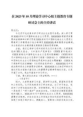在2023年10月理论学习中心组主题教育专题研讨会上的主持讲话同志们:今天召开这次集中学习研讨会议主要任务是:深入学习贯彻XXX新时代中国特色社会主义思想、XXXXXX视察河南重要讲话精神和对学习贯彻XXX新时代中国特色社会主义思想主题教育工作重要指示批示精神及XXXXXX最新重要讲话精神,为全县经济社会高质量发展提供坚强的思想保障。会前,我们已将学习资料发给同志们开展自学,大家围绕党的XX大报告、《中国共产党章程》《XXX著作选读》《XXX新时代中国特色社会主义思想专题摘编》《XXX新时代中国特色社会主义思想学习纲要(2023版)》《XXX新时代中国特色社会主义思想的世界观和方法论专题摘编》《XXX关于调查研究论述摘编》《论党的自我革命》、XXXXXX在中央政治局常委会上的重要讲话精神、XXXXXX在主持召开新时代推动东北全面振兴座谈会上的重要讲话精神等相关内容,认真开展了自学,现在开展集中学习研讨。下面,请大家依次发言(发言顺序:……)(发言毕)刚才,大家聚焦学习内容、紧扣研讨主题,紧密联系思想和工作实际,从不同角度进行了研讨发言,谈了学习体会、收获和下步贯彻落实的打算,讲得都很好,听了之后很受启发。一是体现了两个维护的政治自觉。大家的发言都紧紧围绕党的XX大、XXX新时代中国特色社会主义思想、XXXXXX重要讲话精神,并结合各自工作领域分享如何抓好贯彻落实,体现了体现了维护核心、拥戴核心、紧跟核心的坚定政治自觉。二是体现了深学细悟的思想自觉。大家的发言均从如何抓好学习,认真领悟XXXXXX重要讲话精神,坚持多思多想、学深悟透,联系工作实际,立足工作岗位,学以致用,同时结合自己工作开展情况进行反思领悟,体现了切实将学习实践走深走实的思想自觉。三是体现了知行合一的行动自觉。大家结合各自分管工作,从分管负责工作实际,自觉将XXX新时代中国特色社会主义世界观、方法论用于指导工作实际,提出切实可行的工作计划和工作安排,体现了学思用贯通,知信行统一的行动自觉。下面,我从以下两个方面和大家共同交流学习。一、深入学习领悟XXX新时代中国特色社会主义思想世界观和方法论并用于指导工作实践(一)在理论学习上下功夫。要坚持常学常新,深研细悟;XXXXXX强调,当今时代,知识更新周期大大缩短,各种新知识、新情况、新事物层出不穷,如果我们不努力提高各方面的知识素养,加快知识更新,优化知识结构,拓宽眼界视野,就难以适应知识经济时代的要求,我们干部要上进,就必须大兴学习之风,坚持学习、学习、再学习,要将学习作为终身伴侣。我将在接下来的工作中,将常态化坚持学习XXX新时代中国特色社会主义思想,学习XXXXXX各个时期重要讲话精神,坚持读原著、学原文,悟原理,坚持逐字逐句,逐节逐章,深研细悟,认真做好研读笔记,扎实做到每一次阅读都有新的收获,每一次阅读都有新的理解,每一次阅读都有新的感悟,切实做到常学常新,深学细悟。要坚持理论联系实际。理论联系实际,是我们党的一贯坚持的优良作风,是我们党的丰富创造力和增强战斗力的关键所在,坚持理论联系实际就是要坚持联系工作实际、联系思想实际,做到学以致用、用以促学,用党的创新理论武装头脑、指导实践、推动工作。我将在接下来的工作中,坚持以XXX新时代中国特色社会主义思想世界观和方法论联系实际分管工作,联系思想实际,通过理论学习增强行动力,以扎实的理论基础指导工作实践。要坚持带着问题学,注重问题解决。问题像一面镜子,能照出工作中存在的弊端,带着问题学,才能在发现问题、分析问题、解决问题过程中不断成长进步,提升政治素养和业务能力。我将在学习的过程中,不断思考自身工作以及分管领域工作存在的问题,带着问题在学习的过程中寻找指导方法,将问题解决作为学习结果的检验,不断推动理论学习走深走实。(二)在调查研究上下功夫。要坚持躬身力行,深入一线;XXXXXX强调,要大兴调查研究之风,多到分管领域的基层一线去,多到困难多,群众意见集中,工作打不开局面的地方去,体察实情,解刨麻雀,全面掌握情况,做到心中有数。我将坚持以XXXXXX关于调查研究的重要讲话精神为指导,躬身力行,亲自到基层一线,亲自到困难多,意见集中地区深入了解实情,带着问题开展调研,深入了解群众所需所盼,精准查找工作中的不足和问题根源,以扎实的调查研究推动工作开展。坚持问题导向,强化问题意识。坐在办公室碰到的都是问题,下去开展调研看到的都是办法,我将坚持在调查研究的过程中坚持问题导向,带着问题调研,以问题作为切入点精准查找工作中的不足和问题根源,坚持调要看得清、看得准、抓住问题,研要想得深、分析透、解决问题,始终将调查研究作为科学决策的重要依据、联系群众的重要途径和做好工作的重要方法。坚持结果真而实,推动成果转化。调查研究报告是否能解决当前问题,关键在推