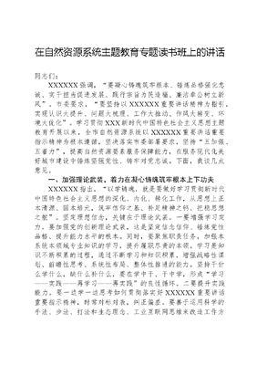 在自然资源系统主题教育专题读书班上的讲话同志们:XXXXXX强调,要凝心铸魂筑牢根本、锤炼品格强化忠诚、实干担当促进发展、践行宗旨为民造福、廉洁奉公树立新风。市委要求,要坚持以XXXXXX重要讲话精神为指引,实现认识大提升、问题大梳理、工作大推动、作风大转变、环境大优化。学习贯彻XXX新时代中国特色社会主义思想主题教育开展以来,全市自然资源系统以XXXXXX重要讲话重要指示精神为根本遵循,坚决落实市委部署要求,坚持五加强、五着力,提高自然资源要素服务保障能力,在服务现代化美好城市建设中锤炼坚强党性、铸牢对党忠诚。下面,我谈几点意见。一、加强理论武装,着力在凝心铸魂筑牢根本上下功夫XXXXXX指出,以学铸魂,就是要做好学习贯彻新时代中国特色社会主义思想的深化、内化、转化工作,从思想上正本清源、固本培元,筑牢信仰之基、补足精神之钙、把稳思想之舵。坚定理想信念,关键在于理论武装。一要增强学习定力。要加强党的创新理论武装,这是坚定信念信仰、锤炼党性品格、提升能力水平的根本。同时,要聚焦职责任务,加强本系统本领域专业知识的学习,提升履职尽责的本领。学习是知识不断积累的过程,通过不断学习和知识积累,增强战略性谋划、前瞻性思考、系统性布局、整体性推进的能力。坚持干什么学什么,缺什么补什么,要在学中干、干中学,形成学习——实践——再学习——再实践的良性循环。二要提升实践能力。要一边学一边思考如何贯彻落实好XXXXXX重要讲话重要指示精神,时常对标对表,纠正偏差。要善于运用科学的手法、步法、打法和生态理念、工业互联网思维来改造工作方法和流程,既不能刻舟求剑、封闭僵化,也不能照抄照搬、食洋不化。三要改造思想方法。XXXXXX在视察中办的时候强调,对党中央作出的决策、部署的工作、定下的事情,要雷厉风行、紧抓快办,扭住不放、一抓到底。在具体落实的过程中,要站在前沿、感知前沿、认识前沿,改造思想方法,增强系统思维,赋能工作提升。四要强化全局意识。站在全局和战略的高度想问题、办事情,体现的是一种观大事、顾全局、谋长远的工作能力,是科学世界观、方法论在实际工作中的运用,也是新时代党员干部特别是领导干部必备的基本素养。要深刻理解自然资源部门在党和国家事业发展全局中的定位、内涵和作用,从全市发展大局出发思考如何服务于新发展格局、保障三地一区目标的实现、助力现代化美好城市建设。二、加强政治历练,着力在锤炼品格强化忠诚上下功夫XXXXXX强调,以学增智,就是要从党的科学理论中悟规律、明方向、学方法、增智慧,把看家本领、兴党本领、强国本领学到手。在干部干好工作所需的各种能力中,政治能力是第一位的。一要持续在提高政治判断力上用力。XXXXXX强调,增强政治判断力,就要以国家政治安全为大,以人民为重,以坚持和发展中国特色社会主义为本,增强科学把握形势变化、精准识别现象本质、清醒明辨行为是非、有效抵御风险挑战的能力。提高政治判断力,重点解决的是立场观点的问题,是对坚持什么、摒弃什么的科学判断,是对拥护什么、反对什么的清醒认知,是对该干什么、不该干什么的正确选择。二要持续在提高政治领悟力上用力。只有不断强化理论思维,提高政治领悟力,才能自觉运用XXX新时代中国特色社会主义思想的世界观和方法论,深刻领会党中央决策部署,吃透市委市政府和自然资源厅的工作要求,才能真正践行好两个维护,做到对国之大者了然于胸、对市之大计心中有数。三要持续在提高政治执行力上用力。提高政治执行力,所有工作都要在XXXXXX的重要讲话重要指示中找依据、找方向、找方法、找标准,要经常同党中央精神对标对表,认真贯彻落实市委市政府决策部署,精心绘好施工图,真正做到XXX有号令、党中央有部署,我市见行动,自然资源见成效。三、加强实践锤炼,着力在实干担当促进发展上下功夫XXXXXX指出,中国式现代化是人与自然和谐共生的现代化必须牢固树立和践行绿水青山就是金山银山的理念,站在人与自然和谐共生的高度谋划发展。新时代新征程,必须聚焦自然资源两统一核心职责和四个基本定位,担当作为、推动发展。一要在严守资源安全底线上下功夫。自然资源部门工作涉及粮食、能源资源、国土等重大安全,肩负重要使命,要牢牢守住耕地红线,加强矿产资源保护,强化测绘地理信息安全,加强地质灾害防治,夯实粮食、能源资源、地理信息数据等安全保障体系,提高安全发展能力。二要在优化国土空间格局上下功夫。坚持系统观念,强化底线约束,搞好顶层设计,不断完善国土空间规划体系,严格国土空间用途管制,扎实推进全域土地综合整治,推动构建优势互补、高质量发展的区域经济布局和国土空间体系,服务全市重大战略实施和区域协调发展。三要在促进绿色低碳发展上下功夫。完整、准确、全面贯彻新发展理念,切实站在人与自然和谐共生的高