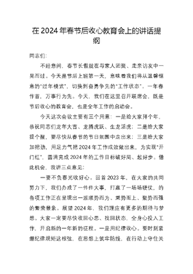 在2024年春节后收心教育会上的讲话提纲同志们:不经意间,春节长假就在与家人团聚、走亲访友中一晃而过。今天是节后上班第一天,意味着我们将从温馨惬意的过年模式,切换到奋勇争先的工作状态。一年春作首,万事行为先。今天,我们在这里召开联席会,既是节后收心的教育会,也是全年工作的启动会。今天这次会议主要有三个用意:一是给大家拜个年,恭祝同志们龙年大吉、龙腾虎跃、生龙活虎;二是给大家提个醒,要尽快从春节的节日氛围中走出来;三是给大家加把劲,用足力气把2024年工作成效做出来,为实现开门红,圆满完成2024年的工作目标破好局、起好步。借此机会,我讲三点意见: 一要不负春光收好心。回首2023年,在大家的共同努力下,我们办成了一件件大事,打赢了一场场硬仗,的各项工作正在呈现出一派顺势而为、乘势而上、聚势而强的繁荣景象。展望2024年,我们理应有更多的期待与梦想。大家一定要尽快收回心思、找回状态,全身心投入工作,开启新的一年新的征程。一是用纪律收心。要时刻紧绷纪律规矩这根弦,在思想上筑牢防线,在行动上守住关口,把纪律和规矩挺在前面,特别是回到工作岗位后,大家一定要给自己拉满弓、紧好弦,做政治上的清醒人、工作上的明白人、生活中的局内人,请镇党委督查办和镇纪委近期加大督查检查力度。二是用责任收心。区委经济工作会议在年前已召开,2024年的各项工作正在朝着既定的目标稳步推进。立足新起点,再创新辉煌。大家要紧紧围绕一链一片一点发展目标,切实增强工作责任感和使命感,把心思和行动统一到党委政府的安排部署上来,立足自身工作岗位,认真履职尽责。三是用榜样收心。春节期间,各项生产生活正常运转,没有发生一起安全事故,这正是因为部分同志还坚守在工作岗位上,默默守护着。他们爱岗敬业的精神和集体责任感,就是我们学习的典范。大家要以他们为榜样,迅速调整精神状态,以崭新的面貌对待新一年的工作。借此机会,我再强调一句,在作风转变上,希望我们每一位领导干部都要做知行合一的模范,领导干部更要身体力行,各部门的负责人也要率先垂范,树立起言出必行、有诺必践的良好形象。二要突出重点起好步。面对千头万绪的各项工作,我们既要善于统筹协调,更要突出重点。要抓好工作部署。古人讲:凡事预则立,不预则废。本着早部署、早见效的原则,各级各部门要尽快把开年各项重点工作任务梳理出来、安排下去,全力以赴拼开局、抢进度,推动各项政策措施早出台、任务部署早落地、工作安排早见效,确保实现开门红全年红。要抓好项目建设。项目是经济发展的重要载体,是拉动经济增长最直接、最有效的手段。从这个意义上讲,上项目是抓经济发展的第一要务,是重点之重点,中心之中心。今年计划实施的项目要加快进度,争取在本月结束前实质性开工,尽快出进度、出形象,做好参加全市项目拉练的各项准备。同时,要想尽一切办法,用尽所有智慧,在招商引资、跑项争资上多下功夫、下大功夫,争取引进更多吹糠见米的优质项目,推动更多项目纳入国、省项目资金盘子。要抓好春耕备耕。有句话说得好,叫人勤春来早,现在是春耕备耕的大好时机,农业农村部门要牵头筹备好全区春耕生产急需的种子、化肥、地膜、农药等农用物资,督促做好农资储备调运和农机检修工作。会同相关部门,积极帮助农户解决春耕备耕和农业生产遇到的问题。要抓好会议筹备。近期,我们将召开区委经济工作会、区纪委全会、干部读书班等系列全区性的大会。各牵头部门要拟定好会议方案,草拟好会议材料,用心做好相应准备,两办要抓好统筹协调,共同把这几场会议筹备好、办出彩。三要鼓足干劲开好局。近期又准备召开一系列会议,一季度留给我们抓落实的时间已经很紧张了。要实现开门红目标,需要我们鼓足更大干劲、下足更大苦功。要永葆干事激情。精神决定状态,激情决定斗志。新年新气象,我们要坚持干字当头、奋勇争先,保持一往无前的冲劲闯劲,激发热血沸腾的激情,敢想、敢做、敢当,干出热火朝天的氛围,干出事争一流的气象。要主动知责担当。干部的担当程度,决定着事业发展的成就。我们要敢于担当、勇于担当、善于担当,坚决杜绝回避问题、上交矛盾,推诿扯皮、相互推脱,敢于接最烫手的山芋,敢于啃最硬的骨头,关键时候站得出来、冲在前面。要坚持团结奋斗。团结奋斗是贯穿二十大报告的一个主题词。在当前区域竞争日益激烈的环境下,要在竞争中赢得主动、占得先机,就需要我们全区上下同心同德、团结协作、众志成城。各级各部门班子成员必须搞好团结,做到相互补台不拆台,相互补位不越位,相互取长不取短,寻求最大公约数、画出最大同心圆,凝心聚力干出开门红、实现全年红。同志们,习近平总书记在新年贺词中指出,我们的目标很宏伟,也很朴素,归根到底就是让老百姓过上更好的日子。孩子的抚养教育,年轻人的就业成才,老年人的就医养老,是家事也是国事,大家要共同努力,