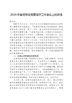 2024年省领导在民营经济工作会议上的讲话同志们:2023年3月6日,习近平总书记在看望参加政协会议的民建工商联界委员时指出:民营经济是我们党长期执政、团结带领全国人民实现两个一百年奋斗目标和中华民族伟大复兴中国梦的重要力量。改革开放以来,在党的方针政策指引下,我国民营经济从小到大、从弱到强,不断发展壮大,成为推动我国发展不可或缺的力量,为创造中国发展奇迹作出了不可磨灭的贡献。党的十八大以来,习近平总书记关于发展民营经济的重要论述为推动新时代我国民营经济发展提供了科学指导和根本遵循。必须坚持以习近平经济思想为指导,深入学习和全面贯彻习近平总书记关于发展民营经济的重要论述思想精髓,破除各种思想障碍,深化体制改革,进一步推动我国民营经济高质量发展。一、正确认识民营经济的性质改革开放春风拂,民营经济应时生。回眸1978年,当时我国是世界上最贫穷的国家之一,占全球总人口68.04%、约6.5亿人生活在国际贫困线标准以下,日生活费不足1.25美元。站在历史潮头的中国改革开放总设计师邓小平高瞻远瞩,将改革开放作为中国现代化建设的突破口:革命是解放生产力,改革也是解放生产力。在解放思想、实事求是思想的指引下,我们认识到过去几十年建立起来的公有制经济和计划体制所存在的缺陷和弊端,改革开放可谓势在必行、应时而生。从本质上看,改革开放就是逐步认识、承认、确立市场机制对资源配置基础性地位的过程,也是逐步认识、承认、培育、确立和保护民营经济市场地位和功能的过程。1979年4月,国务院批准《关于全国工商行政管理局长会议的报告》,明确不能把小商品经济和资本主义等同起来,不能把正当的家庭副业当作资本主义的尾巴去割,不能把国家允许的集市贸易当作资本主义道路去堵,开始恢复集市放开城市农副产品市场。1980年12月,温州颁发了中国第一张个体工商户营业执照,当年全国批准新开业个体工商户就达到10万户。1981年,党的十一届六中全会《关于建国以来党的若干历史问题的决议》指出:一定范围内的劳动者个体经济是公有制经济的必要补充,1982年12月《中华人民共和国宪法》修订规定:在法律规定范围内的城乡劳动者个体经济,是社会主义公有制经济的补充,国家保护个体经济的合法权利和利益。同时,伴随着个体经济中雇佣工人、资本积累等生产关系的出现,手工、建筑、运输等行业的民营经济(其时主要用私营经济一词)也逐渐发展起来,1987年1月在《关于把农村改革引向深入的决定》中正式提出对私营经济也应当采取允许其存在、加强管理、兴利除弊、逐步引导的方针,并在同年10月党的十三大报告中进一步明确了把私营经济、中外合资合作经济、外商独资经济同个体经济一起作为公有制经济的必要和有益的补充的方针。而后,在1988年《中华人民共和国宪法修正案》中增加国家允许私营经济在法律规定的范围内存在和发展,私营经济是社会主义公有制经济的补充,从宪法高度确立了私营(民营)经济的合法地位。正确认识我国民营经济的性质,需要从我国社会主义初级阶段基本经济制度出发,深刻理解民营经济与公有制经济的关系。马克思曾经指出:在一切社会形式中都有一种一定的生产决定其他一切生产的地位和影响,因而它的关系也决定其他一切关系的地位和影响。这是一种普照的光,它掩盖了一切其他色彩,改变着它们的特点。我国实行的是公有制为主体多种所有制经济共同发展的所有制制度,占主体地位的公有制就是社会主义社会的普照的光,它决定着社会主义社会的性质,并决定着其他所有制经济成分的地位和影响。正是依据马克思主义政治经济学的基本理论和方法,党的十八大以来,习近平总书记多次重申坚持基本经济制度,坚持两个毫不动摇。习近平总书记深刻指出:基本经济制度是我们必须长期坚持的制度。民营经济是我国经济制度的内在要素,民营企业和民营企业家是我们自己人。我们强调把公有制经济巩固好、发展好,同鼓励、支持、引导非公有制经济发展不是对立的,而是有机统一的。公有制经济、非公有制经济应该相辅相成、相得益彰,而不是相互排斥、相互抵消。我国基本经济制度写入了宪法、党章,这是不会变的,也是不能变的。任何否定、怀疑、动摇我国基本经济制度的言行都不符合党和国家方针政策,都不要听、不要信!在全面建设社会主义现代化强国的新征程上,必须坚持完善社会主义初级阶段基本经济制度,毫不动摇地巩固和发展公有制经济,毫不动摇地鼓励、支持和引导包括民营经济在内的非公有制经济发展。二、正确认识民营经济的地位公有制为主体、多种所有制经济共同发展的基本经济制度是中国特色社会主义制度的重要组成部分,也是完善社会主义市场经济体制的必然要求。改革开放以来,民营经济已经成为推动发展不可或缺的力量,成为创业就业的主要领域、技术创新的重要主体、国家税收的重要来源