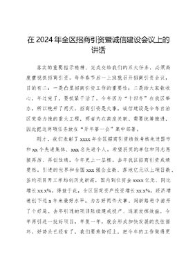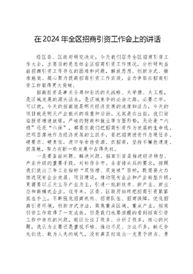 在2024年全区招商引资暨诚信建设会议上的讲话落实的重要指示精神、完成交给我们的五大任务,必须高度重视抓招商引资。每年春节后一上班就召开招商引资会议,目的有二:一是凸显招商引资工作的重要性;二是给大家收收心,年过完了,要抓紧干活了。今年因为十四冬在我区举办,所以晚开了两天。招商引资是大事,诚信建设是今年自治区党委力推的重大工程,两者内在高度关联、需要统筹推进,因此把这两项任务放在开年第一会集中部署。刚才,我们表彰了xxxx年全区招商引资绩效考核先进盟市和xx个先进集体、xxx名先进个人。希望获奖的单位和同志再接再厉、再创佳绩,今年更上一层楼。去年我区招商引资成绩斐然,引进的世界和全国xxx强企业数、落地亿元以上项目数、签约项目开工率均创历史新高,国内到位资金xxxx亿元、同比增长xx.x%。得益于此,全区固定资产投资增长xx.x%,经济增速创下近x年来最好水平,为办好两件大事、闯新路进中游开了个好局。去年引进的项目陆续建成投产、逐渐发挥效益,今年再引进一批好项目,年复一年,就会形成加快发展的良性循环。好势头已经有了,我们要乘势而上,把今年的工作做得更好。这里,我提几点要求。一、要全力完成年度目标任务今年我们要实现地区生产总值增长x%以上的目标,一个极为重要的支撑就是完成引进固定资产投资xxxx亿元的任务。现在,各盟市的年度招商引资目标任务已经明确,自治区政府已下达任务书,任务书就是军令状,各地区各部门要排除万难圆满完成。要大力弘扬吃苦耐劳、一往无前,不达目的绝不罢休的x古马精神,学习当年的xx地区干部,走遍千山万水、想尽千方百计、说尽千言万语、吃尽千辛万苦,跳起来摘桃子,铆足劲向前冲,力争取得更好成绩。二、要以到位资金和开工项目论英雄切实转变过分看重对接企业场次、签约合同份数、意向投资数量的思维,把资金到位、项目落地情况作为评价招商引资成效的根本指标,各地区各有关部门要拿出更多精力同目标企业深入洽谈,推动意向变为合同,项目落地、资金到位。自治区到年中、年底收卷、判卷,主要就看资金到位多少、项目建设快慢,对干得好的予以重奖。有关方面要进一步优化招商引资考核办法,减少没有实际意义的指标和奖项设置,化繁为简,不搞平衡照顾,精、准、实地考评奖励,惩罚措施也要考虑进来。总之,一切拿结果说话、用实效评价。三、要坚决反对形式主义招商引资想要结实果,工作过程中就不能玩半点虚的各级都要少干那些漫无目的去撒网、频繁盲目往外跑的事,不要把精力放在热热闹闹搞活动上,多在靶向对接上下功夫,尽可能采取点对点的办法精准招商,突出重点、选准目标,力争谈一户签一户、签一户落一户。要严禁搞作秀式的招商大会、签约仪式、对接活动,坚决杜绝拿签约数充门面、多个地方与同一个项目重复签约等现象。对确有必要举办的招商活动,也要注重简约务实,能交给企业、群团组织和社会组织办的尽量交给他们去办。形式主义害死人、累死人。借今天的场合,我想就反对形式主义再多说几句。不仅是招商引资,我们其他各项工作都要务实求实,强化结果意识,瞪大眼睛盯结果,有结果才是最好的过程。没有结果的过程,再精彩,也只能开出中看不中用的谎花。现在全区上下有个比较普遍的现象,也可以说是通病,就是一说某项工作重要,喜欢就成立专班、摆开架势,讲足排场后再慢慢悠悠展开。其实很多事没有必要成立专班,按正常机制办就行了,不要动不动就搞个班套拉人马,甚至把没有多少关系的单位和人员也拽上,造成不必要的人力物力浪费。我到下面调研,有的旗县实施温暖工程还成立个专班,而且还是双组长,拉了一大堆部门单位进来,真的有这个必要吗?自治区一级事情比较多、部门也多,有些工作确需成立议事协调机构,盟市、旗县一级就不要照着来了,按照正常的机制和分工,该怎么干就怎么干,该谁干就谁干。形式主义之所以屡禁不止,一个是传染,一个是传导,再一个就是被逼迫。去年我们结合整治三多三少三慢问题,对苏木乡镇职能职责进行了精减优化,今年要把嘎查村一级承担的事务大幅往下砍一砍。各个部门的手要少往村里伸,必要的工作也不要搞一大堆台账、频繁检查调度,弄得村干部每天疲于应付、没心思给老百姓服务。自治区将把这项工作作为整治形式主义的重要内容,各盟市、旗县委书记要重视这个问题,当回事去抓。四、要做好落地服务的后半篇文章招商引资,让企业安得下、能扎根、发展好是最终目的。要下大力气大幅度压缩项目审批办理时间,通过建立健全项目手续领办、代办和并联审批机制等,从落地、建设到运营全方位全流程跟踪服务,尽最大努力让项目快投产快见效。要像对待自家的事一样为企业排忧解难,充分发挥x企通等平台的作用,对企业反映的问题迅速核实、随接随办、清单管理、限时销号。要公平对待外来企业和本土企业、国有企业和民营企业、大企业和小企业,做到所有优惠