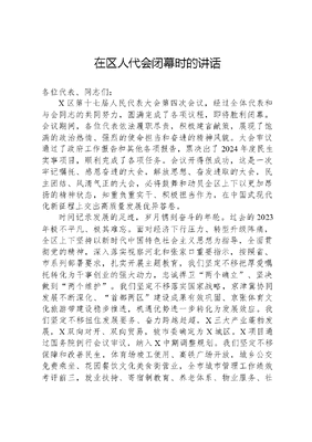 在区人代会闭幕时的讲话各位代表、同志们:X区第十七届人民代表大会第四次会议,经过全体代表和与会同志的共同努力,圆满完成了各项议程,即将胜利闭幕。会议期间,各位代表依法履职尽责,积极建言献策,展现了饱满的政治热情、强烈的使命担当和奋进的精神风貌。大会审议通过了政府工作报告和其他各项报告,票决出了2024年度民生实事项目,顺利完成了各项任务。会议开得很成功,这是一次牢记嘱托、感恩奋进的大会,解放思想、奋发进取的大会,民主团结、风清气正的大会,必将鼓舞和动员全区上下以更加昂扬的精神状态,知重负重实干、积极担当作为,在中国式现代化新征程上交出高质量发展优异答卷。时间记录发展的足迹,岁月镌刻奋斗的年轮。过去的2023年极不平凡、极其难忘。面对经济下行压力、转型升级阵痛,全区上下坚持以新时代中国特色社会主义思想为指导,全面贯彻党的精神,深入落实视察河北和张家口重要指示,按照省、市系列部署要求,扎实开展主题教育,我们坚定不移把厚爱嘱托转化为干事创业的强大动力,忠诚捍卫两个确立、坚决做到两个维护。我们坚定不移落实国家战略,京津冀协同发展不断深化、首都两区建设成果有效巩固、京张体育文化旅游带建设稳步推进,机遇优势进一步转化为发展效应。我们坚定不移扭住发展要务、奋力跨越赶超,X三大产业蓬勃发展,X双向对开、双向贸易,被市委确定为X城区。X项目通过国务院例行会议审议,纳入X中期调整规划。我们坚定不移保障和改善民生,体育场竣工使用、高铁广场开放,城乡公交免费乘坐、花园餐饮文化美食街营业,全市城市管理工作绩效考评前三,就业扶持、寄宿制教育、养老体系、物业服务、社会保险五个全覆盖成效显著。我们坚定不移狠抓末端落实,以找差距、找问题、找短板为抓手,强化建章立制,干事创业精气神全面提振。成绩的取得,是以同志为核心的党中央掌舵领航的结果,是市委、市政府坚强领导的结果,是全区广大干部群众不懈努力的结果,也凝聚着各级人大组织和各位人大代表的智慧力量。特别是,过去一年,区人大及其常委会,牢牢把握新时代人大工作新要求,政治站位有高度、助推发展有力度、服务群众有温度、代表履职有热度,充分发挥人大代表主体作用,深入践行全过程人民民主,在推动制度优势更好转化为治理效能上做了大量卓有成效的工作,对大家的工作,区委充分肯定。在此,我代表区委,向全体人大代表、人大常委会班子及社会各界,致以崇高的敬意和由衷的感谢!各位代表、同志们。今年是新中国成立75周年,是全国人民代表大会成立70周年,是实现十四五规划目标任务的关键一年,也是X加快高质量发展的重要一年,做好今年工作使命重大、意义重大。区委十一届五次全会对今年工作作出了全面安排部署。这次大会审议通过的《政府工作报告》,进一步明确了全区工作的任务书,制定了精准的施工图,使区委的部署,通过法定程序转化为全区人民的共同意志、共同目标、共同行动。我们要坚定必胜信心,保持战略定力,奋力开创全区经济社会高质量发展新局面。下面,我讲3点希望和要求。一、铸牢忠诚品格,以更强定力砥砺前行。旗帜引领方向,核心凝聚力量,讲政治是党员干部的立身之本,也是人大代表依法正确履职的必然要求,必须坚定不移把党的领导体现在行动上、落实在工作中。一要铸牢政治忠诚。深刻领悟两个确立的决定性意义,把坚定拥护两个确立转化为坚决做到两个维护的思想自觉、政治自觉和行动自觉,确保人大各项工作与上级决策部署同频共振。二要坚定政治信仰。坚持以新时代中国特色社会主义思想武装头脑、指导实践、推动工作,深入学习、全面贯彻党的精神和视察河北、视察张家口重要讲话和重要指示要求,更加自觉地从中找方向、找方法、找思路,确保各项工作始终沿着党中央和指引的方向奋勇前进。三要保持政治定力。始终胸怀两个大局、心系国之大者,不断增强政治判断力、政治领悟力、政治执行力,自觉在大局中思考和谋划工作,把重要讲话重要指示批示精神、党中央决策部署和省委、市委工作要求作为做好一切工作的根本遵循,认真对标对表,紧密联系实际,把具体化、时限化、责任化体现到谋划和推进工作的各方面、全过程,切实转化为推动高质量发展的创新举措和实践成果。二、聚焦中心工作,以更实举措担当履职。把坚持高质量发展作为新时代的硬道理,完整、准确、全面贯彻新发展理念,积极融入和服务构建新发展格局,齐心协力推动各项事业发展迈上新台阶。一要在落实国家重大战略上取得新成效。一是深度融入京津冀协同发展大局。主动对接北京疏解项目和中关村等创新策源地,牢牢牵住承接北京非首都功能疏解这个牛鼻子,坚持数量质效双向发力,资源再盘点、招引再精准、保障再有力,力争从北京迁入或新注册三级子公司3家,借势借力加快自身发展。同时,以垣创科技、常欣医疗等北京转移企业为平台,强化敲门招商、一对一招商、专班招商等方式,瞄准北京昌平