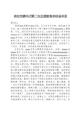 高校党委书记第二批主题教育总结会讲话同志们:按照xxx部署和xxx安排,从去年9月开始,我院xx个党总支、xx个基层党支部参加了第二批学习贯彻xxxxxxxx主题教育。今天,我们召开全院总结会议,主要任务是深入学习贯彻xxxxxx关于主题教育重要讲话和重要指示批示精神,贯彻落实xxxx和全省、全市主题教育总结会议精神,全面总结我院主题教育工作,对巩固拓展主题教育成果进行安排部署,引导广大党员干部持续在以学铸魂、以学增智、以学正风、以学促干上下功夫、求实效,加快推进学院高质量发展。2月4日,xxxx召开主题教育总结会议。会前,xxxxx在xxxxx审议《关于在全党深入开展学习贯彻xxxxxxxxxxxxxx主题教育总结报告》《关于巩固拓展学习贯彻xxxxxxxxxxxxx主题教育成果的意见》时发表重要讲话。xxx指出,主题教育启动以来,全党紧扣学思想、强党性、重实践、建新功总要求,聚焦主题主线,明确目标任务,突出以学铸魂、以学增智、以学正风、以学促干,与做好开局之年工作紧密结合,特别是着力解决制约高质量发展问题、群众急难愁盼问题、党的建设突出问题,达到预期目的,取得明显成效。xxx强调,要巩固拓展主题教育成果,抓好意见落实,形成长效机制。要持续加强理论武装,教育引导党员干部通过坚持学习党的创新理论,悟规律、明方向、学方法、增智慧,固本培元、凝心铸魂,进一步打牢党的团结统一的思想基础。要持续推动解决问题,继续抓好整改整治、建章立制,让人民群众切实感受到解决问题的实际成效,让人民群众有获得感。要持续改进作风,落实四下基层,坚持和发展新时代枫桥经验,走好新时代群众路线,纠治形式主义、官僚主义,切实抓好整治形式主义为基层减负工作。要大兴务实之风、清廉之风、俭朴之风,发扬自我革命精神,在全党组织开展好集中性纪律教育。要持续夯实基层基础,推进以党建引领基层治理,充分发挥基层党组织战斗堡垒作用和党员先锋模范作用,推进基层治理体系和治理能力现代化。要持续抓好落实,树牢正确政绩观,坚持问题导向,实事求是、因地制宜,重实干、做实功、求实效,更好将主题教育成果转化为推动高质量发展的成效。各级党委(党组)要把巩固拓展主题教育成果作为重大政治任务,扛起主体责任,不折不扣抓好落实。xx同志出席总结会议并讲话,总结主题教育进展成效、经验做法,对巩固拓展主题教育成果作出部署。2月x日,xxxx书记xxx用四个进一步六个注重六个巩固总结了全省主题教育成效经验、部署了下一步任务。2月x日,xxxx书记xxx总结了全市主题教育工作,对巩固拓展主题教育成果进行安排部署。我们要深入学习贯彻XXX重要讲话精神,切实把思想和行动统一到以xxx同志为核心的xxx决策部署上来。总的看,主题教育开展以来,在市委主题教育第x联络组的精心指导下,全院各级党组织深入学习贯彻党的XX大精神,全面贯彻xxxxxx关于主题教育的重要讲话和重要指示批示精神,紧扣学思想、强党性、重实践、建新功总要求,加强组织领导,聚焦主题主线,推动主题教育取得了明显成效。一是聚焦以学铸魂,思想根基得到新夯实。通过组织中心组理论学习会、读书班等活动,坚持读原著、学原文、悟原理,认真学习领悟xxxxxxxx思想宣示的政治立场、政治方向、政治原则、政治道路,坚定理想信念、筑牢对党忠诚、站稳群众立场,引导广大党员干部提高政治判断力、政治领悟力、政治执行力,捍卫两个确立更加坚定,做到两个维护更加坚决。二是聚焦以学增智,能力本领得到新提升。通过深刻体悟xxxxxxxxxxxxx思想的科学体系、精髓要义、实践要求,制定了《学院高质量发展实施意见》,提出了八大提升行动,学院高质量发展目标更加明确。广大党员干部把学思想和理思路融会贯通,有力廓清了思想迷雾、摆脱了矛盾纠结,政治能力、思维能力、实践能力明显提升。三是聚焦以学正风,作风建设呈现新面貌。通过开展干部作风和管理能力提升年活动以及教育领域群众身边腐败和作风问题、享乐主义奢靡之风及后勤管理专项整治,广大党员干部的思想作风、工作作风、教风学风、领导作风、师德师风、廉洁作风得到新改善,师生真切感受到主题教育带来的新变化、新风貌和新成效。四是聚焦以学促干,学院发展取得新成绩。通过实施三个年活动,全力推动学院高质量发展。全年完成双高任务xxx多项,立项省社科联合作项目xxx项,到账经费xxx多万元。学生获全国技能大赛奖xx项、省级技能大赛奖xx项。引培博士x人,评审正副教授xx人,招聘硕士以上教师、辅导员xx人。学院入选xxxxxxxxxxxxxxx。这些成绩的取得,根本在于以xxx同志为核心的xxx坚强领导,在于xxxxxx亲自谋划、直接领导、全程指导、示范引领。盘点回顾主题教育开展过程,在市委主题教育第x联络组的指导下,学院紧跟xxx部
