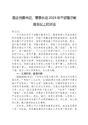 国企党委书记、董事长在2024年干部警示教育会议上的讲话同志们:今天我们召开干部警示教育会议,既是集团公司党委落实党风政建设主体责任、加强干部廉洁教育的直接体现,也是贯彻全面从严治党要求、推进反腐倡廉工作的务实举措。刚才,我们集中观看了省、市警示教育片,通报了身边的案例,他们置党纪国法于不顾,把纪律规矩当摆设,踩底线、越红线、碰高压线,十八大后不收敛不收手,十九大后仍不思改不知止,情节严重,最终落得身败名裂。这些反面典型,再次给我们敲响了纪律警钟。今天,把大家请到一起来交流一下思想,既是守纪律、讲规矩的警示会,也是提能力、强作风的督办会,希望在座各位要把心思集中在想干事上,把胆识体现在敢干事上,把能力展现在会干事上,把功夫下在干成事上。下面,我谈一些认识和体会,与大家共勉。一、认清形势,直面问题XXXXXX指出:自然生态要山清水秀,政治生态也要山清水秀。党的十八大以来,以XXX同志为核心的党中央把全面从严治党纳入四个全面战略布局,从制定和落实中央八项规定开局破题,持之以恒正风肃纪,开展史无前例的反腐败斗争,打出一套自我革命的组合拳,打虎拍蝇猎狐一刻未停歇,反腐败斗争形势依然严峻复杂,全面从严治党永远在路上。所以,我们一定要认清形势,从思想上、行动上彻底消除对全面从严治党的模糊认识,识大势、知大势、顺大势,强力推进政治生态建设。近年来,集团公司大力推进清廉国企建设,政治生态得到了进一步改善,党风廉政建设和反腐败工作取得了新成效,但清存量遏增量工作仍需进一步加强。刚才我们通报了给予XX同志处分的决定,其在担任领导职务期间,利用职务上的便利谋取利益,非法收受他人所送财物。其作为集团公司中层干部,在党的十八大,特别是在党的十九大之后,仍然不收敛、不收手、不知止,性质何其恶劣,其受贿金额之大、涉及范围之广,让我触目惊心。不知在座的各位有没有受到警醒教育?有没有思考反省?我想,大家都应该扪心自问:自己能否顶得住诱惑,经得起考验,守得住廉洁?岗位风险点查找全面没有?防控措施有效落实没有?党纪国法、公司制度入脑入心没有?从近年来政治生态分析和上级部门对集团公司的全面体检情况上看,部分党员干部认不清形势,看不清环境,在思想认识上、工作执行上,与全面从严治党要求还有差距。一是个别党组织从严治党主体责任落实不够到位,在队伍教育、管理和监督上存在缺项,压力传导不够,风险点查找不准,八小时外监督不力,如去年有2名普通职工因醉驾、酒驾受到处分,给集团公司造成不良影响。二是个别党员干部理想信念缺失,在敢担当、能作为上高高挂起,工作作风不实,履职尽责不力,动口不动手,人在心不在。如XX项目,相关人员履责不力导致出现严重质量问题,3人受到处理处分。三是部分党员干部缺乏敬畏,对党纪党规的刚性约束心存侥幸,如2020年以来仍有2名干部因违规操办婚丧喜庆事宜受到处理。四是部分权力集中、资金密集的部门和岗位工作程序不规范、内控机制不健全,制度执行不到位,导致个别车间出现违规领用物资等问题。五是个别单位、部室对意识形态领域风险研判和排查不深入不经常,对涉企舆情引导处置不够及时,争取群众支持理解的方法措施不多,信访矛盾多发,信访举报上升明显。二、以案为鉴,警钟常鸣畏则不敢肆而德已成,无畏则从其所欲而给予祸。没有敬畏,权利就不受约束;就会出现滥权、专权、弄权。通过我们身边人的违纪违法案例,也警醒我们必须常怀敬畏之心,以如履薄冰,如临深渊的自觉,立正身、讲原则、守纪律、拒腐蚀。(一)敬畏组织,坚决做到坚守底线不逾越。党员干部必须敬畏组织的纪律与规矩,敬畏组织的教育与培养,敬畏组织的信任与监督。坚定思想,摆正位置,个人服从组织,少数服从多数,下级服从上级,真正听党话,跟党走。坚持重大事项请示报告,不折不扣落实上级决策部署,始终相信组织、依靠组织、服从组织。切忽心存侥幸,以为天知地知,你知我知;切勿自我安慰,以为法不责众,无伤大雅;切勿以身试法,以为官运亨通,事事顺意;切勿在错误心理支配下,践踏纪法底线。(二)敬畏权力,坚决做到勤廉有为不懈怠。大道至简,有权不可任性。国企干部对手中的权力必须要有敬畏之心,才能慎用权力、用好权力。权力就是责任,责任就要担当。权力越大,责任也就越重。大人不华,君子务实。要真正把权力视为自己的义务和责任,把高标准履职尽责作为基本要求,把群众满意作为根本标准,科学决策、科学施策,勤担当,勇作为。(三)敬畏法纪,坚决做到严以律己不乱为。党纪国法是每个党员干部的戒尺,红线不能逾越。要把党的纪律规矩刻印在心上,把严守纪律规矩当作每日的必修课,看牢自己、管好家人。常怀律己之心,常思贪欲之害,始终保持清廉自守的政治定力,要坚持规规矩矩的上下级关系、团结互助的同事关系、既亲又清的