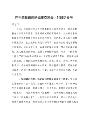 在主题教育调研成果交流会上的讲话参考同志们:今天,我们在这里召开主题教育调研成果交流会,既是主题教育工作的具体要求,更是调研成果的有效转化,对推动各条线具体工作有着积极且深远的作用和意义。总的看,第二批主题教育开展以来,在上级部门的关心指导下,在座的各位同志都围绕工作实际、结合分管业务,认真拟定调研方案、精心谋划调研课题、深入开展调查研究,取得了阶段性的成效。刚才,×同志帮忙传达了XXX的重要讲话精神,大家要做好学习贯彻。其他同志就工作职责,分别围绕调研课题交流了成果、提出了对策,讲得都非常好,总体感觉调研抓的比较紧、情况摸得比较清、问题分析比较透,达到了预期的效果。下面,我就今天的会议主题,再谈三点意见:一、突出政治领航,持之以恒在理论武装上下功夫。第二批主题教育即将告一段落,但我认为学思想、学知识、学本领的力度不能有丝毫放松,要持续用力、久久为功,继续用好调查研究传家宝,用足典型案例活教材,切实做好主题教育深化工作的后半篇文章。一是思想认识再深化。深刻认识开展主题教育的重大意义,坚持把深入学习贯彻XXX新时代中国特色社会主义思想以及XXX考察浙江重要讲话精神作为推进工作的纲与魂,把理论学习贯穿事业发展始终,大力弘扬理论联系实际的优良学风,不断推动各项学习往深里走、往实里走、往心里走二是个人检视再深化。要坚持边学习、边查摆、边整改、边总结一体推动,以刀刃向内的自我革命精神查摆自身本领的不足工作执行时的短板,把问题找准找实、把根源挖深挖透,不断强化政治属性和能力素养,为年底开好专题民主生活会下好先手棋、打好提前仗。三是学用结合再深化。遇事先从XXX的重要思想、重大论断中找干什么的方向和怎么干的方法,内化于心、外化于行,切实提高用创新理论研究新情况、解决新问题、推动新发展的能力和水平,把学习成果体现在工作实践和实绩上。二、突出跟踪问效,持之以恒在成果转化上下功夫。成果的转化运用是一切调查研究的出发点和落脚点,只有把调研成果转化为解决问题的具体实践,调查研究才算是功德圆满。我们要牢固树立研以致用理念,努力做好调研成果的转化运用,力争取得一批突破性、标志性、开创性的成效。一是在问题整改上动真格。2023年,我们开展了大调研、大走访活动,也发现了不少制约高质量发展的老问题、新形势下出现的新问题、群众反映强烈的真问题,例如刚才有些同志提到的义务教育优质均衡发展、校网布局调整等等,都需要我们做好专题思考,进一步探求优解的方法路径。二是在制度设计上见真章。要全面系统吸收本次交流研讨成果,把调研报告修改好、完善好,在此基础上仔细梳理各线转化运用的思路、方向、目标,加快形成科学化的认识成果、具体化的项目成果、长效化的制度成果,推动调查研究从纸上落到地上。三是在措施完善上出真招。各班子成员要针对前期落实的一些政策、方案、考核办法,适时开展回头看工作,比如我们的教学质量监测方案以及今年即将要推行的小额工程管理办法等系列调研成果,实施效果好不好、合不合理、有没有漏洞,都需要我们抓好跟踪调研既听工作建议、也听批评意见,真正把情况摸清、把对策做优、把问题解决。三、突出使命担当,持之以恒在推动发展上下功夫。要充分吸收并运用主题教育、调查研究的成果和经验,在学思想、强党性、重实践、建新功上善始善终、善作善成,接续写好事业高质量发展的优质答卷。一是立足小切口写好大文章。刚才各位同志汇报的调研文章都是立足自身岗位职责所形成的调研成果,课题切口非常小,但在实际工作中都有着沉甸甸的份量比如义务教育优质均衡发展关乎我们下一年的两县创建,学生心理教育、家庭教育更是影响学生健康成长和教学质量的关键一环。因此在开展调研工作要树立系统思维、大局意识,善于把调研课题放大到质量大局中进行思想与谋划,整体施策、多措并举服务主责主业。二是立足沉下去带动聚起来。各班子成员要以调查研究推动改进工作方法,结合条抓块统工作机制,重点针对联系的片区学校开展深入调研,做好宣传政策、解疑释惑、理顺情绪、化解矛盾等工作,切实担负起把党的决策部署落实下去、把基层学校智慧力量凝聚起来的政治责任,上下联动、群策群力推动事业提质发展。三是立足新征程展现新作为。元旦刚过,即将步入春节,正值岁末年初的关键节点,我们也不能有丝毫懈怠,要统筹推进主题教育和中心工作,以更高标准、更实举措,在抓冲刺保收官、抓安全守底线、抓谋划开新局上持续用力,为一季度强势开局、全年工作稳中向好奠定坚实基础。我就讲这些,谢谢大家!