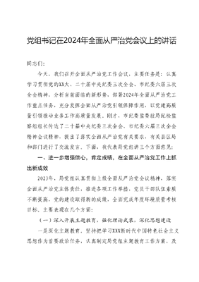 党组书记在2024年全面从严治党会议上的讲话同志们:今天,我们召开全面从严治党工作会议,主要任务是:认真学习贯彻党的XX大、二十届中央纪委三次全会、市纪委六届三次全会精神,分析当前面临的新形势,部署2024年全面从严治党工作重点任务,充分发挥全面从严治党引领保障作用,以党建高质量引领推动业务工作高质量发展。刚才,市纪委监委驻局纪检监察组组长传达了二十届中央纪委三次全会、市纪委六届三次全会精神会议精神,提出了落实全面从严治党有关要求,有关县区局和部门进行了交流发言。下面,我代表局党组讲三个方面意见:一、进一步增强信心,肯定成绩,在全面从严治党工作上抓出新成效2023年,局党组认真贯彻上级全面从严治党会议精神,落实全面从严治党主体责任,推进各项工作举措,党员干部队伍素质不断提高,党的建设取得新的成绩,全面完成年度环境质量考核目标。主要表现在几个方面:(一)深入开展主题教育,强化理论武装,深化思想建设一是深化主题教育。坚持把学习XXX新时代中国特色社会主义思想作为首要政治任务,认真制定局党组主题教育工作方案,及时跟踪检查各部门主题教育工作开展情况,一体落实理论学习、调查研究、检视整改、推动发展各项任务。先后开展4次党组中心组集中学习,举办为期2周的当组读书班,各支部开展支部主题党日24次。二是加强理论武装。通过党组会前置学习、党组中心组集中学习、线上实时跟踪学习、为党员干部讲专题党课等方式,深化运用新时代党的创新理论武装头脑、统一思想,推动全体党员干部不断提高政治三力。全年共开展党组中心组集体学习研讨12次、领导干部讲党课8次,带动各党支部严肃规范开展支部主体党日活动60次。三是守牢意识形态阵地。严格落实意识形态工作责任制,召开3次党组会研究部署意识形态工作,深入开展干部职工思想动态分析,组织班子成员开展干部家访30余人次,深入了解员工思想动态,持续巩固意识形态向上向好的积极态势。(二)压实管党治党责任,深化政治建设一是落实管党治党主体责任。制定《全面从严治党主体责任清单》《党建工作领导小组及领导小组办公室工作规则》等制度办法,建立完善党建工作责任落实机制,压紧压实党组主体责任党组书记第一责任人责任、其他班子成员一岗双责。二是坚定践行两个维护。建立完善贯彻落实XXXXXX重要指示批示精神和党中央重大决策部署工作机制,印发《贯彻落实XXXXXX重要批示精神和党中央重大决策部署实施细则》,全面梳理XXXXXX重文可居文库——海量学习资料,手机电脑下载www.wenkeju.com要指示批示精神和党中央重大决策部署落实情况,建立落实工作台账,进一步完善闭环督办机制。三是严肃党内政治生活。严格执行民主集中制,班子成员带头过好双重组织生活,自觉以普通党员身份参加所在党支部组织生活,常态化与党员干部交心谈心带动各支部规范开展三会一课和批评与自我批评。(三)加强干部教育培养,强化支部标准建设,提升战斗力一是规范基层支部建设。巩固支部标准化规范化建设成果,强化支部建设制度规范,规范完成支部换届选举,发展3名入党发展对象、2名预备党员。强化支部带头人培养,举办支部书记和支部委员党务知识专题培训班,创新党务工作培训方式,举办党务知识竞赛,寓教于乐,提升支部书记、支部委员履职能力。二是规范干部选拔任用。坚持新时代好干部标准,认真执行领导干部能上能下规定,畅通干部职务职级晋升通道,推荐选拔副处级干部2人,提任科级领导干部6人,晋升职级17人,有效运用干部选任方式为干部干事创业提供有利平台。三是加强干部教育培养。推进学习型机关建设,制定年度培训学习计划,大力弘扬研学之风。深入挖潜内部培训资源,举办8期机关小讲堂。组建青年理论学习小组和青年调研小组,加强青年工作交流分享,为青年搭建展示才华和实践锻炼平台。(四)深入纠治四风,深化党风廉政建设文可居文库——海量学习资料,手机电脑下载www.wenkeju.com一是强化廉政教育,自律意识进一步增强。开展领导干部家风课堂专题教育活动,组织局领导班子成员的家属到我局上党风廉政建设专题教育课,受到了很好效果。全员签订《拒绝酒驾醉驾承诺书》,常态开展酒驾醉驾警示教育。开展公职人员违规参与民间借贷专项清理和宣传教育活动,用本地的人和事来教育党员干部,以案为鉴,以学促改。开展公职人员违规取酬专项清理活动,对全市系统公职人员违规取酬行为进行自查自纠、整改清理,进一步规范了关键人员、关键岗位的用权行为,提升了干部队伍形象。二是强化监督执纪,规矩底线进一步守牢。持之以恒落实中央八项规定精神,密切关注四风苗头性、倾向性、隐蔽性问题,切实加大四风日常监督检查。严格教育和管理,确保各项工作决策部署到哪里,监督检查就跟进到哪里。进一步深化运用监督执纪四种形态,针对历年积累的和新发