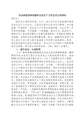 在全面监督环境保护安全生产工作会议上的讲话同志们:经区党工委研究同意,今天,我们召开区全面监督环境保护安全生产工作会议,主要任务是传达省市会议精神,对全面监督、环境保护、安全生产工作进行安排部署,在全区进一步形成学的氛围、严的氛围、干的氛围,担当作为,真抓实干,确保区党工委安排部署的工作落实落地落细,全面掀起XXX建设高潮,实现经济社会高质量发展。刚才,XXX同志宣读了区党工委关于成立党工委全面监督工作领导小组的通知,国克、建宏两位同志分别对环境保护、安全生产工作进行了安排部署,我完全同意,请大家认真抓好落实。下面,我讲三点意见:一、提升站位,认清形势(一)要从讲政治的高度认识这三项工作的重要性。旗帜鲜明讲政治是我们党作为马克思主义政党的根本要求。党的XXX把党的政治建设摆在首位,作为一项重要任务予以部署。各级各部门必须把旗帜鲜明讲政治体现到主业主责上,落实到具体行动中,体现在工作各方面、全过程。一是加强全面监督是立足于新时代全面从严治党的新要求。新时代坚持和加强党的全面领导,最直接的体现就是把每条战线、每个领域、每个环节的党建工作抓具体、抓深入。党内监督是党的建设的基础性工程,是全面从严治党的重要内容,加强党对监督工作的领导,是落实党的全面领导这一根本原则的具体体现。党要管党、全面从严治党,管是监督,治是更重要的监督。实践证明,抓住了监督就抓住了管党治党的关键。监督有力,管党治党才能管到位、严到份。二是搞好环境保护是贯彻落实XXX生态文明思想的根本要求。两山论是XXXXXX生态文明建设思想的核心内容,是XXX新时代中国特色社会主义思想的重要内容,是推进生态文明建设和环境保护的根本遵循。全区各级各部门要牢固树立和践行绿水青山就是金山银山的理念,不断提高全社会生态环境保护意识,不断广泛凝聚保护生态环境就是保护生产力、改善生态环境就是发展生产力的共识,不断推进绿色发展方式和生活方式转变,不断推进环境质量的改善和人民群众拥有生态产品的获得感。三是必须坚守安全生产这条红线、底线。党的十八大以来,XXXXXX站在党和国家发展全局的战略高度,对安全生产工作发表了一系列重要讲话,作出了一系列重要指示和批示。XXXXXX8次主持召开中央政治局常委会议听取安全生产工作汇报,40多次作出重要指示批示。这充分体现了安全生产工作在党和国家工作全局中的重要地位。全区各级各部门要牢固树立安全发展理念,始终把人民群众生命安全放在第一位,牢牢树立发展不能以牺性人的生命为代价这个观念。(二)要从谋发展的高度认识这三项工作的严峻性。党的XXX强调,发展是解决我国一切问题的基础和关键,必须坚定不移把发展作为党执政兴国的第一要务。我们要适应中国特色社会主义进入新时代的新要求,紧扣社会主要矛盾的新变化,顺应人民对美好生活的新期待,推动实现高质量发展。一是监督体系还没有完全建立。从近两年监察体制改革的实践看,不仅解决了反腐败力量分散、纪法衔接不畅的问题,优化了反腐败资源配置,初步搭建了党和国家监督体系的主体主干,而且还强化了党对反腐败工作的全方位、全过程的领导,实现了党内监督和国家监察、依规治党和依法治国有机统一,制度优势正在转化为治理效能。但是也要看到,完善党和国家监督体系是一项复杂的系统工程,单靠纪检监察机关一个部门的力量是远远不够的,也不现实。尽管目前纪检监察系统初步形成了纪律监督、监察监督、巡视巡察监督(派驻监督还未落实)的权力监督格局,但与全面从严治党的要求相比,与实现治理能力和治理体系现代化的目标相比,监督还存在盲区和漏洞。落实主体责任不能只靠党内监督,完善监督体系也不能只靠纪检监察机关唱独角戏。我们急需把其他不同形式的监督有效统筹起来、整合起来,为履行党内监督主体责任提供更多支撑。文可居文库——海量学习资料,手机电脑均可下载www.wenkeju.com只有这样,才能在党的坚强有力领导下形成各个领域相辅相成、相互促进的联动格局,才能形成整体合力,释放治理的强大效能。二是环保形势依然严峻。进入XX月份以来,我市环保监控数值居高不下,如果不采取断然措施,将有被约谈的危险。从XX月底,市委XX书记一周召开一次现场会(汇报会),对环境污染防治工作进行研究和安排部署。XX书记在XX月XX日全市环境污染防治工作会议上严厉指出当前环境保护工作中存在的问题,少数急多数人不急,少数干多数人不干不看不关心还在捣蛋,干部发动不充分、企业发动不充分、全民发动不充分。专家组反馈的问题主要是:六个百分百落实不到位;车辆带泥上路、物料抛洒;洒水降温力度不足;土方、建筑垃圾、物料裸露堆放;道路扬尘问题;高污染车辆入市穿行;城市清洁行动落实不到位等。市内四个监控点每天进行排名,其中PM2.5、PM10每高于标准值XX微克,将处罚所在区XX万元。三是安全生产隐