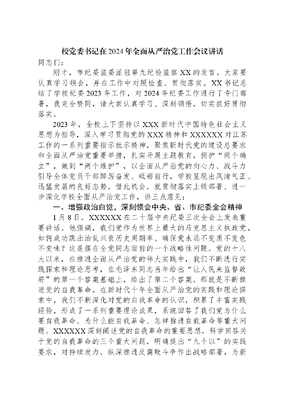 校党委书记在2024年全面从严治党工作会议讲话同志们:刚才,市纪委监委派驻第九纪检监察XX的发言,大家要认真学习领会,并在工作中对照检查、贯彻落实。XX书记总结了学校纪委2023年工作,对2024年纪委工作进行了专门部署,我完全赞同,请大家认真学习、深刻领悟,切实抓好贯彻落实。2023年,全校上下坚持以XXX新时代中国特色社会主义思想为指导,深入学习贯彻党的XXX精神和XXXXXX对江苏工作的一系列重要指示批示精神,聚焦新时代党的建设总要求和全面从严治党重要举措,扎实开展主题教育,拥护两个确立,做到两个维护,以全面从严治党的向心力、战斗力引导全体党员干部踔厉奋发、砥砺前行,学校呈现出风清气正、迅猛发展的良好态势。借此机会,就贯彻落实上级部署、进一步深化学校全面从严治党工作,讲三点意见:一、增强政治自觉,深刻领会中央、省、市纪委全会精神1月8日,XXXXXX在二十届中央纪委三次全会上发表重要讲话。他强调,我们党作为世界上最大的马克思主义执政党,如何成功跳出治乱兴衰历史周期率、确保党永远不变质不变色不变味?这是摆在全党同志面前的一个战略性问题。党的十八大以来,在推进全面从严治党的伟大实践中,我们不断进行实践探索和理论思考,在毛泽东同志当年给出让人民来监督政府的第一个答案基础上,给出了第二个答案,那就是不断推进党的自我革命。在新时代十年全面从严治党的实践和理论探索中,我们不断深化对党的自我革命的认识,积累了丰富实践经验,形成了一系列重要理论成果,系统回答了我们党为什么要自我革命、为什么能自我革命、怎样推进自我革命等重大问题。XXXXXX深刻阐述党的自我革命的重要思想,科学回答关于党的自我革命的三个重大问题,明确提出九个以的实践要求,对持续发力、纵深推进反腐败斗争作出战略部署,为新时代新征程深入推进全面从严治党、党风廉政建设和反腐败斗争提供了根本遵循。2月5日,省委书记XXX出席十四届省纪委四次全会并讲话。他强调,要深入学习贯彻XXXXXX关于党的自我革命的重要思想,认真落实二十届中央纪委三次全会精神,以永远在路上的高度自觉坚定不移全面从严治党,一体推进不敢腐、不能腐、不想腐,以勇于自我革命焕发出的强大活力,引领推动中国式现代化江苏新实践走在前、做示范。X月X日,XX届XX市纪委X次全会召开,XX市委书记XXX指出,XXXXX。全校要坚持以XXX新时代中国特色社会主义思想为指导,将学习贯彻中央、省、市纪委全会精神作为重要政治任务,深刻领会精神实质、把握核心要义,着力抓好贯彻落实,以强有力的政治执行力坚决捍卫两个确立、做到两个维护。一是必须准确把握XXXXXX关于党的自我革命的重要思想深刻内涵。提高政治站位,增强政治自觉,永葆赶考的清醒和坚定,不断清除侵蚀党组织健康肌体的病毒,切实把全面从严治党向纵深推进。二是必须准确把握XXXXXX关于形势依然严峻复杂的科学判断。对反腐败斗争的新情况新动向要有清醒认识,对腐败问题产生的土爆和条件要有清醒认识,一刻不停推进反腐败斗争,确保红色能源动脉永不褪色、永不变色。三是必须准确把握XXXXXX关于动真碰硬抓好问题整改的重大部署。把巡视整改作为纵深推进全面从严治党的有力举措,在政治上严肃对待、思想上深刻反思、行动上坚决落实,以真改实改的担当推动全面从严治党向纵深发展。二、敢于直面问题,以彻底的自我革命精神锻造队伍XXXXXX在二十届中央纪委三次全会上科学回答了我们党为什么要自我革命为什么能自我革命怎样自我革命的三个重大问题,并指出,在深入推进党的自我革命实践文可居文库——海量学习资料,手机电脑均可下载www.wenkeju.com中需要把握好九个问题,即:以坚持党中央集中统一领导为根本保证,以引领伟大社会革命为根本目的,以新时代中国特色社会主义思想为根本遵循,以跳出历史周期率为战略目标,以解决大党独有难题为主攻方向,以健全全面从严治党体系为有效途径,以锻造坚强组织、建设过硬队伍为重要着力点,以正风肃纪反腐为重要抓手,以自我监督和人民监督相结合为强大动力。一是要深入学习党的自我革命重要思想。中国共产党对如何跳出历史周期率,始终在思索、一直在探索。毛泽东同志在延安窑洞里给出了第一个答案:让人民来监督政府。XXXXXX在深刻总结党的百年奋斗历史特别是党的十八大以来的新实践又给出了第二个答案:自我革命。全体党员干部必须坚持思想政治引领,把政治理论学习摆在突出位置,在深入学习贯彻XXX新时代中国特色社会主义思想上作表率,在始终同党中央保持高度一致上作表率,深入、全面、系统学习贯彻XXXXXX关于党的自我革命的重要思想,进一步筑牢政治忠诚,践行好XXXXXX关于党的自我革命的重要思想的实践要求,把增强四个意识、坚定四个自信、做到