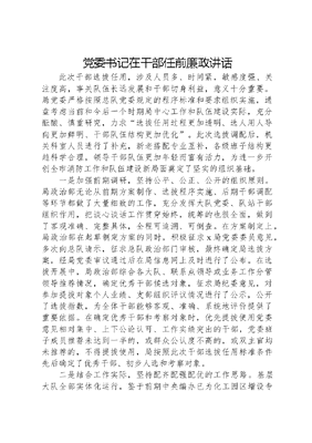 党委书记在干部任前廉政讲话此次干部选拔任用,涉及人员多、时间紧,敏感度强、关注度高,事关队伍长远发展和干部切身利益,意义十分重要。局党委严格按照总队党委规定的程序标准和要求组织实施,通盘考虑当前和今后一个时期局中心工作和队伍建设实际,充分酝酿、慎重研究,力求选拔任用过程更加透明、选人用人导向更加鲜明、干部队伍结构更加优化。此次选拔调配后,机关科室人员进行了补充,新老搭配专业互补,各级班子结构更趋科学合理,领导干部队伍更加年轻而富有活力,为进一步开创全市消防工作和队伍建设新局面奠定了坚实的组织基础。一是加强前期调研,坚持公平、公正、公开的组织原则。局政治部无论从前期方案制作、选拔程序实施、后期干部调配等环节都做了大量细致的工作,充分发挥大队党委、队站干部组织作用,把谈心谈话工作贯穿始终,统筹的也很全面,做到了客观准确、完整具体,全程可追溯、可倒查。在方案制定上,局政治部在起草制定方案的同时,积极征求x局党委委员意见,多次向总队请示,征求总队政治部门审核,最终确定局选拔方案,经局党委审议通过后在局信息网上及时进行了公布。在选拔开展中,局政治部综合各大队、联系点领导或业务工作分管领导推荐情况,确定优秀干部候选对象,征求局纪委意见,对参加提拔对象个人业绩、支部组织评议情况进行了公示,公开了选拔指数,为全体干部能够客观、准确、系统地评价提供了重要依据。在确定优秀干部和考察对象时,优先提拔使用党委意见相对集中、上下公论认可、工作实绩突出的干部,党委班子成员推荐未达到一半的,或群众公认度不高的,或双主官均未推荐的,不得提拔使用,局按照此次干部选拔任用标准条件先后确定了优秀干部、初步人选和考察对象。二是结合工作实际,坚持配齐配强配优的工作思路。基层大队全部实体化运行,鉴于前期中央编办已为化工园区增设专项编制,考虑到当前防火灭火和队伍建设的现实需求,结合编制实力、队站布局等情况,经局党委研究,实体化运行高新技术产业开发区、柳城经济开发区消防救援大队,配齐配强大队主官,局所有编制大队均实体化运行。此次干部选拔调配,局班子成员讲政治、顾大局,各级干部讲规矩、守纪律,体现出了很好的政治素养。我刚到局工作三周,对很多同志还不是很熟悉,尤其是基层队站的同志,希望大家理解。到局后,有的干部想直接找我汇报思想和个人进步意愿,大家的心情可以理解,但程序上欠妥,要按程序、讲规矩,不能越过大队党委、不能越过局分管领导,这一点希望大家以后要注意。下步,局将进一步完善干部考核评价体系,有效发挥考核指挥棒和政治监督方向盘的作用,对考核排名靠前、比武竞赛靠前、检查评比靠前的集体和个人予以奖励,对因个人原因影响局业务考核、比武竞赛、检查督察等成绩和排名的干部要下队锻炼或跟班学习,对因推进工作不力、工作不能同心同向、步调不一致的个别单位主官要调整交流或组织处理,对有令不行、有禁不止、顶风违纪的干部要依规依纪严肃惩处,激励党员干部以实干立身、拿实绩说话,形成能者上、优者奖、庸者下、劣者汰的良好局面。下面结合此次干部调配和同志们谈几点意见,既是交流共勉,也是要求期望。一是加强理论学习,提升政治站位。讲政治、讲站位、讲大局,是党员干部的首要素质和立身之本,新任职干部必须要在政治头脑保持清醒、在政治立场坚定如磐,这是衡量其干部能否担当大任、肩负重托的首要标准。要牢固树立为官一任、振兴一方的理念,坚持一切从大局出发,以对事业负责、对队伍负责、对干部群众负责的态度,自觉融入大局、适应大局、服务大局。要时时处处以工作为重,从严落实党的民主集中制和党委统一的集体领导下的首长分工负责制,心往一处想,劲往一处使,杜绝出现闹不团结、搞内耗的现象,切实在落实党文可居文库——海量学习资料,手机电脑均可下载www.wenkeju.com委部署与个人分工实际相结合中谋发展、求突破。二是加强业务知识学习,提升履职能力。学习是优化素质、提升能力的重要途径,更是推动工作、创造一流业绩的重要基础,人知识越多,思维就越缜密,考虑事情就更加周全,做起事来就会得心应手。要学习政策理论,把学习宣传贯彻党的XXX精神作为首要政治任务,坚持不懈在全面学习、全面把握、全面落实上下功夫。要学习消防业务,掌握必备的基本、基础业务知识,积极探索新形势下工作的新经验、新做法,不断提高综合素质;要乐于向同事、向下属学习,在学习中提升自我,努力争做一名有修养、有知识、有激情、有能力的干部,真正胜任新形势新任务的需要、胜任岗位职责的要求。三是加强自我要求,提升廉洁意识。要以《党章》为镜子、以《准则》为标尺、以《条例》为底线,保持好自身思想的干净、生活的干净、圈子的干净、权力的干净。要加强作风建设,做到事业如山、名利似水,在大事大非面前抵得住诱惑、经得起考验,时刻做到自重、自省、自警、自励。要树立正确的政绩观、权力