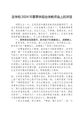 在学校2024年春季学期全体教师会上的讲话回顾过去一年,在局党委和镇党委政府的坚强领导下、社会各界的鼎力支持下,全体X教育人的奋斗下,X教育硕果累累。但成绩属于过去,过去已过去,不再提。展望未来,务必戒骄戒躁,继续务实奋进,埋头实干,安静育人,在追求X教育高质量发展的路上,齐心协力再创新佳绩。一、聚焦教育技能提升,助力孩子们健康成人,成健康人。世界在变,时代在变,育人方式也在变。但不管怎么变,教育孩子们健康成人,成健康人的育人目标没有变。一是厚植爱国主义精神,培养孩子们的家国情怀。各学校每周一第一节早读课全部改为升国旗仪式,雷打不动(雨雪天气除外)的开展升国旗仪式,全体师生唱国歌升国旗,师生分别在国旗下讲话。将思政课与升国旗仪式高度融合,着力打造沉浸式爱国主义教育模式。全体老师要提高对升国旗仪式和爱国主义教育的认识,把培养孩子们以爱国主义精神为基调的家国情怀放在首要位置,各学校校长要亲自来抓这项工作,扎扎实实开展好升国旗仪式,厚植爱国主义精神。二是充分发挥活动育人的独特优势,让孩子们在活动中体验,在体验中感悟,在感悟中成长。很多知识和道理,在课堂上讲千遍万遍不如让孩子们亲自体验一遍。认真开展好学雷锋清明祭英烈等一系列主题活动,让孩子们在活动中感受革命先烈的丰功伟绩,学会珍惜来之不易的幸福生活。除此外,再忙也要挤出时间于四月底五月初开好全镇中小学生田径运动会和篮球比赛,让孩子们在体育活动中体验竞争、团结和协作,开展好庆六一文艺汇演和师生书画展,给孩子展示才艺的同时融审美于艺术活动之中,陶冶情操。三是言传身教,树立榜样。师者,德之范也。每一位校长、老师都要率先垂范的做好孩子们言行的典范。要求孩子们做到的,老师先做到,要求老师做到的,校长先做到,要求校长做到的,我先做到,一级做给一级看,让孩子们学有榜样,做有示范。要求孩子们不做的,我首先不做,然后老师和校长们也不得做。四是用红色革命精神培育孩子们精神品质。要充分用好《四渡赤水》《爬雪山过草地》《志愿军》《长津湖》等一系列红色影片资源,让孩子们在优秀影片中近距离感知长征精神、延安精神、南泥湾精神、西柏坡精神等中国共产党的精神谱系,培根铸魂,培养孩子们坚强不屈、艰苦奋斗、自力更生、勇往直前等精神品质。五是全面建设书香校园,用书香涵养成长。扎扎实实抓好孩子们的阅读教育,切切实实用书香涵养成长。道理很简单:得阅读者得语文,得语文者得天下。为切实建好书香校园,实现老师带动孩子们的校园全民阅读目标,本学期将做好以下三件事:一是中心学校统筹,全镇一盘棋,出台书香校园建设方案,并按方案定期验收师生的阅读效果;二是课堂上要大声朗读,课本需要阅读的地方,课堂上多停留两分钟,要让书声充满校园;三是课后服务要开设阅读课,每个班级一星期不低于2节课后服务课专门用于纸质书籍阅读。不仅要用书香涵养校园,潜移默化影响孩子们成长,还要用书香涵养女生优雅、知性、尚美,涵养男生儒雅、知理、阳刚。六是精准识别每个孩子的人生赛道,做到因材施教。教育的最高境界是因材施教,教育的最大难度还是因材施教。每个孩子都是一个独立的个体,因此,每个孩子的人生赛道都不一样,不能简简单单的把所有孩子放在一条赛道上整齐划一,这不适合新时代的教育工作。精准识别每一个孩子,把他放在属于自己的赛道上让其充满个性成长的同时跑出最佳成绩,这就是因材施教。怎样去做?八仙过海,各显神通。二、聚焦教学技能提升,为高质量发展提供坚实的技能保文可居文库——海量学习资料,手机电脑均可下载www.wenkeju.com障。一所学校教学质量的关键在教学技能,一个老师自我成长或自我价值实现的关键也在教学技能,实现减负提质目标的关键还是在教学技能。只有掌握了先进的教学技能,占据了教学技能的制高点,才能在教育内卷中放心大胆的减负,才能在教育焦虑中轻松提质,才能为X教育高质量发展提供坚实而有力的技能保障。提升教学技能,说易其实很难,因为这是每一个老师毕生的追求,说难其实也很易,无外乎认真备课、教学反思和虚心学习。认真备课是提升教学技能最关键一招。体现教学技能的关键在课堂45分钟的效果,而课堂效果的关键在精心备课。常跟大家说备课有三备,即备教材,备孩子们,备自己。备教材,自己要读熟读懂读透教材,再起笔备课,备课绝对不是照搬教参或抄他人教案,更不是直接拿别人的PPT播放。其次备孩子们,也就是备学情。如果连班上孩子们的学情都不清楚,老师一个人在讲台上口若悬河,天花乱坠,这样的课堂充其量是老师个人的自我陶醉,于课堂实效而言,没太大实际性意义。所以,备课一定要基于孩子们差异性,求得最大公约数去备。最后备自己,也就是备教学方法暨组织教学,要站在孩子们思维的角度,用孩子们的口吻和言语逻辑表达教学内容,善于把复杂知识简单化,把抽象知识具体化