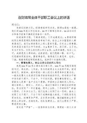 在财政局全体干部职工会议上的讲话同志们:在辞旧迎新之际,经局党组研究决定,按照x委统一部署,我们将xxx年度工作总结会、xx学习教育总结会、xx活动动员会和春节前集中廉政谈话套在一起开。财政局班子强、干部素质好,工作成绩突出,x委组织部的同志都愿意带队到财政局考核干部,社会上方方面面的人都羡慕我们,我们x财政局在上级心里有位置,在社会上受尊重,无非是因为我们工作干的好,为x里争了光、添了彩、立了功,有为才有位。为什么我们的工作让x委、x政府满意、社会上认可,成绩是怎么得来的,成绩面前,我们是歇一歇、松口气,还是瞄准更高目标,整装再奋进,值得我们认真思考、总结。下面,根据局党组研究的意见,我讲四个方面的问题。一、管事先管人,树立公开公正的用人导向我是xxx年xx月主持本局全面工作、xxx年xx月就任局党组书记、局长的。三年前,作为财政局土生土长的干部,面对新时代、新使命,我和党组一班人经过认真思考和反复讨论,一致决定要大力发扬历任班子的好传统好作风,针对部分干部中存在的不愿干、不会干、干不好问题,管好事先管好人,紧紧抓住人是第一生产力这个要害,牢固树立正确的用人导向,通过培养人、管好人、用好人,调动干部职工干事创业的积极性,努力实现一年打基础、两年上台阶、三年树标杆的奋斗目标。三年多过去了,我们总体上达到了这一目标,基本上实现了从不愿干、不会干到干成事的重大转变,干部队伍作风更加优良、纪律更加严明、业务更加过硬,推动着财政工作不断迈上新台阶。总结起来,在队伍建设上,我们主要抓了严管、厚爱两件大事。首先是严管。一是倡导担当负责。局党组一班人从自我做起,率先垂范,事事处处做到一切从工作出发,从事业出发,遇到矛盾问题严起来、硬起来,不怕吃亏,不怕得罪人,敢抓敢管。通过领导的带头影响,一级带一级,层层传导压力责任,坚决与推诿扯皮、当老好人现象做斗争;二是严肃工作纪律。开展财务内审工作,强化内部监督检查。每月督查通报考勤,严格执行机关工作纪律,做到奖惩兑现;三是全面规范工作岗位管理。根据机构改革三定方案要求,实事求是地核定科室(单位)岗位职数,落实定人定岗。全面清理规范了借用人员管理工作,建立了严格的借用人员管理制度。四是严格财务管理。对全局xx家财务独立单位的财务实行统一审核,对纸质票据、津补贴发放、差旅费报销等,制定统一标准,严格审核,严防产生不合规支出,确保全局财务坚决执行财经纪律,规范合法合规运行。第二是厚爱。一是着力为干部打通上升通道,激发干部干事创业热情。从树立公开、公平、公正的用人导向入手,努力打造以重业绩、重表现为导向的选人用人机制,营造绝不让老实人吃亏、不让干活人心寒,让一心跑要、混日子混资格者不吃香的大气候、大环境。全局干部年龄结构、知识结构不断优化,为财政事业的长远发展打下了坚实的人才基础。二是急干部群众之所急,千方百计破解历史遗留难题。三是时刻关心干部职工生活,努力创造良好工作环境。局党组坚持以人为本,从细微处着手,时刻关注干部职工的生活待遇问题,只要是政策范围内允许的,能发到大家手中的工资、奖金、福利,都及时足额发给大家。三年来,我们以全国文明单位到届重创为契机,对局机关大院的硬件设施进行了升级改造,重新招标引进了更好的物业公司,改变了机关食堂的运营模式。在提升机关形象的同时,想方设法为大家创建了优美、舒适、人文的办公环境。四是在干部培养上出实招,努力提升干部队伍整体素质。每年定期举办党性教育培训班和业务培训班,组织财政干部到国内知名大学开展政治、业务学习和交流;定文可居文库——海量学习资料,手机电脑均可下载www.wenkeju.com期开展财政大讲堂,从我做起,每名局班子成员轮流开展财政业务知识讲解。选派优秀干部到省厅交流学习,挂职第一书记到帮扶村接受锻炼。通过几年来真刀真枪抓班子、带队伍,匡正用人导向,一批批优秀干部走上各级领导岗位,为干好财政工作提供了坚强的组织保障。全局上下创先争优的工作热情不断高涨,干劲倍增,年龄较大的同志工作积极性得到了调动,年轻同志看到了希望,争挑重担,呈现出一派朝气蓬勃,昂扬向上的新风貌,干部职工向社会展现的是作风优、业务精、纪律严的良好形象。二、上下同心,奋勇争先,财政工作不断结出新硕果人心齐,泰山移。困难没有吓倒我们这支敢打硬仗、善打硬仗的财政干部队伍,在经济下行压力大,组织收入难度大,硬性支出因素多,收支矛盾十分突出等一道道潜流险关面前,全局上下同心,咬牙苦干,紧抓财政收支管理的重点环节不放松,一路攻城拔寨,各项财政事业不断取得新突破。(一)财政收入主要指标稳居全省前列。我们按照x委关于奋勇争先、更加出彩的要求,主动会同协调税务及相关行业主管部门,认真贯彻《预算法》、《税收征管法》等法律法规,努力做到应收尽收,实现财政收入按计划均