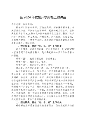 在2024年党校开学典礼上的讲话各位老师、各位同志:新年好!阳春布德泽,万物生光辉。新春就有新气象。今天召开这个会,不仅标志全面开学,更深的意义还在于,组织大家认真学习XXX新时代中国特色社会主义思想,按照六少六多的要求,学习先进、对照先进,夙兴夜寐,疾起奋进,不负伟大时代、不负寸寸光阴,为建设新时代高质量发展名党校努力奋斗、贡献力量。一、理论宣讲,要在圆、通、活上下功夫讲好中国梦,讲好中国故事,发出中国声音,是XXXXXX对宣传思想工作的基本要求,是市委党校的本质工作和最基本的职能。所谓圆,就是自圆其说,自成体系;所谓通,就是可信、可用;所谓活,就是好听、爱听、要听。圆与通,是在理论层面上讲;活,是在实用层面上讲。如何提高宣讲水平、宣讲艺术,把中国故事讲活、把中国理论讲通、把中国理论与实践讲圆?我们的老师一定要多读书、多调研、多交流、多宣讲。所以,要定期开展读书交流活动,每位老师全年读书不少于50册;每位教师至少做一次读书体会报告会;开展专题调研活动,每位老师至少要完成一个课题,调研时间不少于2个月;组织开展主体课、精品课、最受欢迎理论宣传品等评选活动。一方面,通过读书与成果交流提升素养、交流信息,另一方面也是推进书香校园建设。此外,还要在用足市委宣讲团优势的基础上,加快推进全市基层党校联盟,促进资源共享、宣讲工作同频共振。二、理论研究,要在高、专、精上下功夫理论研究虽不是基层党校的首要任务,但却是党校实力的重要体现。要成为基层党校中的名校,就不能不加强理论研究。所谓高,就是研究水平高、发表层次高;所谓专,就是研究方向比较专一,有一批成体系、相关联的研究成果;所谓精,就是有精品,评价好、反向好。加快实现理论研究高精专,要做到三个结合。一是上与下的结合,正确上级要求与地方实践的关系。要以XXX新时代中国特色社会主义思想和十九大精神为指导剖析研究中国特色思想在X的生动实践和辉煌成果,用学术之笔描画X、宣传X;二是大与小的结合,正确处理主题与关键词的关系,主题要大,切口要小,以解剖麻雀的手法梳理解读X贯彻落实中央四个全面战略布局和五位一体总体布局的先进经验,为外地提供X样本和X智慧。三是市与校的结合,就是要正确处理本市镇街、单位与我校联合攻关、课题写作的关系,以此加强对地方和基层情况的深刻了解和总体把握,了解干部群众的思想动态,从而为研究全市宏观性、战略性问题提供基础。以此为指导,今年特别要高质量做好省、市党校课题的申报与落实工作、X改革开放四十年成果的研究工作,要以纪念改革开放45年为契机,加强校内外科研合作,提出更多更新的校内课题,形成多方面的研究成果。从而为建设研究型党校打下新的坚实基础。三、资政研究,要在有、好、多上下功夫咨政研究本来是我校的强项和品牌。今后一段时间我们咨政研究的目标首先要解决有的问题,然后是好,进而多。九层之台,起于累土;千里之行,始于足下。今年要重点做好三方面的工作。一是遴选培育优秀研究人才。途经就是压担子、给票子、找位子,必要时选送相关部门单位挂职锻炼,为我校未来长远的智库建设积累创造条件。二是筹建X改革发文可居文库——海量学习资料,手机电脑均可下载www.wenkeju.com展研究院,主动加入进去,必要时争取在我校挂牌,既可以锻炼队伍,又可以解决我们干部编制少、人手少的问题。三是争取政策支持,即努力争取设立党校科研资金,奖励咨政研究、理论研究的突出成果,形成制度、形成规矩。四、开放办学,要在常、熟、热上下功夫开放办学,面向全国基层党校开展联合办学,这是我校的一块金字招牌,也是我校重要经济支柱。山东省委书记提出要赶江苏、追广东,相信会有更多的地方前来苏南学习考察。要用好这个机遇,把我校开放办学推向常、熟、热的新阶段。所谓常,就是联系合作多、长流水不断线;所谓熟,就是需要外联办班,首先想到的就是X,这是首选,毫无疑义。所谓热,用华西的话说,就是一年四季,都是旺季,门庭若市,宾客盈门;从另一方讲,我们与外校的协作交流也要热,你来我往、不绝于途。如何进一步推进开放办学?我们必须要有好的教学点、参观线路、好的现场解说,好的后勤服务,以及好的学习住宿条件。为此,要发掘新的教学点。进一步拓宽选点视野,立足X,放眼周边,每年新增一批新的现场教学点,同时淘汰一批旧的参观点,合理规划现场教学线路,不走老路,少走弯路,为合作方节约宝贵的学习时间。要积极培育现场解说员,除了我校教师外,对好的现场教育点,若是解说员水平不高,我们可以义务为他们进行培训,为他们规划设计参观线路,这也是我们自我宣传的一种有效途径;要用好华西品牌。要倍加珍惜、要充分利用华西干部学院招牌,进一步加大与华西的联合办学力度,力争实现信息共享、计划