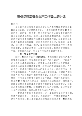 在信访稳定安全生产工作会上的讲话同志们:今天我们在这里整合召开县安全生产工作暨政府安委会第四次全体会议、信访稳定工作会,一是因为距离X只有40多天时间了,时间紧、任务重,整合召开有利于大家有更多时间和精力去抓好具体工作,确保全年目标任务圆满完成;二是因为这两方面工作是构建现代治理体系的重要内容,也是事关全县发展大局的基础和保障,绝对来不得半点马虎,容不得一丝侥幸,出不得任何纰漏。刚才,X同志分别对具体工作作了详细安排部署,我都表示赞同,大家下来后要认真抓好贯彻落实。下面,我就信访稳定、安全生产工作再强调以下意见:一、关于安全生产工作刚才,X同志传达了XXXXXX、李强总理对安全生产工作的重要批示精神,里面都专门强调了红线意识。红线是什么?天津港爆炸事故、河南鲁山老年康复中心火灾事故、江苏昆山汽车车间爆炸事故等一桩桩血的教训告诫我们:人命关天,发展绝不能以牺牲人的生命为代价,这必须作为一条不可逾越的红线。从通报的1—3月情况来看,大家的底线思维和红线意识都坚守得很好,全县安全生产形势总体稳定,没有发生特别重大的安全生产事故。但我们也要看到,作为有13个镇乡的人口大县,我们在人员密集场所、烟花爆竹、道路交通特别是农村道路交通等方面的安全压力非常大。大家务必更加重视和警醒,时刻绷紧安全生产这根弦,坚决守住安全生产红线底线,确保人民群众生命财产安全。一要层层传导压力落实责任。进一步落实安全生产责任制,坚持党政同责、一岗双责、失职追责,严格落实党政一把手负责制。县上来讲就是我和明禹同志负总责,X同志抓具体,各县级分管领导也要对自己分管领域安全生产工作牵头抓总。县级各负有安全监管监察职责的部门和行业管理部门都要按照管行业必须管安全、管业务必须管安全、管生产经营必须管安全的要求,建立安全生产责任清单,各司其职,各负其责。各级各部门一把手必须认真履行安全生产第一责任人责任,对安全生产工作要亲力检查、亲自研究、亲自部署,对本辖区、本单位、本领域的具体情况必须一清二楚。相关企业要切实落实主体责任,严格执行《安全生产法》等法律法规和安全标准,建立健全安全管理制度和操作规程,努力实现由要我安全向我要安全转变。县安委会要发挥综合协调、监督指导作用,组织各级各部门密切配合、协同作战,确保安全生产管理纵向到底、横向到边、不留死角,真正在全县上下形成党政统一领导、部门依法监管、企业全面负责、群众参与监督、社会广泛支持的安全生产工作格局。二要盯紧关键环节综合施策。要切实提高全过程的安全风险管控能力,事前突出抓好源头治理,特别是招商引资项目,要认真做好安评,从源头上减少风险;事中突出抓好隐患排查治理,对重大安全隐患挂牌督办、跟踪管理、逐一销号;事后突出抓好应急处置,最大限度减少人员伤亡和财产损失,严防次生事故发生。要深入开展重点行业领域专项整治,道路交通方面要全力打好交通安全百日攻坚战,确保春运安全,这也是我县安全生产工作的重中之重,今年发生的安全生产事故、受伤和死亡的人员就主要集中在这一块;危爆品方面要加强对相关企业、商户的监管,切实抓好生产、运输、销售等各环节安全监管,严厉打击违法违规行为;人员密集场所及消防方面要加强对商场、学校、车站、医院、市场等场所的安全管控,避免发生拥挤踩踏和火灾事故;建筑施工方面要特别注意冬季施工现场安全管理,上周五里梁熊家沟大桥施工中就发生了施工架杆垮塌事故,要深刻吸取教训,避免再次发生类似事故;其他重点行业领域也要针对季节和时段特点,切实文可居文库——海量学习资料,手机电脑均可下载www.wenkeju.com强化安全监管,为全县经济社会营造安全的发展环境。同时,还要切实加强安全知识宣传教育,这里要特别指出,近几年因为冬季烤火、洗澡发生的意外事故频发,虽然不是安全生产事故,但老百姓因此失去了生命,实在令人惋惜和痛心。相关部门和乡镇要进一步把宣传教育工作抓实,全面提高群众的安全意识,降低意外事故发生率。三要强化督促检查确保落实。今年以来,国务院安委会先后两次派出巡查组到16个省进行了安全生产巡查,上个月国务院第六巡查组进驻X,开展了为期不少于1个月的巡查。虽然这次巡查组没到我县进行巡查,但不代表我们就能松劲、歇气。县安委会要参照巡查工作要求,立即组织开展自查工作,对重点乡镇、重点行业、重点企业、重点项目进行重点督查,对发现的问题和隐患,要定人、定责、定时落实整改,并建立完善隐患整改反馈制度,实施跟踪督查。要严格执行安全生产一票否决制度,县目督办、县安监局要按照年初签订的目标责任书对相关责任单位进行考核,一旦发生较大以上安全生产事故或社会影响较大的责任事故,必须对责任单位和责任人严肃追责。二、关于信访稳定工作刚才X同志已经指出了我县信访稳定工作存在的三