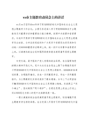 xx市主题教育动员会上的讲话xx月xx日,xx市召开全市学习贯彻XXX新时代中国特色社会主义思想主题教育工作会议,市委书记xx在工作会议上指出,深入扎实开展学习贯彻XXX新时代中国特色社会主义思想主题教育,是当前我市各级党委(党组)的一项重大政治任务。参加第二批主题教育的单位和人员范围广、类型多、数量大,各级各部门要高起点开局、高标准实施,推动主题教育取得良好效果。全市上下必须要精心组织、加强领导。开展好第二批主题教育,具有特殊的重要意义。从涵盖范围看,这是推动党的创新理论飞入寻常百姓家的必然要求;从参加对象看,这是确保XXXXXX重要指示和党中央决策部署在xx一贯到底的必然要求;从时间节点看,这是冲刺全年目标、在开局之年交出合格答卷的必然要求。我们要全面贯彻党中央决策部署和省委工作安排,精心组织开展第二批主题教育,把准目标要求做到方向不偏、标准不降;强化分类指导,做到科学统筹、精准施策;坚持问题导向,做到紧盯难题、边查边改。加强衔接联动做到贯通融合、同向发力;严防形式主义,做到从严从实、扎实深入,确保主题教育取得实实在在成效。一是精心组织、加强领导,要压紧压实责任。市委主题教育领导小组要发挥牵头抓总、综合协调作用,加强工作统筹谋划,定期调度研究进展情况,推动主题教育各项任务措施落到实处;领导小组办公室要及时听取汇报,研究推进措施,协调解决重大问题;各成员单位要各负其责、协同配合,推动形成主题教育整体合力。各级党委(党组)要坚决扛牢主体责任,党政主要负责同志要切实担负起第一责任人职责,亲自抓、带头做,班子成员要认真履行一岗双责,加强对分管领域、单位的督促指导。各级领导干部要以上率下,带头学习理论、带头讲好党课、带头调查研究、带头检视整改、带头担当实干,以关键少数示范带动绝大多数。二是精心组织、加强领导,要从严督促指导。市学教办要坚持因地制宜、分类施策,指导市及区(市)直属部门、镇街、村(居)社区、国企、学校、医院等单位结合自身实际找准工作着力点,督促县处级以上领导班子和领导干部制定用好学习、问题调研、创新举措四张清单,确保不同层级和行业主题教育有力有序开展。要把主题教育开展情况作为领导班子和领导干部年度考核、党组织书记抓党建述职评议考核和高质量发展综合绩效考核的重要内容,以考促抓、抓出成效。三是精心组织、加强领导,要坚持统筹兼顾。各级党委(党组)要把开展主题教育同贯彻党的XX大精神结合起来,同推动本地本单位的中心工作结合起来,同实施惠民实事、解决群众急难愁盼问题结合起来,切实做到两手抓、两促进,确保圆满完成全年各项目标任务,以经济社会发展的崭新成效体现和检验主题教育的务实成果。非学无以广才,非志无以成学。让我们坚持以学增智,从XXX新时代中国特色社会主义思想中汲取奋发进取的智慧和力量,熟练掌握其中蕴含的领导方法、思想方法、工作方法,努力创造经得起历史和人民检验的实绩,不断开创xx各项事业发展新局面,为推动社会主义现代化强市建设作出新的更大贡献。