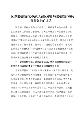 区委主题教育办负责人在区审计局主题教育动员部署会上的讲话同志们,很高兴参加今天的会议,根据区委的统一部署,全区主题教育工作已经全面启动。今天区审计局召开主题教育动员部署会,2023年以县处级以上领导干部为重点在全党深入开展学习贯彻XXX新时代中国特色社会主义思想主题教育,用党的创新理论统一思想、统一意志、统一行动。按照区委方案要求,由我对区审计局开展XXX新时代中国特色社会主义思想主题教育进行联络指导,刚刚XX副局长已经对主题教育工作作了具体安排部署,下面我代表区委主题教育办再讲几点意见。一、提高思想认识、提高政治站位,坚决把思想和行动统一到党中央和省委市委关于主题教育的部署要求上来开展学习贯彻XXX新时代中国特色社会主义思想主题教育,是党中央为全面贯彻党的XX大精神、动员全党同志为完成党的中心任务而团结奋斗所作的重大部署。主题教育开展以来,党中央高度重视、精心谋划部署,XXXXXX全程指导推动、率先垂范引领,亲自主持召开中央政治局常委会会议、中央政治局会议、主题教育工作会议部署推动,深入多地视察指导并就以学铸魂、以学增智、以学正风、以学促干提出明确要求。在8月底召开的中央政治局常委会会议上,XXX充分肯定了第一批主题教育成果,对第二批提出重要要求,强调要更加注重理论武装、更加注重分类指导、更加注重强基固本、更加注重统筹协调、更加注重领导指导特别是要解决实际问题,防止出现形式主义等不良现象,把主题教育抓出高质量好效果。9月5日,中央召开主题教育第一批总结暨第二批部署会议,蔡奇同志对第一批主题教育取得的成果、做法和经验进行系统总结,对精心组织开展第二批主题教育作出全面部署。我们要深刻领悟到,XXX新时代中国特色社会主义思想是当代中国马克思主义、二十一世纪马克思主义,是中华文化和中国精神的时代精华,是党和人民实践经验和集体智慧的结晶,是中国特色社会主义理论体系的重要组成部分,是全党全国各族人民为实现中华民族伟大复兴而奋斗的行动指南,必须长期坚持并不断发展。实践充分证明,两个确立是党在新时代取得的重大政治成果,是推动党和国家事业取得历史性成就、发生历史性变革的决定性因素,是战胜一切艰难险阻、应对一切不确定性的最大确定性、最大底气、最大保证。我们要深刻认识到,开展学习贯彻XXX新时代中国特色社会主义思想主题教育,坚持不懈用XXX新时代中国特色社会主义思想凝心铸魂,切实加强党的思想建设,对于推动全党更加深刻领悟两个确立的决定性意义,更加自觉增强四个意识、坚定四个自信、做到两个维护,始终在思想上政治上行动上同以XXX同志为核心的党中央保持高度一致,具有十分重大的意义我们要深刻体会到,党的XX大描绘了全面建设社会主义现代化国家、全面推进中华民族伟大复兴的宏伟蓝图。开展主题教育,是推动贯彻党的XX大战略部署的有力举措,是深入推进新时代党的建设新的伟大工程的重大部署,对于贯彻新发展理念、构建新发展格局、推动高质量发展,推进中国式现代化,推进党的自我革命、时刻保持解决大党独有难题的清醒和坚定,始终与人民同心保持党的先进性和纯洁性,使全党更加紧密地团结在以XXX同志为核心的党中央周围,完成党在新时代新征程的使命任务,具有十分重大的意义。二、聚焦主题主线、瞄准目标要求,努力在以学铸魂、以学增智、以学正风、以学促干方面取得扎扎实实的成效始终聚焦学习贯彻XXX新时代中国特色社会主义思想这一主题主线,牢牢把握总要求,紧紧扭住目标任务,把牢正确方向,突出问题导向,坚持重心下移,注重群众参与,在学思践悟中学出坚定信仰、学出对党忠诚、学出实干精神、学出深厚情怀、学出新风正气。一是以学铸魂拉满弓,蓄足忠诚之力,推动主题教育见质效。XXXXXX在广东考察时对以学铸魂作出深刻阐释,把对党忠诚体现到贯彻落实好党中央决策部署的实际行动上在新时代新征程上,面对风高浪急甚至惊涛骇浪的重大考验,如果没有对党忠诚作为政治上的定海神针,就很可能在各种考验面前败下阵来。我们广大党员干部要深刻领悟两个确立的决定性意义,从思想上正本清源、固本培元,推动XXX新时代中国特色社会主义思想内化于心、外化于行,增强对党的价值追求和前进方向的高度政治认同,筑牢信仰之基、补足精神之钙、把稳思想之舵,始终以党的旗帜为旗帜,以党的意志为意志,以党的使命为使命,真正做到真心爱党、时刻忧党、坚定护党、全力兴党。二是以学增智拉满弓,蓄足担当之力,推动主题教育见成效。XXXXXX在听取陕西省委和省政府工作汇报时对以学增智作出深刻阐释,从党的科学理论中悟规律、明方向、学方法、增智慧,把看家本领、兴党本领、强国本领学到手。时代在发展、社会在进步,干部更要注重提升政治能力、思维能力实践能力,努力使自身能力同工作岗位相匹配。我们广大党员干部要准确把握XXX