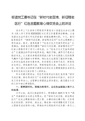 街道党工委书记在新时代老区情、新征程老区行红色主题教育心得交流会上的讲话在全市上下认真学习贯彻X市委X在十四届五次会议上题为《深入学习贯彻XXXXXX对江苏工作重要讲话精神,以奋进姿态交出开局之年优异答卷》的报告精神之际,今天,我们X街道召开 新时代老区情、新征程老区行红色主题教育心得交流会。刚才,首先观看了红色文化文艺宣传进村企汇报演出,接着X位同志围绕新时代老区情、新征程老区行红色主题教育作了学习心得交流。从红色文化文艺宣传进村企汇报演出的节目和效果来说,确实不错,演员们不是专业胜似专业,让大家切身感受到那战火纷飞年代英雄人民的英勇气概和不屈不挠的斗争精神,将红色文化得到了继承和传播。从参加交流发言的对象来讲,有街道党工委班子成员、村居党总支书记、学校教师代表、两新党组织代表、街道部门人员代表。他们通过自身的学习感悟与参加红色主题教育的亲身经历,有声有色地与大家分享了心得体会。市乡村振兴促进会、老区开发促进会对我们X街道新时代老区情、新征程老区行红色教育活动和乡村振兴、老区开发工作非常关心,吉理事长将要提出具体要求,我们要在今后的工作中加以贯彻落实。一、聚焦新时代,厚植为民情怀,让红色血脉融入每个人的血液。今年以来,我们认真组织学习、贯彻落实2023年X市两会和高新区分会的工作要点,把新时代老区情、新征程老区行红色主题教育纳入党工委、办事处的议事日程,从街道机关到村居、到学校、到企业,都在第一时间调整充实了红色主题教育活动领导小组,明确各单位党组织书记为第一责任人。切实加强红色教育和老区建设工作,努力践行弘扬老区精神,传承红色基因,助力共同富裕,促进乡村振兴的工作宗旨,扎实抓好以学习XXX革命老区红色教育系列论述、学习党史、新中国史、改革开放史、社会主义发展史以及X革命老区发展史,学习红色文化书刊,学习革命先辈先烈、时代楷模和身边典型事迹,以八个一(听一场解说、讲一段故事、敬一次英烈、述一下初心、唱一首红歌、观一场演出、读一本红刊、写一篇心得)的工作流程,确保新时代老区情、新征程老区行红色主题教育活动有序广泛开展。我们充分利用中共营溪第一支部纪念馆等本区域的红色资源,加强对党员、干部的党性和理想信念教育。利用岚水农场知青活动室和黄柯农耕文化园初心驿站阵地,加强对青少年学生的革命传统教育。发挥党员干部示范引领作用,形成了新时代老区情、新征程老区行红色主题教育助推乡村振兴的浓烈氛围。机关党支部结合X月份主题党日活动,组织街道党政班子负责人、各部门负责人、机关全体党员开展追寻红色足迹,增强创新动能忆峥嵘、守廉心、强本领主题教育活动;街道党群工作部开展红色宣讲进村居、党的声音到农户党的XX大理论宣讲活动;X小学开展红领巾寻访红色纪念馆主题教育活动;仁桥小学开展了诵读红色经典,传承红色精神、缅怀革命先烈,继承先烈遗志主题教育活动,X中学开展了以寻访营溪支部,回顾革命历史、童心向党学模范,寻访身边老党员等红色系列教育活动;X村党总支开展了光荣在党X年,金光闪闪永向党红色主题教育;X集团有限公司在红色主题教育活动中,组织党员、中层以上干部,到七战七捷纪念馆和营溪第一支部纪念馆参观学习,接受教育;街道老区振兴工作部组织中老年志愿者自编自演文艺节目,结合万里千家演出,开展红色文化文艺宣传进村企送戏下乡专题演出X场次。为了讲好红色故事,街道对红色宣讲员进行了重点业务培训。在X岚水农场举办了唱响老区革命传统红歌比赛;X宣讲队、X宣讲团走进村居、校园、讲述党的历史和红色故事以及中国共产党人的精神谱系。今年以来,着力抓好老区振兴志愿者队伍的建设和完善,有效嫁接新时代文明实践活动志愿者、红枫志愿者等组织,积极动员引导接纳文化素质好、政策水平高,身体健康、热心乡村振兴和老区建设工作的退休干部、教师、职工,充实到老区振兴志愿服务中来,拓展服务项目,提升服务能力,打通服务基层的最后一公里。先后开展了春风送暖夏之韵追梦铸魂赋能助力等振兴老区志愿服务系列活动。各级党组织书记领学红色书刊,宣讲红色故事,带头撰写心得体会文章。到目前为止,收到心得体会文章XX篇,其中,街道机关X篇,农村干部X篇,学校师生X篇,企业单位包括医院X篇。各党组织都能按照党工委的要求,从X月份起利用党员主题活动日,开展新时代老区情、新征程老区行红色教育心得交流会。村居干部与普通党员分享学习心得体会,X村的具体做法在幸福X公众号或X老区振兴公众号进行了报道宣传。二、奋进新征程,践行使命担当,有力推进乡村振兴老区开发促进工作取得新业绩。通过红色主题教育活动,全街道从上到下呈现出将学习热情转化为干事创业激情的良好局面。全体党员干部自觉践行老区精神,增强发展担当意识,积极争做