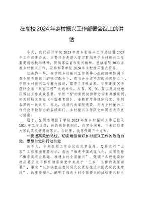 在高校2024年乡村振兴工作部署会议上的讲话今天,我们召开学院2023年度乡村振兴工作总结暨2024年工作部署会议,主要任务是深入学习贯彻关于乡村振兴工作重要指示批示精神,贯彻落实省市有关精神,总结学院2023年度乡村振兴工作,安排部署学院2024年乡村振兴重点任务。过去的一年,在学院乡村振兴工作领导小组的统筹协调下在全院各级部门的密切配合下,在与会全体同志的共同努力下,学院乡村振兴工作有力推进,取得了丰硕成果。学院连续X年获评全省双百工程先进单位,在X、X、X、X以及周边地区帮扶工作成效显著。学院X的案例被推荐为国家典型案例,相关经验文章在《中国教育报》、省教育厅等媒体刊发,得到各界的一致认可。在此,我谨代表学院党委,向为乡村振兴工作付出辛勤努力的各级部门、乡村振兴工作队全体同志表示衷心感谢。刚才,X同志通报了学院2023年度乡村振兴工作汇报及2024年工作设想,讲的很好很到位,我完全同意,下来以后请大家认真抓好贯彻落实。在这里,我再强调三个方面。一要提高政治站位,切实增强做好乡村振兴工作的政治自觉、思想自觉和行动自觉前不久,中央农村工作会议在北京召开。X再次对三农工作作出重要指示,指出推进中国式现代化,必须坚持不懈夯实农业基础,推进乡村全面振兴,强调各级党委和政府要坚定不移贯彻落实党中央关于三农工作的决策部署,要求以加快农业农村现代化更好推进中国式现代化建设。的重要指示,阐明了推进乡村全面振兴的战略要求和主攻方向,是做好新时代新征程三农工作的根本遵循和行动指南。X作为一所公办高职院校,践行服务地方的办学宗旨,学院事业与地方发展紧密相关,服务乡村振兴是学院义不容辞的使命任务。近期,学院正在修订新版章程,在第三章学院功能与教育形式中,就专门增加了一条,学院建立社会服务体系,利用办学资源和办学优势,对接社会需求,主动服务主动服务区域经济建设、文化建设、社会建设和乡村振兴等重大战略。由此可见,从中央到地方,再到学院,各级领导高度重视全力推进乡村振兴工作。我们要始终从讲政治的高度出发,把抓好乡村振兴工作作为坚决拥护两个确立、做到两个维护的政治检验,把思想和行动统一到中省市、上级部门的决策部署上,坚持初心不改、方向不变、力度不减、脚步不停,接续做好乡村振兴工作,推动学院2024年助推地方乡村振兴取得新成效。二、加强统筹协调,全面推进学院2024年度乡村振兴重点工作2024年是贯彻落实党的精神承上启下的关键之年,是深入实施十四五规划的攻坚之年。立足新起点,我们要继续落实四个不摘工作要求,进一步加大帮扶力度,创新帮扶举措,一如既往地抓好学院2024年度乡村振兴各项工作。一要认真贯彻上级部署要求。按照往年惯例,2024年元旦以后,中省市将相继出台新年度乡村振兴有关政策文件,比如每年中央的一号文件,都是《关于做好全面推进乡村振兴重点工作的意见》等等。与此同时,教育部、省教育厅在新年度工作要点中,都将对推进教育振兴乡村工作作出安排部署。我们要认真贯彻上级乡村振兴工作部署要求,结合学院实际,跟进制定学院乡村振兴有关《方案》《计划》,统筹推进2024年度乡村振兴各项工作。二要扎实推进学院重点任务。要按照学院统一安排,扎实推进双百工程驻村帮扶定点帮扶等工作。一方面,要完成规定动作,保质保量开展走访调研、产学研一体化基地建设、支部共建、消费帮扶、农技培训等工作。另一方面,要创新自选动作,进一步发挥学院的专业优势、人才优势和科研优势,坚持项目带动,以点带面,创新推进扶志扶智扶技、科技三下乡、乡村精神文明建设等活动,打造高职院校服务乡村振兴的模范样板。三要营造乡村振兴浓厚氛围。2023年,学院党委和各级部门高度关注、大力支持乡村振兴工作,除了我们在帮扶项目中取得的成效,全院在大思政课项目、大学生创新创业项目、大学生创业计划竞赛、行业技能大赛等方方面面,依托乡村振兴平台,取得了多项成果和荣誉。2024年,学院党委将持续加大对乡村振兴工作的政策倾斜、资源投入、工作关注。要引导全院各级部门进一步加大乡村振兴工作的支持力度,在党建研学、业务工作、教学科研、比赛实践等项目上,打造更多的乡村振兴标志性成果。三、强化责任担当,全力推动乡村振兴工作落地见效中央农村工作会议召开后,人民网立即发表评论文章,以钉钉子精神抓好党中央三农工作决策部署落实落地。强调指出,乡村振兴是一项系统工程,要联系地而不是孤立地、系统地而不是零散地、全部地而不是局部地做好各项工作。作为我们学院,要树牢全院一盘棋思想,各级部门通力合作、密切配合,团结一致谋划工作,推进乡村振兴工作落地见效。一要加强组织领导。乡村振兴工作领导小组办公室要切实负起牵头责任,严密制定帮扶计划,确保各项工作有序推进。乡村振兴工作队要细化工作措