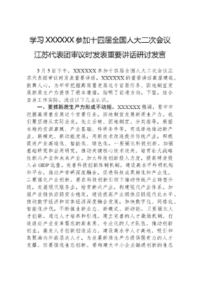 学习XXXXXX参加十四届全国人大二次会议江苏代表团审议时发表重要讲话研讨发言3月5日下午,XXXXXX参加十四届全国人大二次会议江苏代表团审议时发表重要讲话,XXXXXX的重要讲话高屋建瓴、鼓舞人心,为牢牢把握高质量发展这个首要任务、因地制宜发展新质生产力提供了根本遵循,指明了前进方向。下面,结合自身工作实际,浅谈以下几点认识。一、要抓新质生产力形成不动摇。XXXXXX强调,要牢牢把握高质量发展这个首要任务,因地制宜发展新质生产力。我们要坚持从实际出发,先立后破、因地制宜、分类指导,根据本地的资源禀赋、产业基础、科研条件等,有选择地推动新产业、新模式、新动能发展,用新技术改造提升传统产业,积极促进产业高端化、智能化、绿色化。一要强化科技创新。加强基础研究和应用研究,推动关键核心技术攻关,培育壮大战略性新兴产业和未来产业。加大科技创新投入力度,提高研发投入占GDP比重。完善科技创新体制机制,建设高水平科研机构和平台,推动产学研深度融合,促进科技成果转化和产业化。二要强化产业创新。要在科技创新引领下推动传统产业转型升级,发展现代服务业,培育新兴产业,构建现代产业体系。加强产业链供应链安全稳定,建设提高产业链供应链现代化水平。推动数字经济和实体经济深度融合发展,加快数字化、网络化、智能化步伐,不断催生新业态、新模式、新动能。三要强化人才创新。通过人才培养和引进,建立完善的人才激励机制,打造适应产业变革需求的高素质、专业化的人才队伍。推动创新创业,激发人才创新创造活力。建设高水平人才高地,吸引和集聚海内外高层次人才,为发展新质生产力提供强有力的人才支撑。四要强化生态创新。要构建大中小企业融通创新的生态体系,推动大中小企业协同创新、融通发展。支持大型企业搭建创新创业平台,开放创新资源,带动中小企业创新发展。完善中小企业服务体系,提高中小企业创新能力和市场竞争力。加强企业之间的合作与交流,实现资源共享和优势互补,提高整个产业创新能力与竞争力。五要强化制度创新。加强制度建设和法治建设,完善市场经济体制。推动政府职能转变,持续优化营商环境,激发市场经营主体活力。加强知识产权保护,促进创新成果转化应用。完善科技创新法律法规体系,为科技创新和产业创新提供有力的法治保障。二、要抓民生保障不放松。XXXXXX强调,要坚持以人民为中心的发展思想,在发展中稳步提升民生保障水平,引导激励广大群众依靠自己的双手创造幸福生活。我们要忠实践行以人民为中心发展思想,努力使民生改善更得民心、发展成果更惠民生。一要在为民生上再加力。坚持在发展中保障和改善民生,不断提高发展平衡性、协调性和包容性,努力使城市产业水平、财富能级和居民收入实现同步跃升,让现代化建设成果更多更公平地惠及全体百姓。二要在察民情上再加力。发扬四下基层优良作风,聚焦优质教育、医疗、托育、养老等群众最牵挂、最期盼、最关注的事,再小不嫌小、知难不畏难,切实摸清社情民意,了解群众急难愁盼,真正做到既入群众家门,又入群众心门,让工作如春风化雨、润人心田。三要在解民忧上再加力。从最困难的群体入手,从最具体的工作抓起,实实在在做好孩子的抚养教育、年轻人的就业成才、老年人的就医养老等家事国事,全面做好XX、XX等20项民生实事,让人民群众的获得感成色更足、幸福感更可持续、安全感更有保障!三、要抓安全生产不懈怠。XXXXXX强调,要抓好安全生产,进一步做好安全隐患排查,强化预警监测,落实应急措施,保障人民群众生命财产安全。我们要始终坚持人民至上、生命至上、安全第一,以夜不能寐的责任感、如履薄冰的紧迫感、如临深渊的危机感,抓紧抓细抓实各项工作。一要提高政治站位。时刻绷紧安全这根弦,清醒地认识当前面临的风险挑战,始终坚持把人民群众生命财产安全放在首位,进一步压实各方责任、强化工作落实,不断提升安全生产整体水平。二要全面排除隐患。聚焦重点行业领域和风险点位,加强分析研判,找准薄弱环节,落实防范措施,细化分解任务,做实做细网格服务管理,加强督查指导和日常监管,牢牢守住安全生产的底线红线。三要加大宣传力度。多层次多渠道多形式抓宣传教育,及时推送动态消防信息、典型火灾案例,全面提升消防安全宣传教育质效,切实提高广大群众消防安全防范意识和自防自救能力。发言完毕。
