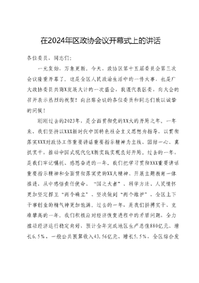 在2024年区政协会议开幕式上的讲话各位委员,同志们:一元复始,万象更新。今天,政协区第十五届委员会第三次会议隆重开幕了。这是全区人民政治生活中的一件大事,也是广大政协委员共商X发展大计的一次盛会,我谨代表区委,向大会的召开表示热烈的祝贺!向出席会议的各位委员和同志们致以诚挚的问候!刚刚过去的2023年,是全面贯彻党的XX大的开局之年。一年来,我们坚持以XXX新时代中国特色社会主义思想为指导,以贯彻落实XXX对政协工作重要讲话重要指示精神为主线,团结一心、真抓实干,推动中国式现代化X新实践实现良好开局。过去的一年,是我们牢记嘱托、感恩奋进的一年。我们把学习贯彻XXX重要讲话重要指示精神和全面贯彻落实党的XX大精神、开展主题教育一体推进,从中感悟责任使命、国之大者、科学方法、人民情怀更加坚定捍卫两个确立、坚决做到两个维护,全区上下干事创业的精气神更加饱满。过去的一年,是我们拼搏实干、克难攀高的一年。我们积极应对经济恢复进程中的矛盾问题,全力推动经济运行稳定向好,预计全年完成地区生产总值880亿元、增长6.5%,一般公共预算收入43.56亿元、增长5.5%,全区综合发展实力稳步提升。过去的一年,是我们破局开新、精彩蝶变的一年。我们聚焦美丽X建设,持续抓配套、优环境,新增公园绿地面积26万平方米,G328南绕城快速化、S411姜高路建成通车,创成省级特色田园乡村3个、美丽乡村6个,出门就是景、转角遇到美成为X人共同的城市印象。过去的一年,是我们砥砺初心、收获幸福的一年。我们持续开展三访三推动,用心用情改善民生福祉,教育、医疗、养老、托育等优质供给不断扩大,全区社会大局保持稳定,广大群众的获得感、幸福感、安全感进一步增强。收获来自和衷共济,发展源于力同心。这些成绩的取得,勠根本在于以XXX同志为核心的党中央坚强领导,根本在于XXX新时代中国特色社会主义思想科学指引,得益于省委、市委的关心和支持,是全区人民众志成城、共同奋斗的结果,也饱含着各级政协组织、广大政协委员的智慧、心血和汗水。一年来,区政协和广大政协委员认真履行政治协商、民主监督、参政议政职能,推动政协工作守正创新、提质增效,为全区高质量发展大局作出了政协贡献。一是服务发展有深度。自觉把政协工作放在发展大局中谋划,围绕现代化产业体系建设、乡村振兴、驻外招商等重点领域,主动谋事、用心干事、协力成事,实现了与中心工作的同频共振。二是为民尽责有温度。始终坚持人民政协为人民,围绕教育、医疗、文化等群众关切,深入开展履职为民助发展专题协商议事活动,推动解决了一批群众关心关切的急难愁盼。三是自身建设有力度。深化党建+品牌建设引导广大政协委员和各界人士集思广益、献智出力,为中国式现代化XX新实践贡献了智慧和力量。在此,我代表中共XX区委,向全区各级政协组织和广大政协委员,向各民主党派、工商联、无党派人士、人民团体和各界人士,表示崇高的敬意和衷心的感谢各位委员、同志们!今年是中华人民共和国和人民政协成立75周年,是全面完成十四五规划的关键之年。刚刚召开的区委十三届六次全会,号召全区上下始终坚持产业为先、城市为基民生为本,激扬步调一致向前进、躬身实干争头名的奋斗豪情,奋力谱写强富美高新X现代化建设新篇章。宏伟蓝图变成美好现实,需要大家闻令而动、齐心协力,需要大家同心同德、同向同行。希望全区各级政协组织和广大政协委员自觉把思想和行动统一到区委决策部署上来,牢牢把握大团结大联合主题,在新的起跑线上步调一致向前进,推动X高质量发展勇立潮头、走在前列。一、步调一致向前进,就是要站稳政治立场,校准进的方向。政协是党的政治组织,旗帜鲜明讲政治是第一位的要求。全区各级政协组织和广大政协委员要牢记嘱托、感恩奋进,始终保持对党绝对忠诚。要坚定政治方向不偏移。把坚持和加强党的领导作为根本政治原则和重大政治责任,深刻理解和把握两个确立的决定性意义,切实增强做到两个维护的思想自觉、政治自觉和行动自觉,始终在政治立场、政治方向、政治原则、政治道路上同以XXX同志为核心的党中央保持高度一致。要坚守思想根基不动摇。始终坚持用XXX新时代中国特色社会主义思想凝心铸魂,用XXXXXX关于人民政协工作的重要论述指导实践,把团结民主融入政协履职的方方面面,切实肩负起落实下去、凝聚起来的政治责任。要加强党的建设不停步。时刻牢记政协组织的政治属性、委员的政治身份、协商的政治责任,持续深化党建+工作品牌,确保党委中心工作推进到哪里,政协履职就聚焦到哪里、跟进到哪里,做到区委有号召、政协有响应、委员有行动,上下一心共同奋进新的征程。二、步调一致向前进,就是要矢志走在前列,澎湃进的动能。服务发展是政协履职的主旋律。全区各级政协组织和广大政协委员要自觉围绕中心、服务大局