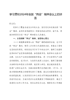 学习贯彻2024年全国两会精神会议上的讲话同志们:刚参与了覆盖全省及全市的大会,旨在传达和实施全国两会精神,此项任务现被视为一项紧迫的政治责任。接下来,将就如何落实全国两会精神提出几点建议。一、全面理解两会精神,紧握核心要义(一)深度解读领导人在两会期间的指导言论。在今年的两会期间,领导人多次参与代表团的讨论,并提出了富有远见的指导意见。特别是在3月5日下午的会议中,强调了把握科技革命和产业变革的新机遇,加快创新步伐,培养和壮大新兴产业群,为未来产业的发展提前做好准备,进一步完善现代产业体系的重要性。在3月6日,与各界代表深入交流时,强调了围绕重大战略任务和经济工作部署,进行深入研究,提出建设性意见,促进广泛的社会共识,为推动国家现代化贡献力量。3月7日,对新兴领域战略能力的重要性进行了强调,指出其对国家经济社会的高质量发展,以及国家安全和主动应对军事挑战的重要性。这些指导性言论,为地方经济社会发展提供了明确的指引,确立了前进的方向和工作方法,我们必须全力以赴,确保各项工作都能达到新的高度和水平。(二)深刻理解政府工作报告的深层含义。3月5日,政府首脑在工作报告中全面总结了过去一年的成就,并为2024年制定了十项主要工作目标,包括推动现代产业体系建设,加速新型生产力的发展;深化科教兴国战略,加强高质量发展的基础;扩大国内市场需求,促进经济的良性循环;坚持深化改革,提升发展的内生动力;开展高水平的对外开放,实现互利共赢;在发展与安全之间找到平衡,有效预防和解决重大风险;持续关注农业、农村和农民工作,全面推进乡村振兴;促进城乡一体化和区域协调发展,优化经济结构;加强生态文明建设,推动绿色低碳发展;切实保障和改善人民生活,加强和创新社会治理。政府工作报告为新发展格局的构建和高质量发展勾画了蓝图。在党中央的坚强领导下,我们应深刻理解工作报告的核心精神,激发斗志,统一思想和行动,为推进国家现代化和实现民族伟大复兴不懈努力。二、全面落实两会精神,地方工作有序推进在地方层面,积极响应全国两会精神,通过具体措施推动经济与社会的全面进步,体现了对会议精神的深刻理解与有效执行。以下是几个关键领域的工作重点:(一)提升产业效能,夯实发展基础。加快工业领域的高质量发展。开展工业高质量发展攻坚年活动,加快建设××高端厨文可居文库——海量学习资料,手机电脑下载www.wenkeju.com具、纺织服装、灯饰照明等3个轻工产业园。完善处级领导干部联系服务企业,按照《××县2024年县领导联系重大项目一览表》落实领导责任,强化对重大项目的精准服务和指导,切实推动项目落地建设投产。二是做优做特现代农业。落实田长制,推进撂荒地复耕复种,全力抓好春耕工作。加快实现乡村振兴产业园(一期)××产业园年内开园。实施田长制管理,促进荒废土地的再利用,全面加强春耕生产。加速乡村振兴产业园(一期)的建设与开放,推动特色农产品的种植与深加工,利用品牌效应带动产业升级。活化现代服务业。扩大产业规模。推动商贸城及家装建材市场的发展壮大,建立专业交易平台,通过精心挑选的16个旅游项目,进行品质提升,以达到更高的标准。(二)培育新的经济增长点,构建发展优势。一是加快枢纽经济发展。推进高速公路等基础设施建设,以物流冷链、建材交易市场等项目为重点,快速发展商贸物流体系。二是推动生态经济发展。重点关注养殖业污染治理和乡村生活污水处理,升级重点区域的污水处理设施,确保水质符合标准。三是加大项目经济推进力度。设定目标,在年内启动100个重大项目,完成50个项目的建设,并实现超过50亿元的投资完成。四是扩展对外经济交流通过专注于主导产业的布局,实施委托招商和驻点招商策略,力争签约项目数量超过120个,引进世界500强企业项目10个以上,文可居文库——海量学习资料,手机电脑下载www.wenkeju.com确保资金到位达50亿元。(三)加速城乡融合,巩固发展基础。一是巩固脱贫攻坚成果。实施四个不摘政策,建立防返贫动态监测与帮扶机制。二是全面推进乡村振兴战略。强化粮食安全和防范规模性返贫的底线,有序推进乡村发展、建设与治理工作。三是提升城市品质推进人口城镇化、城市扩容战略,持续改善城市环境,加快城市基础设施建设。(四)满足民众期待,提升发展质量。一是深化教育质量提升工程。确保新建幼儿园及中小学校按计划建设并投入使用。二是提高卫生健康服务水平。推进医疗机构的建设与升级,加快关键健康项目的实施。三是加强安全生产保障。在高危行业实施安全生产责任险,提高企业的安全管理与应急响应能力。三、提升组织实力,确保工作高效执行一要加强政治导向的坚定性。始终将政治建设置于核心位置持续提升政治敏锐性、洞察力及执行力,加强政治意识、自信心以及对党的绝对忠诚。
