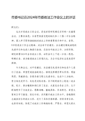 市委书记在2024年市委政法工作会议上的讲话同志们:这次市委政法工作会议,是经市委研究确定召开的一次重要会议。主要任务是:全面贯彻落实党的XX大和二十届二中全会精神,深入学习贯彻XXXXXX对政法工作的重要指示和中央、省委、X市委政法工作会议精神,对全市平安建设、法治建设领域涌现的先进单位和先进人物进行表扬,总结全市政法工作,分析形势,研究部署2024年全市政法工作。动员全市上下进一步统一思想,明确任务,奋力推进政法工作现代化,为全市经济社会发展筑牢保障。今天的会议,对平安建设、法治建设先进单位和先进个人进行了表扬,希望受到表扬的同志,继续发挥模范带头作用,再接再厉,再建新功;各级各部门要以先进单位、先进个人为标杆,努力向先进学习,向先进对标对表,在不同的岗位上创造一流业绩。刚才,部分镇街和部门作了发言,大家结合各自工作,从不同角度作了交流发言,思路清晰、措施具体、各有特色,希望大家相互学习借鉴、取长补短、共同提升政法工作水平。孙晓强同志就抓好全年政法工作,进行了具体安排部署,讲得非常全面,也非常细致,体现了对政法工作的高标准、严要求,希望大家认真抓好落实,切实将各项工作抓紧抓实抓出成效。下面,根据市委研究的意见,就做好我市政法工作,我讲几点意见:一、强化政治担当,牢牢把握新时代政法工作的新使命、新要求近年来,全市政法系统、政法战线始终坚持以XXX新时代中国特色社会主义思想为指导,坚决贯彻党中央决策部署和省委、X市委和X市委工作要求,谋划推进政法工作现代化,深入推进平安X、法治X和政法队伍建设,政法工作在X乃至全省保持先进位次,为X经济社会发展提供了有力法治支撑和安全保障。在安全稳定方面,高质量完成全国两会等重大活动维稳安保任务,有力有效保障了国家政治安全和社会稳定大局。全国两会维稳安保期间,工作指挥部、联合值班人员、督导组人员以及驻京工作人员高效联动,始终保持高度紧张、高速运转、快速反应的工作状态,全面排查隐患、整治问题、防范风险,及时果断处理了一些突发情况和事件,以实际行动实现了六个不发生、三个不出事,为全国两会胜利召开营造了良好的安全稳定环境。特别是建立揭榜挂帅工作机制,推进治重化积,化解了一批重点信访积案,进京、赴省上访量大幅下降。在平安建设方面,打击违法犯罪、反电信诈骗、扫黑除恶斗争等方面战果丰硕,有力文可居文库——海量学习资料,手机电脑均可下载www.wenkeju.com保障了人民群众生命财产安全。我市入选平安X创建示范活动中表现突出的县(市、区),X路街道、X网格员刘X分别入选表现突出的街道、网格员。在社会治理方面,以实战、实用、实效为原则建立三微治理、平安指数体系,创新一站式矛盾纠纷多元化解机制,推进社会治理工作。工作做法得到省委常委、政法委书记X同志批示肯定,X市委书记X同志两次予以批示肯定。在法治建设方面,市法学会推选星期五法治服务日制度,依托首席法律咨询专家团队,常态化开展法治体检,组织法治智库送法,助力民营企业高质量发展。首席法律咨询专家经验做法在全省首席法律咨询专家工作推进会上作典型发言。建立政法牵头的未成年人保护联盟,高质量建成未成年人保护研学基地,推动大白哥哥形成了X政法的响亮品牌。法院、检察院、公安局、司法局围绕打击违法犯罪、知识产权保护、生态环境案件诉讼、行政执法监督等领域,取得了一系列工作成效,政法单位齐心协力,锐意进取的劲头越来越充足。在队伍建设方面,坚持和加强党对政法工作的绝对领导,政法单位深入贯彻落实《中国共产党政法工作条例》,加强执法监督,开展青年理论学习、政法业务讲堂和政治培训班,推动党管政法走深走实。通过巩固提升政法队伍教育整顿成效,提升了业务素能,强化了为民服务的本领,文可居文库——海量学习资料,手机电脑均可下载www.wenkeju.com展现了政法队伍的良好精神风貌。这些工作成绩,一是得益于始终加强党对政法工作的绝对领导。在市委统一领导下,持续加强对政法工作的谋划、协调、推进力度。市委常委会多次研究部署政法重点工作,市委政法委充分发挥牵头协调作用,无论是平安建设工作领导小组,还是依法治市委员会,都发挥了充分的组织、推动作用,保障了各项工作前行有力、推进有方、落实有效。二是得益于各级各部门和全社会的大力支持。各级各部门自觉担负起在信访维稳、基层社会治理等工作方面的职责,抽出精干力量、拿出极大精力,对全市平安建设和法治建设给予极大支持和推动,把全市上下推进平安和法治建设的力量拧成了一股绳,凝聚了齐抓共管、群策群力的强大合力。三是得益于政法单位辛苦付出和担当实干。针对市域社会治理的需求,创新建立务实有用的工作机制,推动平安建设各项工作务实见效。市委政法委牵头建立疑难案件和重点信访治安、刑事案件等一系列会商研判制