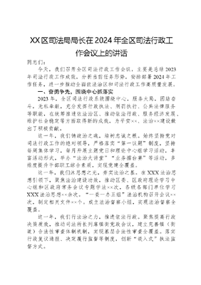 XX区司法局局长在2024年全区司法行政工作会议上的讲话同志们:今天,我们召开全区司法行政工作会议,主要是总结2023年司法行政工作成效,分析当前任务形势,安排部署2024年工作任务,进一步推动全面依法治区和司法行政工作高质量发展。一、奋勇争先,围绕中心抓落实2023年,全区司法行政系统围绕中心,服务大局,团结奋斗,无私奉献,充分发挥行政执法、刑罚执行、公共法律服务等职能,在统筹推进依法治区、推动依法行政、服务经济发展、维护社会稳定等方面取得新的成效,为平安××、法治××建设做出了积极贡献。这一年,我们铸政治之魂,培树忠诚之根。始终坚持党对司法行政工作的绝对领导,严格落实第一议题制度,坚持每周集体学习,每月开展主题党日和理论中心组学习活动,丰富活动形式,举办法治大讲堂业务擂台赛等活动,多维度提升干部职工综合素质,实现党建全覆盖。这一年,我们沐思想之光,夯实法治之基。在XXX法治思想引领下,聚焦法治建设功效,推动区委、区政府理论学习中心组和区政府常务会议专题学法××次,各级各部门单位学习XXX法治思想××余次。一委一办五组法治机构召开会议××次,制定相关文件××个。成立法治督察小组,实现法治督察全覆盖。这一年,我们行法治之力,推进依法行政。聚焦提高行政决策质效,推动司法所长列席镇街党政会议,建立完善镇(街道)合法性审查体制机制,实现基层合法性审查全覆盖。落实行政复议通报、决定履行监督等制度,创新嵌入式执法监督方式。这一年,我们系为民之情,优化法律服务。持续优化法治化营商环境,建立靶向性涉企法治服务机制,市场主体满意率不断提升。搭建矛盾纠纷共享调解平台,实现重点领域调解组织全覆盖。健全法律援助联动工作机制,创新预约公证、绿色继承、云服务等公证服务举措。创新法治公交沉浸式宣传模式,全年开展各类法治宣传活动××余场。建成智慧矫正中心,推行行为矫正+心理矫治管理模式,探索司法所+队建制改革路径。这一年,我们绘事业之色,展现工作底色。先后争取省、市工作现场会在我区举办。二、直面问题,找准差距促提升2023年,虽然我们取得了一些成绩和成效,但是与上级工作标准要求和兄弟县区相比,与广大群众对新时期法治新需求相比,还存在一些问题和不足。一是法治建设成效不高。基层法治建设工作开展不均衡,一委一办三组法治机构运行效能不高,部分镇街对合法性审查的重视程度不足,基层法治建设工作机制仍需进一步完善。二是专业化法治人才不足。面对行政复议应诉、合法性审查等工作下沉,基层司法所人员力量薄弱,镇(街道)法律法治人才数量不足,法律服务工作者依法依规执业能力有待提升。三是创新意识不强。法治建设和司法行政工作改革创新力度不大,工作创新、特色培育、亮点孵化、典型总结能力仍有欠缺。全系统要直面工作中存在的问题不足,进一步强化学习意识、创新能力、进取精神,补短板、强弱项,推动全面依法治区和司法行政工作高质量开展。三、昂扬奋进,求实创新谱新篇旧岁已展千重锦,新年再进百尺竿。2024年是中华人民共和国成立75周年,是实施十四五规划的关键之年。全区司法行政系统要坚持以XXX新时代中国特色社会主义思想为指导,全面贯彻落实党的XX大和二十届二中全会精神,深学笃用XXX法治思想,紧扣司法行政一个统抓、五大职能,着力文可居文库——海量学习资料,手机电脑均可下载www.wenkeju.com推动法治建设和司法行政工作高质量发展。下面,我代表局党组,就做好2024年度全面依法治区和司法行政工作,强调以下几点。(一)坚定政治方向,树立司法行政工作新理念。一是要坚定政治方向。司法行政机关是政法机关的组成部分,是政府的重要职能部门,是保障国家政权安全、社会大局稳定的重要力量,必须置于党的绝对领导之下,必须在思想和行动上同以XXX同志为核心的党中央保持高度一致。要教育引导广大司法行政干部职工和法律服务工作者进一步坚定政治方向,树牢四个意识,坚定四个自信,做到两个维护,毫不动摇坚持党的绝对领导这一根本原则。二要坚持法治原则。统筹推进全面依法治区和法治建设是我们当前重要的一项工作任务,全区司法行政系统要进一步增强法治意识,全体干部职工特别是领导干部要提高运用法治思维和法治方式深化改革、推动发展、化解矛盾、维护稳定的能力,在全社会积极营造崇尚法治、弘扬法治、践行法治的良好氛围。三要坚持担当作为。担当是态度,作为是能力。全区司法行政系统要大力弘扬紧盯目标勇于担当的敬业精神,着力营造凝神聚力狠抓落实的优良作风,推动司法行政工作改革创新发展。四要坚持法治为民。人民性是司法行政工作的基本属性。司法行政工作从某种意义上讲就是宣传群众、保护群众、服务群众的工作。全区司法行政系统要进一步统一思想,毫不动摇坚持以人民为中心的根本立场,充分尊重