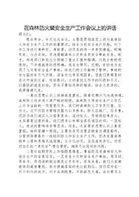 在森林防火暨安全生产工作会议上的讲话同志们:现在开会。今天这次会议,主要是贯彻落实上级对森林防火和安全生产工作的部署要求,结合当前安全生产形势,对下步工作进行再研究、再部署,动员各级进一步夯实措施、明确责任、力求实效,坚决遏制森林火灾和各类安全事故发生。刚才,相关部门和同志分别做了重点汇报和强调,问题分析的很透彻,下步措施讲的很明确,我完全赞同。近期,有的地方出现了火灾等安全生产事故,给我们的工作敲响了警钟。事故的发生固然有天气回暖、设备老化等客观因素,但我们更需要的是从中深刻反省、吸取教训,主动查找工作中的问题和不足,以最快的速度补救,坚决不要犯同样的错误。结合大家讲的,我再强调几点。一要在思想认识上保持高度重视。随着近期天气快速转暖,森林防火逐步进入最严峻的时段,森林防火等安全生产工作已上升为当前的一项重要任务。我们的森林防火工作责任重、压力大,这不仅因为管辖范围内山多林多,防火区域广、任务重,还因为我们城区人口密集复杂、流动性大,导致稳控难度大。尤其需要注意的是,我们很多山林都坐落在城区内部,一旦起火,造成的影响将非常恶劣。对此,大家要在思想认识上高度重视,始终紧绷一根线,主要负责同志要坚持亲自调度指挥,分管领导要靠在一线组织防火和安全生产工作,坚决克服麻痹侥幸心理和畏难厌战情绪,全方位动员,层层落实责任,切实把自己的责任田管住管好,确保不出现任何问题。二要在前期预防上加强隐患排查。事前防范是森林防火和安全生产的首要任务,一旦发生火灾和安全生产事故,再及时、再有力、再迅速的救治都是亡羊补牢。总体来看,我们大家都能做到高度重视,相关措施落实的也比较到位。但仍旧存在一些不到位的地方。对于各类隐患,不能疏忽大意,会后要马上行动起来,对关键部位和重点区域反复进行排查,发现问题立即整改,决不能留死角。对发现的一些不能及时解决的隐患,要及时汇总上报。同时,要加强预案演练。相关部门要尽快制定完善防火预案和意见,从发现、报警、组织救治、善后处理、后勤保障等各个环节,都做到责任分工明确,措施要求具体。各责任区域也要结合自身实际制定实施意见和预案,对日常防火、重点敏感时期防火和安全生产处置等方面,分别制定有针对性的方案措施。所有领导干部都要高度负责,切实担当起责任,抓好重点部位监管排查,以最大力度杜绝森林火灾和安全生产事故的发生。三是在工作保障上聚焦聚点发力。要高标准打造森林消防专业队伍和护林员队伍,配齐配强人员,在保证数量的前提下,更要把队伍的质量抓好。要注重从公安特警、城管队员中组织筛选部分专业人员,在日常训练中增加防火演练等内容,有效提升火灾现场处置能力和应急队伍快速反应能力,确保在关键时刻能够拉得出、冲得上,发挥突击队作用。同时,要加强防火物资储备。各责任区域要马上对储备的防火物资进行全面检查,物资不足的必须补充到位,损坏的设备、老化的部件要及时进行维修更新。四要在考核督促上坚决从严从紧。目前,我们已经将森林防火和安全生产工作纳入整体考核体系,相关部门要切实承担起具体考核任务,实事求是、客观公正地考核,该一票否决的坚决予以一票否决。对处置反应迅速,措施得力有效,做出突出贡献的先进集体和个人,按照有关规定给予表彰。对隐患排查不彻底,导致发生火灾和安全生产事故的检查人和责任人要实行问责,有失职、渎职行为的,要依据相关规定给予处罚、行政处分;构成犯罪的,依法追究刑事责任。同志们,森林防火和安全生产工作任务艰巨,责任重大。大家要克服麻痹思想和侥幸心理,精心做好预防工作,务必把困难考虑得更多一些,把工作安排得更细一些,把措施落实得文可居文库——海量学习资料,手机电脑均可下载www.wenkeju.com更扎实一些,确保不出问题,不发生人员伤亡事件,全力保护好森林资源和人民生命财产安全。今天的会议到此结束,散会。文可居文库——海量学习资料,手机电脑均可下载www.wenkeju.com